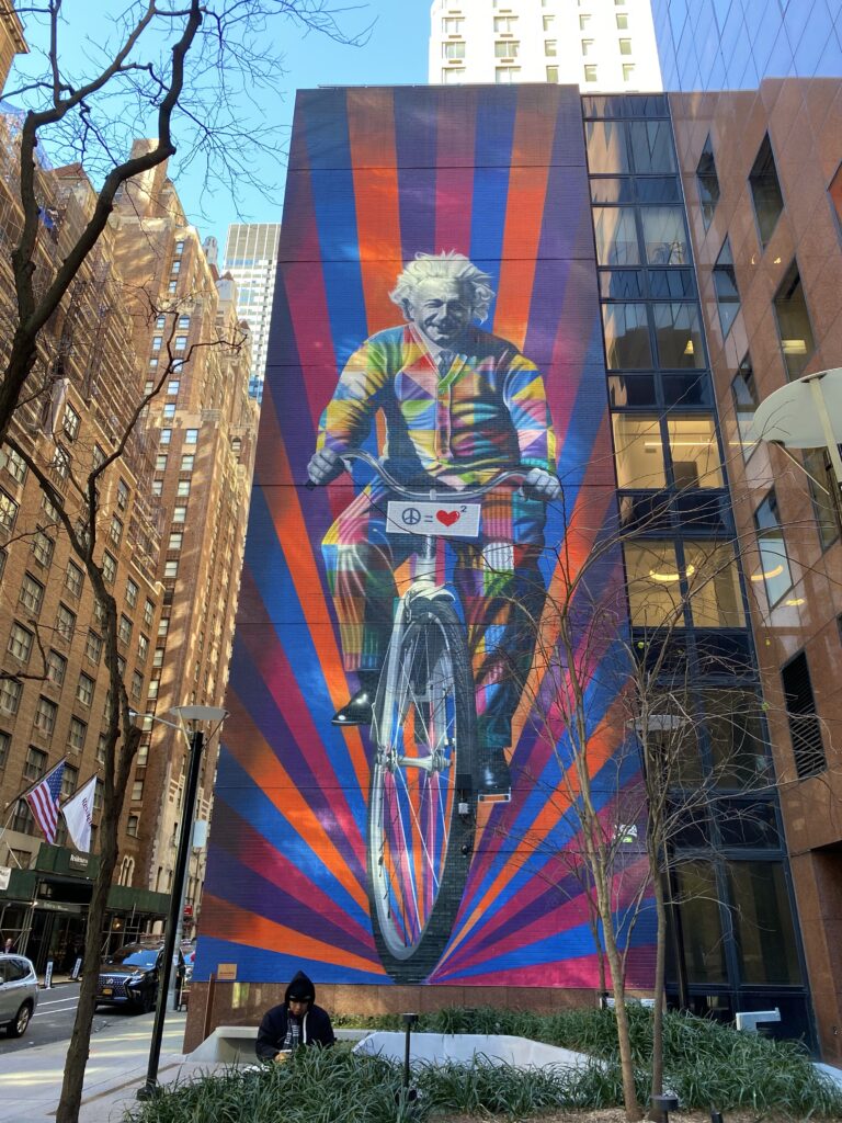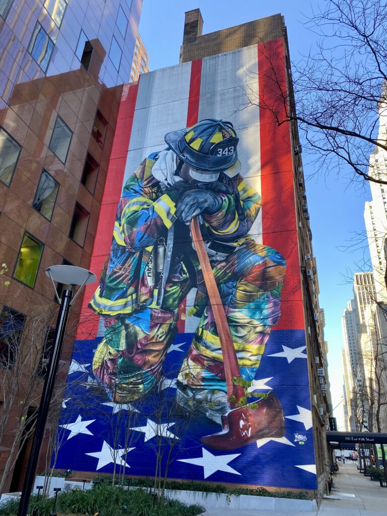 J’ai envie d’aller voir deux fresques murales géantes de l’artiste brésilien Eduardo Kobra. Elles sont un peu excentrées sur la 3ème avenue mais nos pieds sont rodés, on n’est plus à 2 km près ! Cet artiste a signé plusieurs œuvres de street art à New York. Celle en hommage aux 343 pompiers de New York décédés dans les attentats du 11 septembre 2001 au World Trade center est inspirée d’une photo prise ce jour-là. Elle mesure 7 étages.