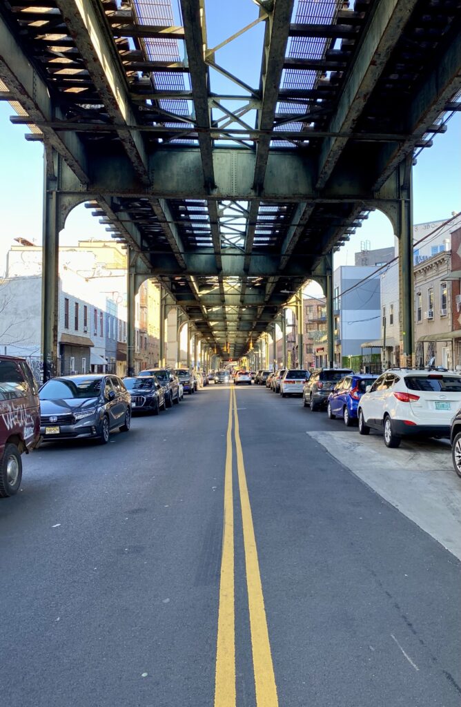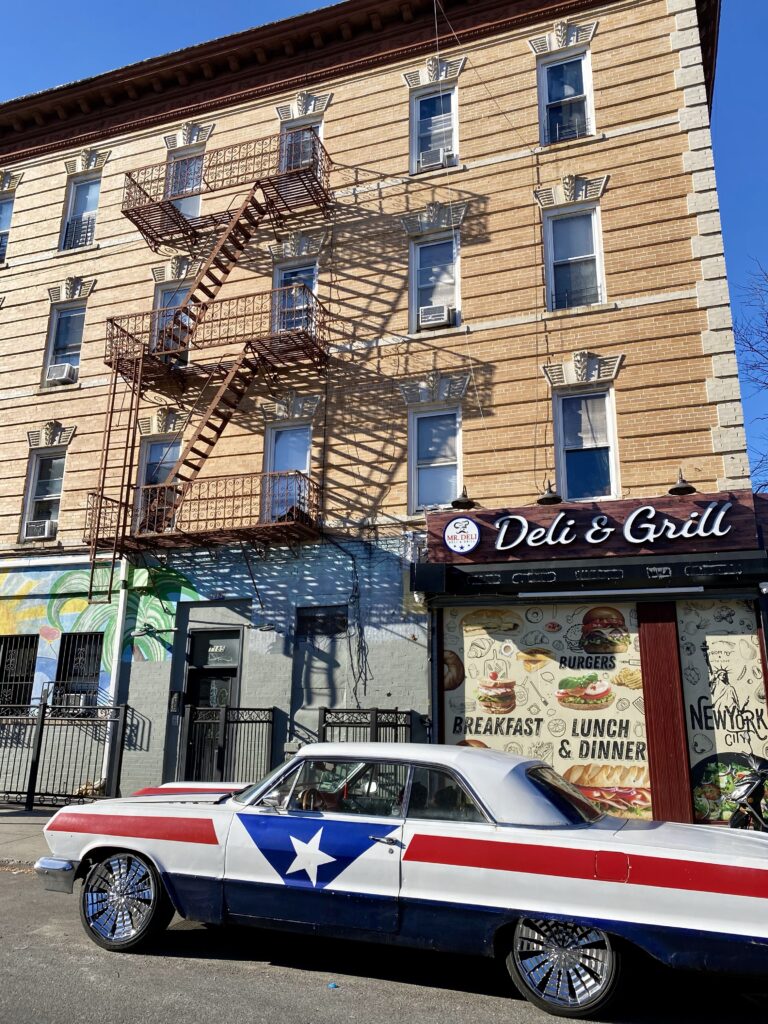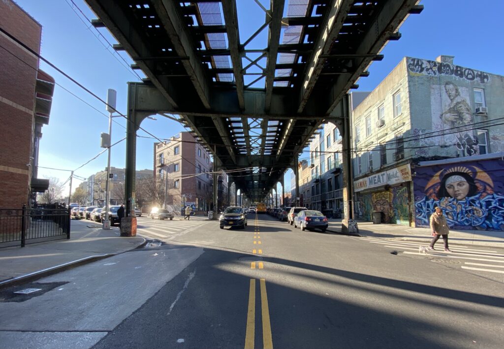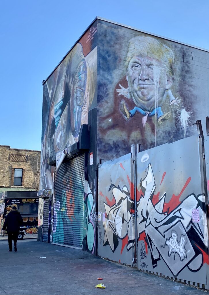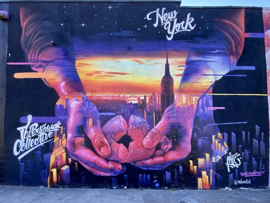 Nous repartons vers le Rockfeller center pour prendre le métro en direction de Brooklyn. On en a bien pour 30 minutes de métro, de quoi se reposer avant d’arpenter les rues de Bushwick à la recherche d’autres fresques murales. Mais avant, on reprend des forces avec de bons tacos et burritos dans un authentique resto-épicerie mexicain : Plaza Ortega. Le resto, frôlé par les rails du métro aérien, est situé sur Myrtle avenue.