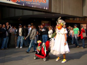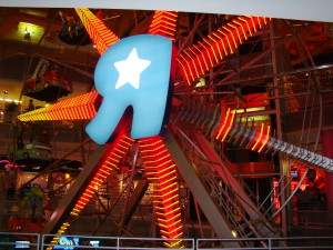En soirée, c’est Times Square que nous découvrons tout ébahis ! C’est là que l’on ressent le plus la démesure américaine. Ca brille, ça clignote, c’est bruyant, c’est grand, c’est haut… On en prend plein les yeux ! Et alors quand on entre au magasin Toys’r us, on pense aux enfants restés en France parce que s’ils voyaient ça on ne pourrait plus en sortir : des dinosaures géants, l’Empire state building en légos… et une grande roue dans l’entrée ! Dans la rue, quelques énergumènes viennent sur Times square pour se faire remarquer, comme le fameux nacked cow-boy, pas mal pour son âge 😉