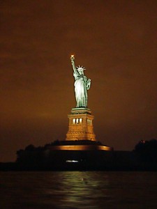 Sur Times Square, on nous avait donné une pub pour une croisière autour de Manhattan. Comme on avait choisi de ne pas faire la croisière pour se rendre au pied de la Statue de la Liberté (on ne peut plus monter dedans depuis le 11 septembre, donc on ne voyait pas l’intérêt), et qu’on n’avait pas le temps de prendre le ferry pour Staten Island, on a opté pour cette formule afin de de voir de plus près cette statue emblèmatique. Alors pour terminer cette belle journée, on a embarqué parmi beaucoup de touristes américains qui ont tous acheté le gobelet souvenir (devait faire 1 litre le gobelet !) qui était rempli ensuite à volonté sur le bateau pendant la promenade. Avec toutes ces tentations qui poussent à la consommation, on s’étonne moins du nombre d’obèses croisés dans les rues ! En tous cas, la croisière était très sympa même s’il ne faisait pas chaud ! On a enfin pu s’approcher de Miss Liberty. Et New York la nuit, c’est encore plus beau et impressionnant que le jour.
