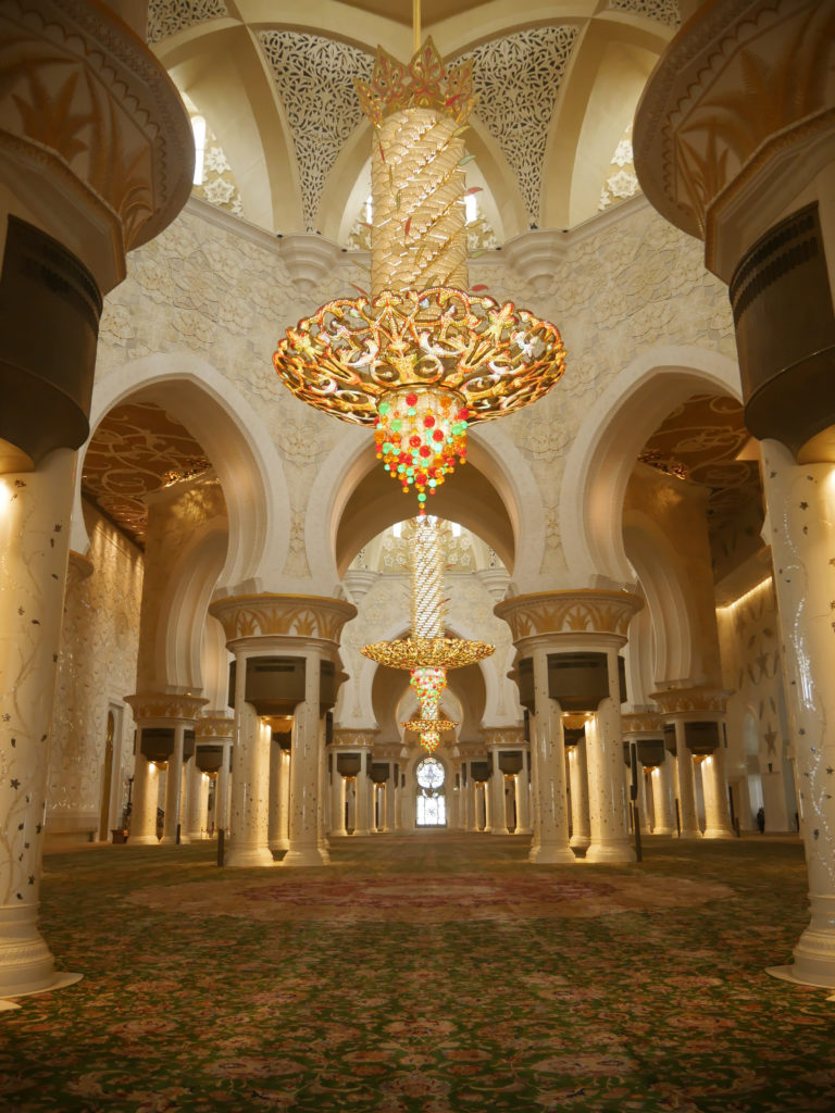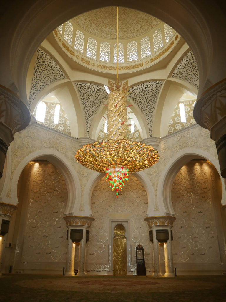 Pour vous donner une idée de grandeur, sachez que la mosquée fait plus de 22 400 m², qu’elle peut accueillir 40 000 fidèles en même temps, qu’elle compte 82 dômes dont le plus grand mesure 70 mètres de haut sur 35 de large, qu’elle abrite le tapis de facture artisanale le plus grand du monde (1 an pour le tisser entièrement !) et le plus grand lustre du monde… Bah oui, je vous avais prévenus.
