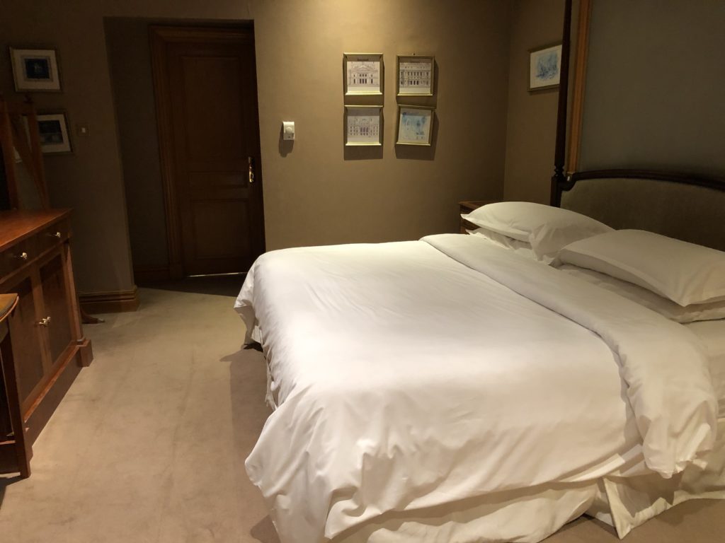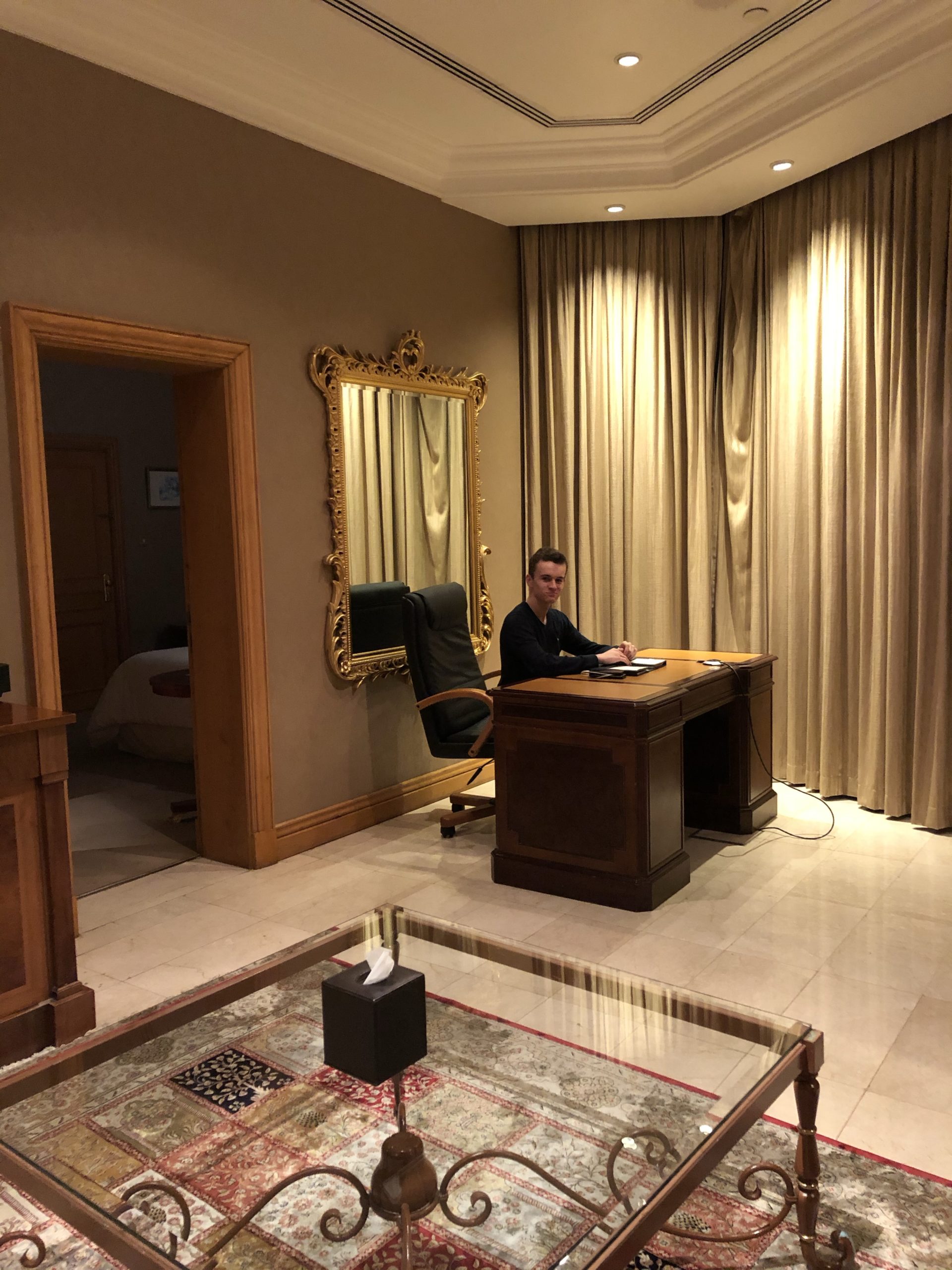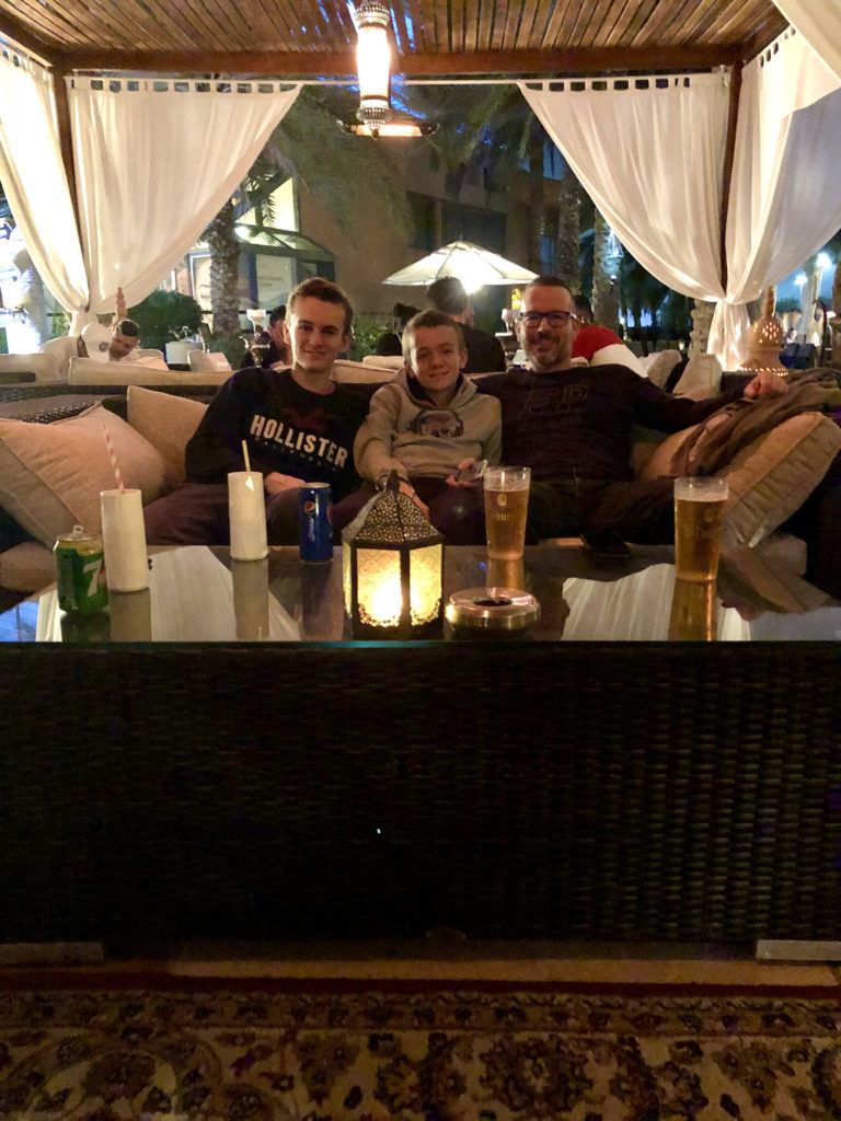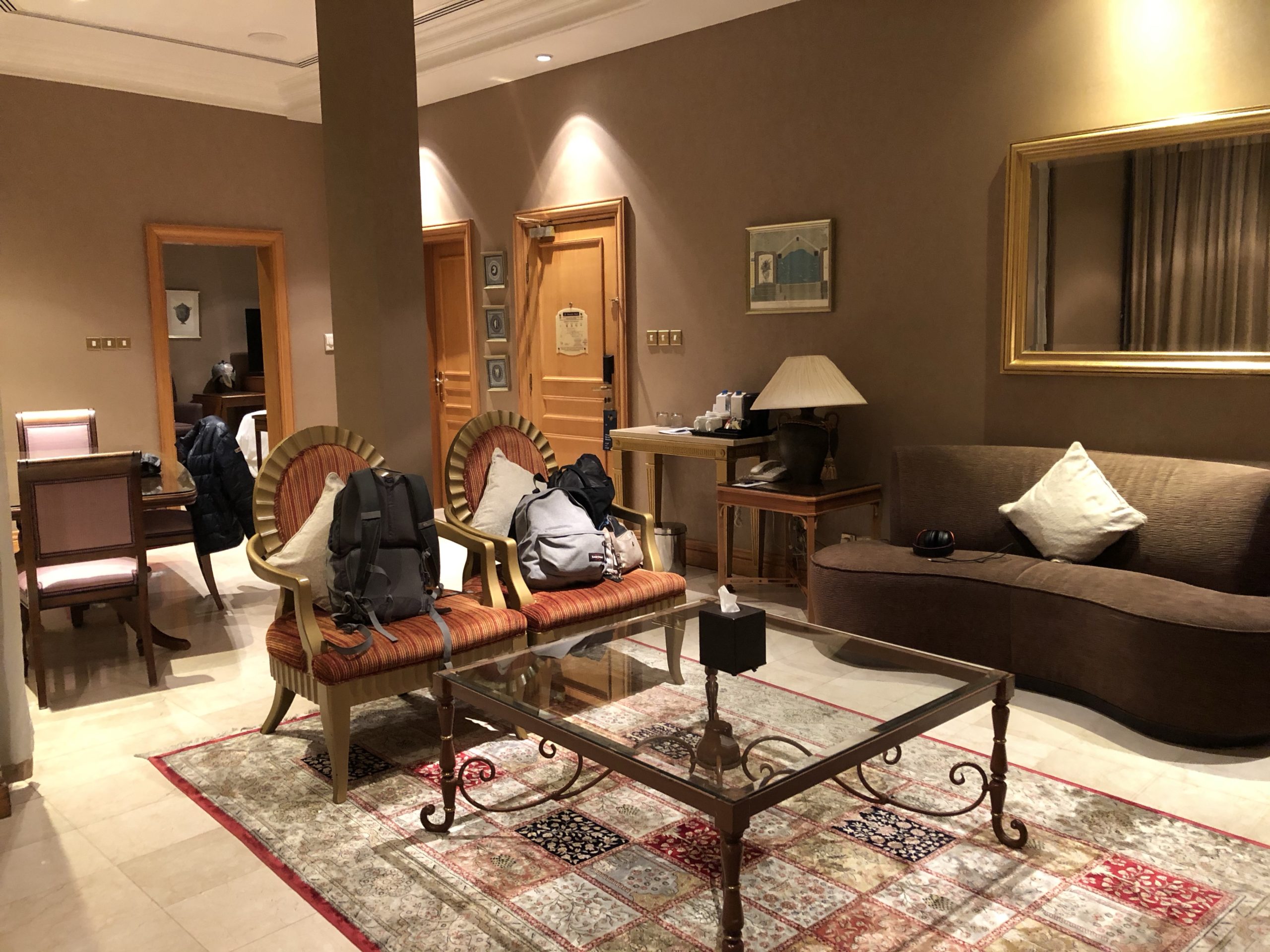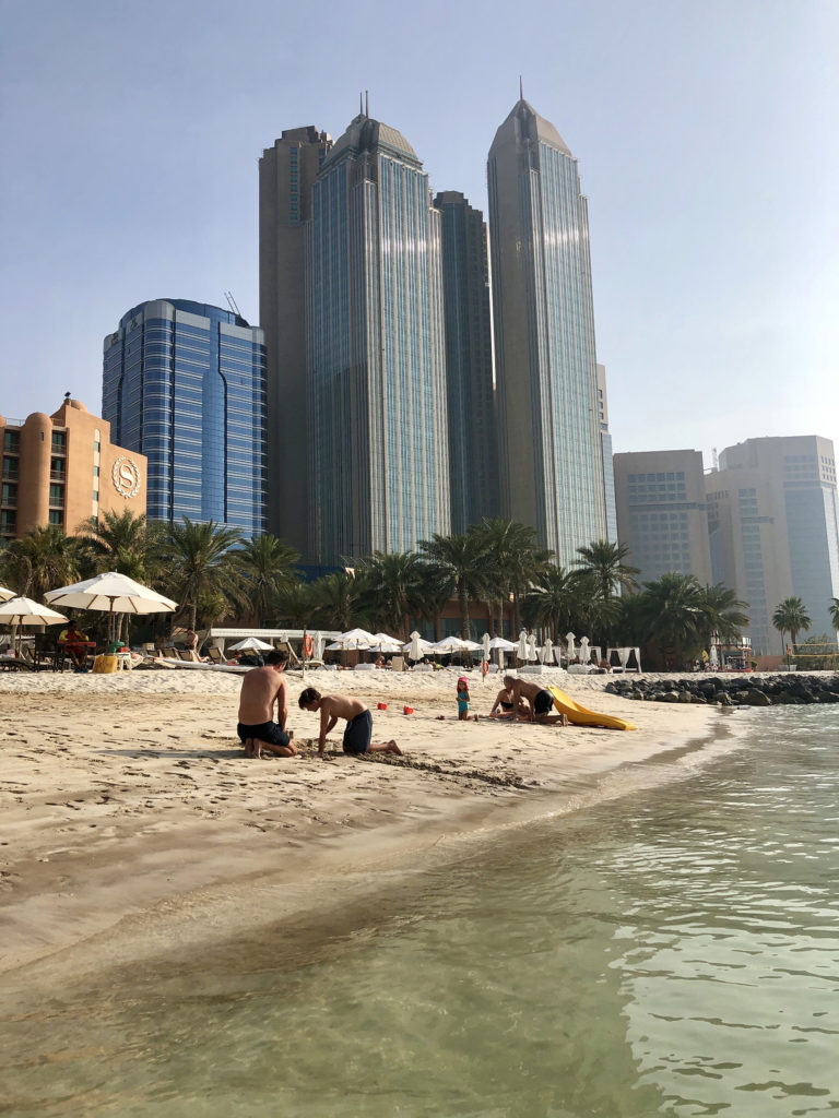 Nous sommes arrivés hier soir à l’aéroport d’Abu Dhabi et avons rejoint notre hôtel au volant de notre Ford Explorer. J’ai profité d’une promo pour réserver au Sheraton sur la Corniche. J’avais prévu 2 chambres classiques mais on se retrouve avec une suite immense sans supplément. Cool !