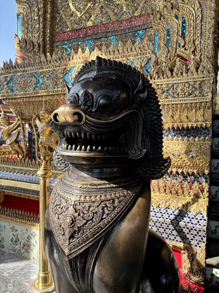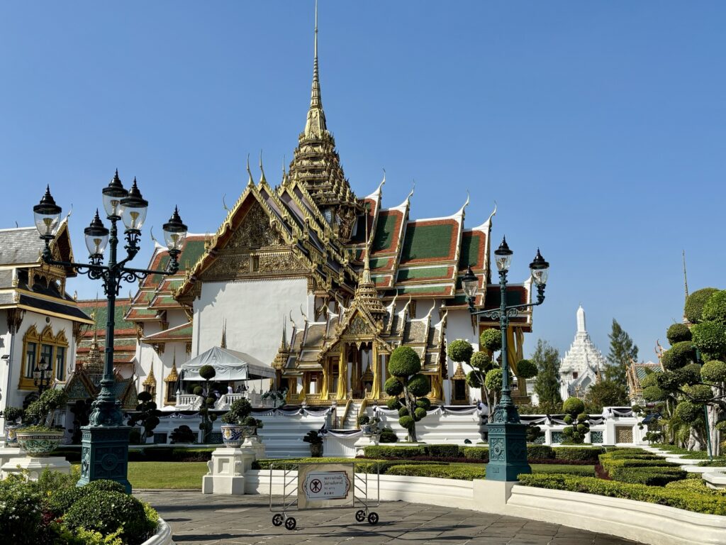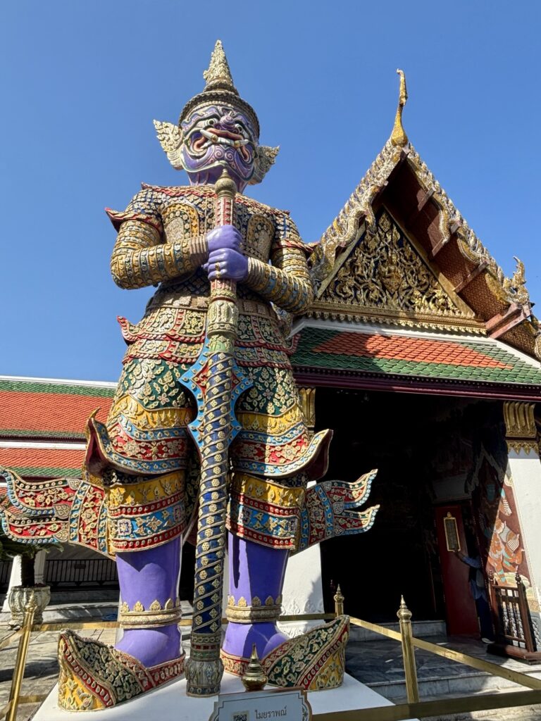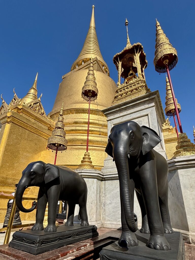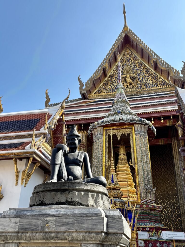 Construit par le roi Rama 1er en 1782, le Palais royal s’est vu agrémenter de nouveaux bâtiments au fil des règnes successifs. Outre la résidence royale et la salle du trône, il abrite des bureaux gouvernementaux et le Wat Phra Kaeo, le temple du Bouddha d’émeraude le plus vénéré de Thaïlande. C’est immense et superbe ! Il nous faut bien 3 heures pour visiter les différents palais, les pavillons, le cloitre et le temple du Bouddha d’émeraude dans ses habits d’hiver (le roi change sa parure à chaque saison).