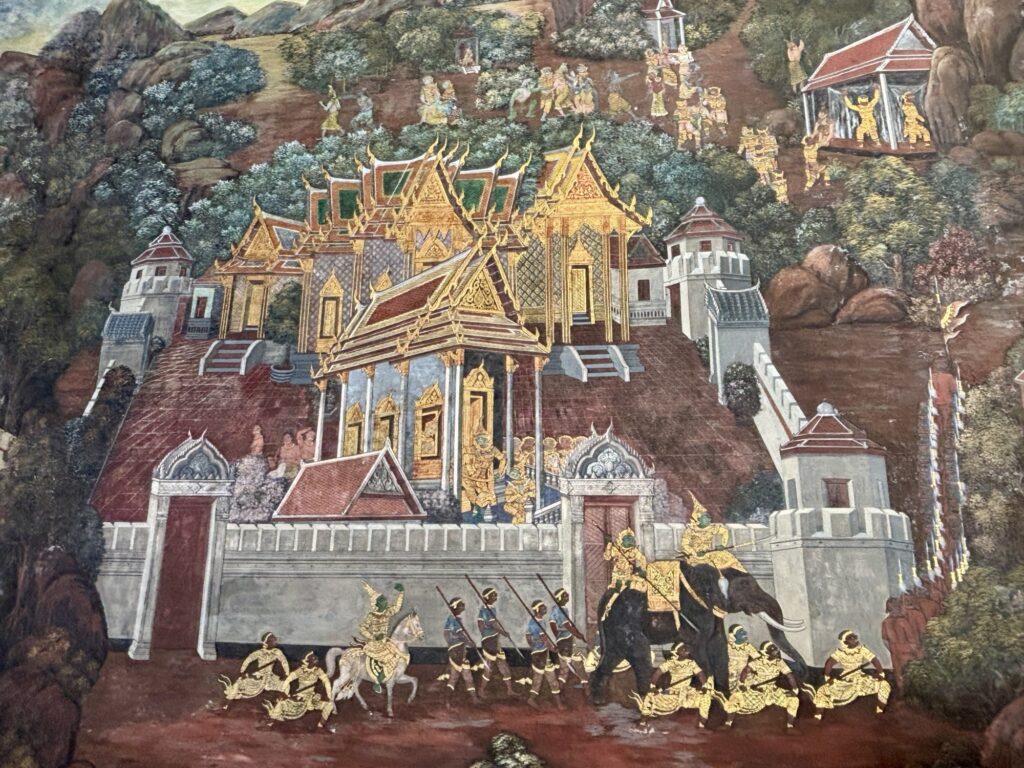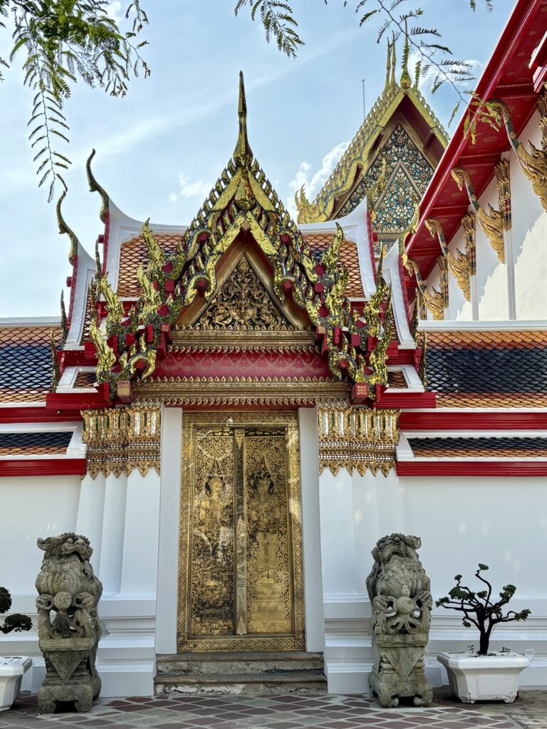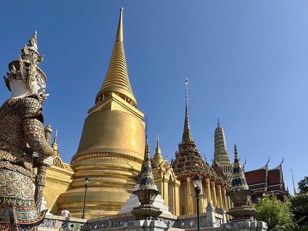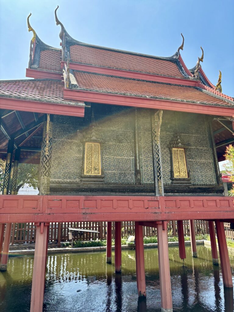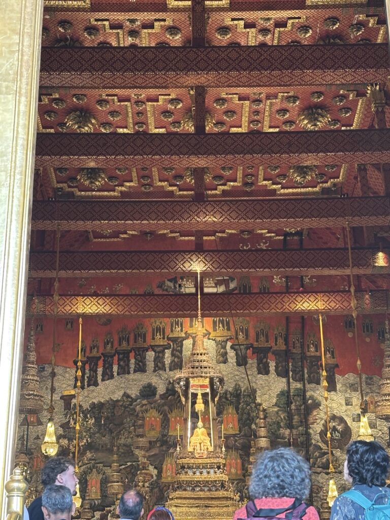 Construit par le roi Rama 1er en 1782, le Palais royal s’est vu agrémenter de nouveaux bâtiments au fil des règnes successifs. Outre la résidence royale et la salle du trône, il abrite des bureaux gouvernementaux et le Wat Phra Kaeo, le temple du Bouddha d’émeraude le plus vénéré de Thaïlande. C’est immense et superbe ! Il nous faut bien 3 heures pour visiter les différents palais, les pavillons, le cloitre et le temple du Bouddha d’émeraude dans ses habits d’hiver (le roi change sa parure à chaque saison).
