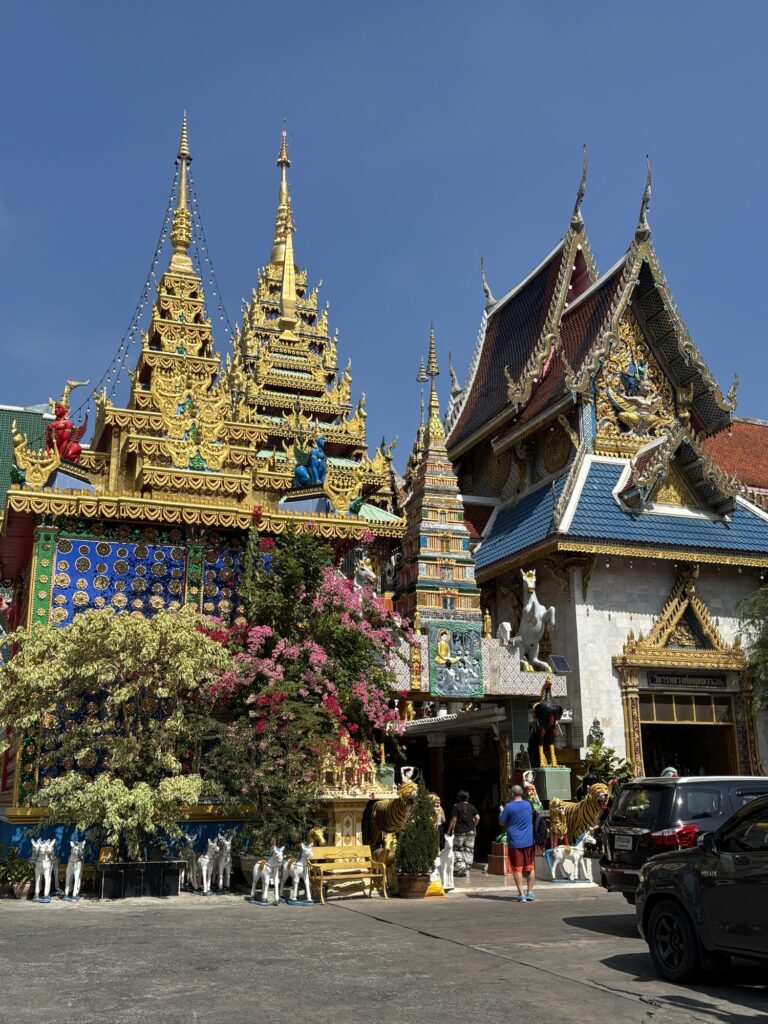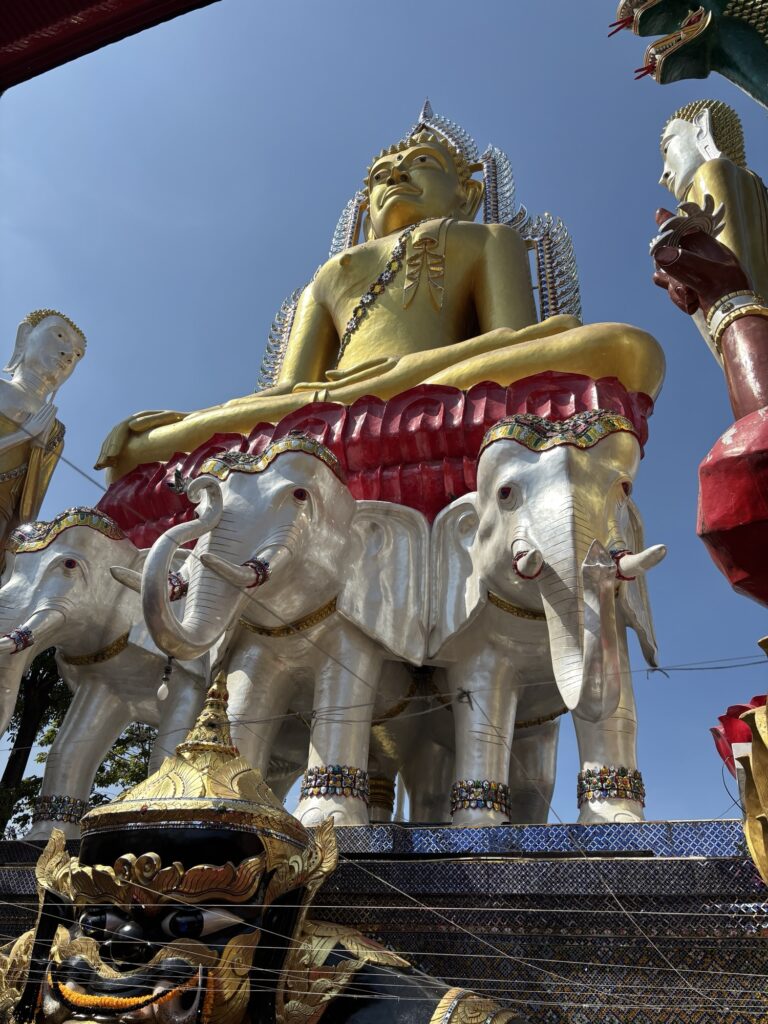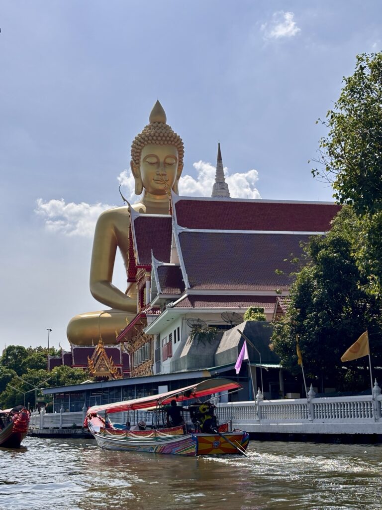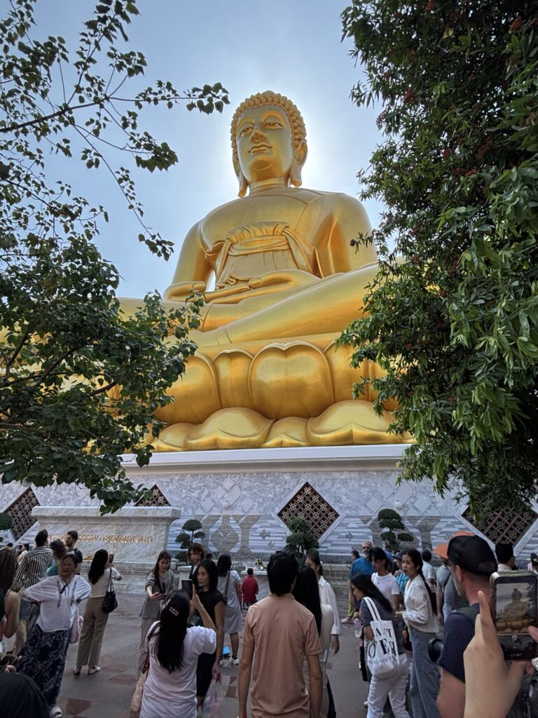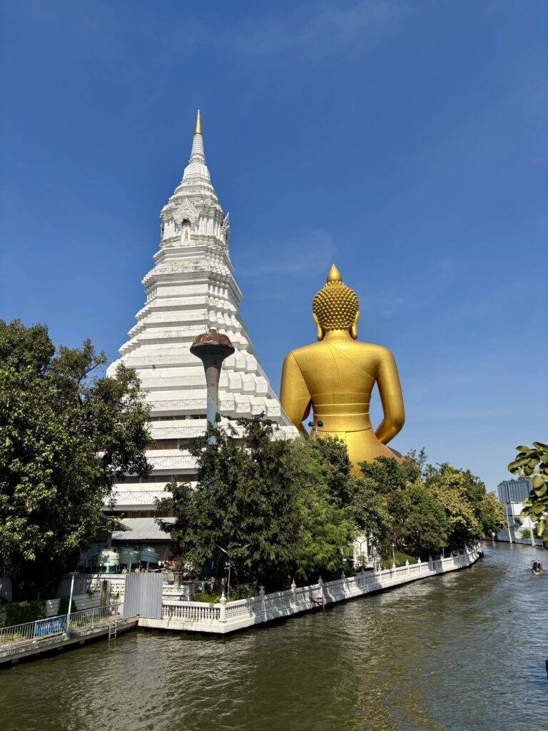 On débarque pour aller au pied du Bouddha monumental du Wat Paknam dont la construction est toute récente puisqu’elle s’est achevée en 2021, ce qui ne l’a pas empêché d’être repeint en 2025. Les échafaudages ne sont plus là et la stature imposante du Bouddha se mesure bien depuis l’esplanade juste devant. On manque même de recul pour le voir en entier.