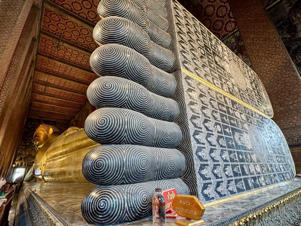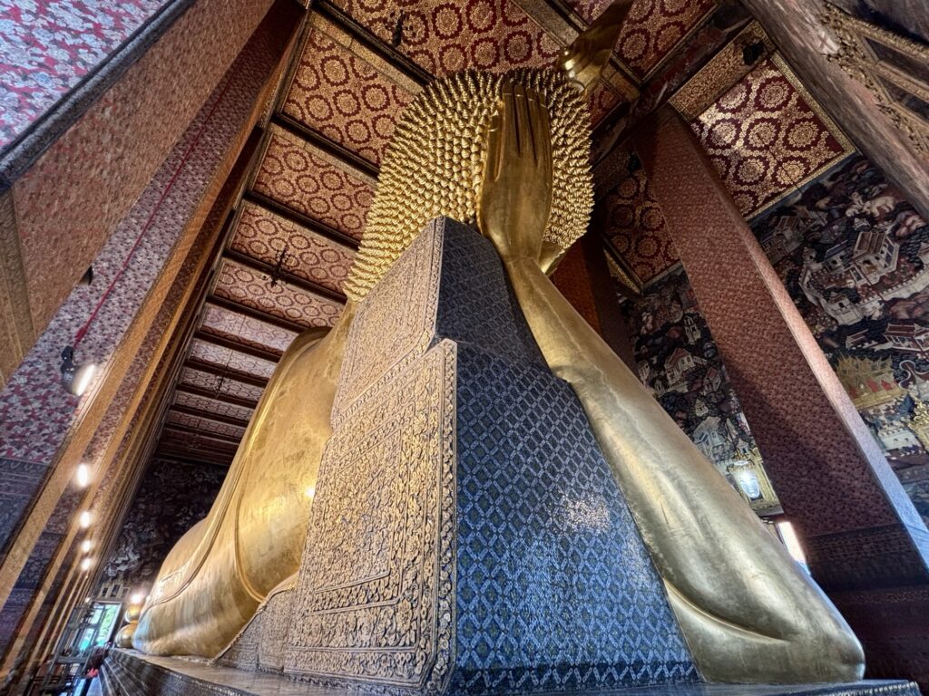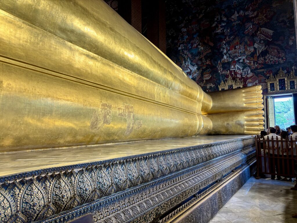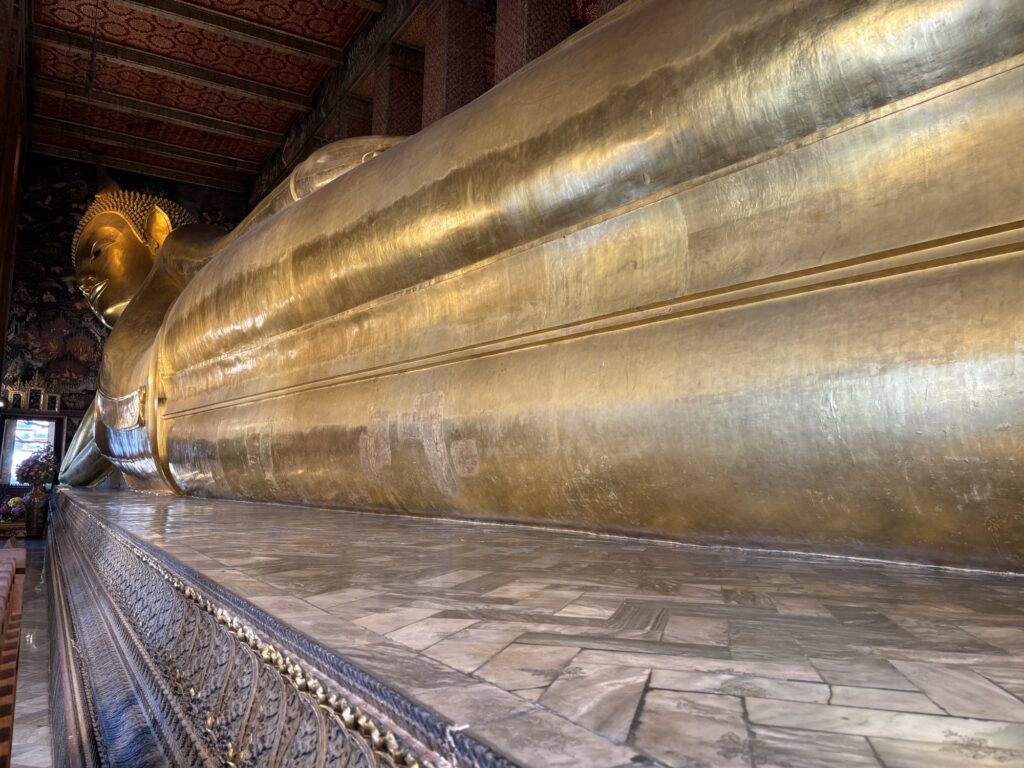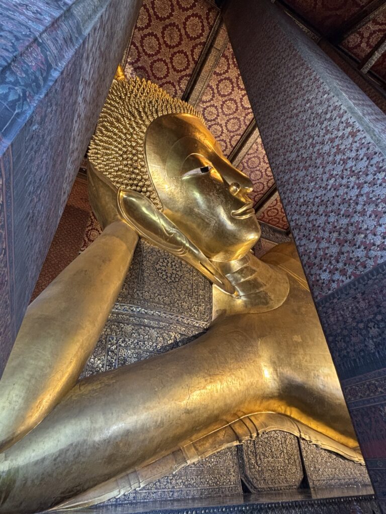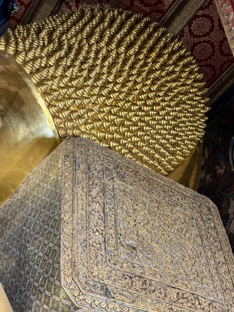 Malgré tout, il faut avouer qu’il est majestueux ce bouddha de 46 mètres de long et 15 mètres de haut entièrement recouvert de feuilles d’or et agrémenté de pieds incrustés de nacre représentant les 108 états de Bouddha. Et la chapelle qui l’abrite est magnifique aussi. Le seul problème est structurel : pour loger un tel colosse, les dimensions du bâtiment sont à l’avenant et j’imagine que c’est pour supporter la charge du haut toit qu’il y a autant de piliers… qui gênent quelque peu la visibilité puisqu’ils sont presque collés à la statue. Pas facile pour les photos !