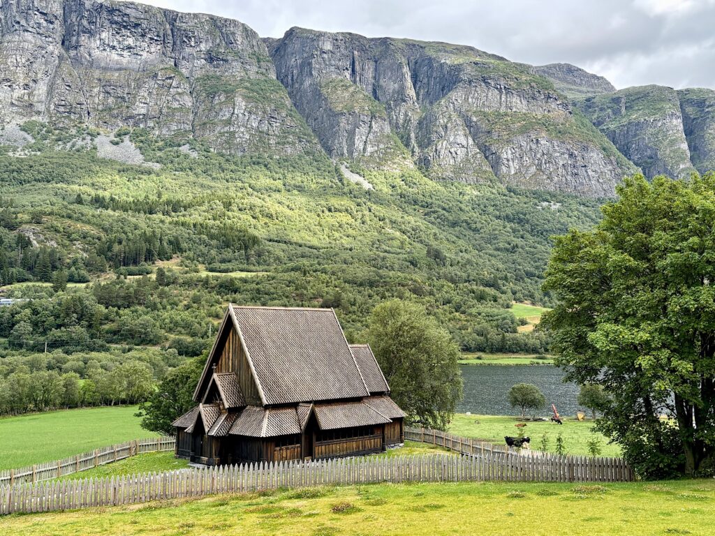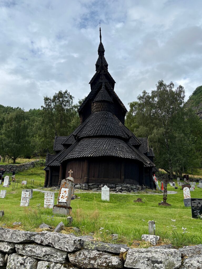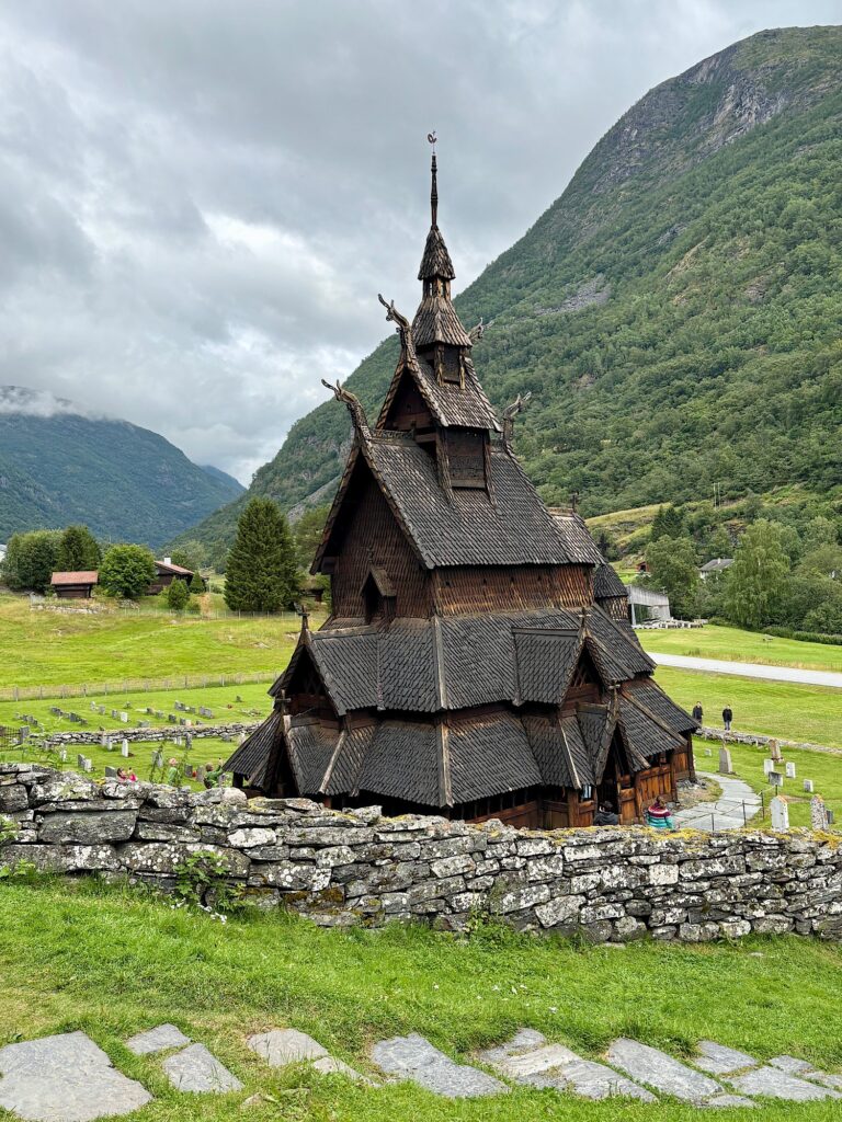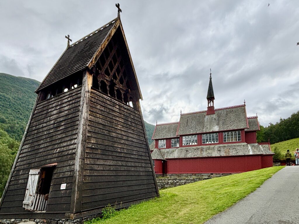 Sur la route pour nous rendre à Beitøstolen où nous dormons ce soir, se trouvent deux églises en bois debout (stavkirke). La première est la plus connue et la mieux conservée des 28 restantes : Borgund stavkirke. Elle a été édifiée autour de l’an 1180. Ses portails richement sculptés, les croix et les têtes de dragons sur le toit sont remarquables mais ce qui l’est plus encore c’est le clocher-tour qui se trouve à côté. À l’époque médiévale, tous les clochers des stavkirke étaient ainsi ; ils ont tous été détruits, sauf celui-ci. Juste derrière on peut voir la nouvelle église.