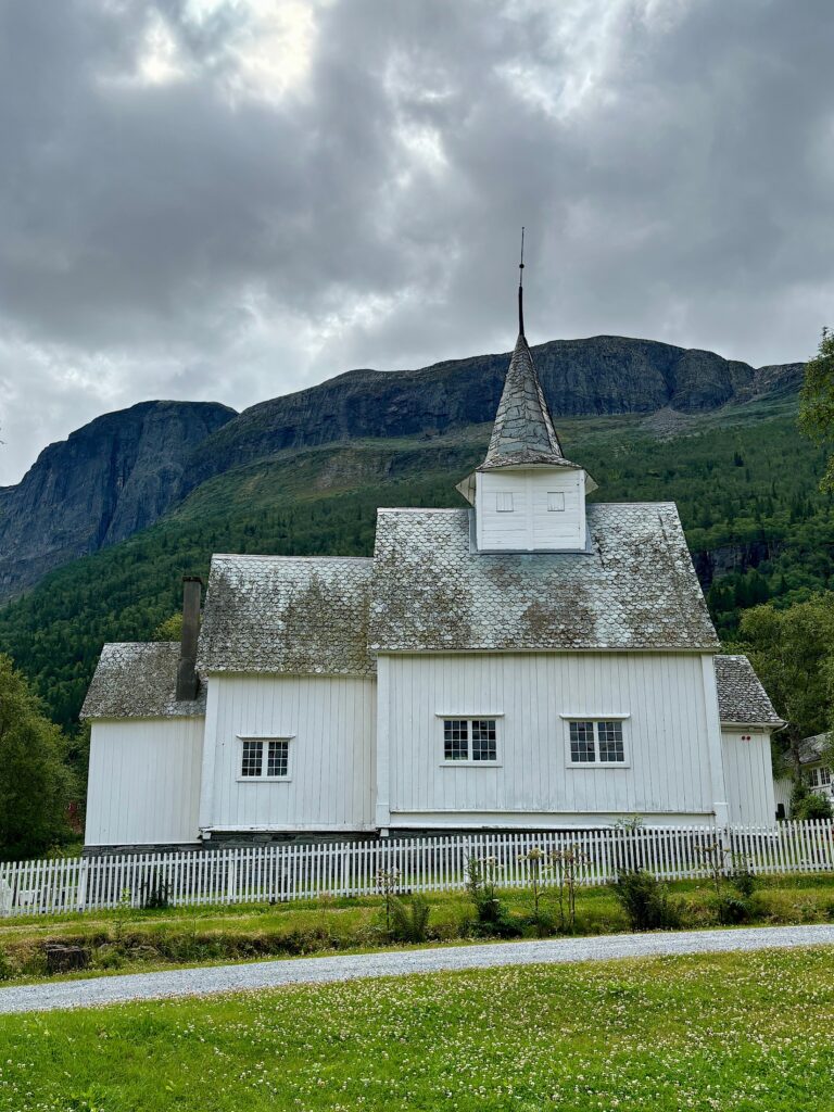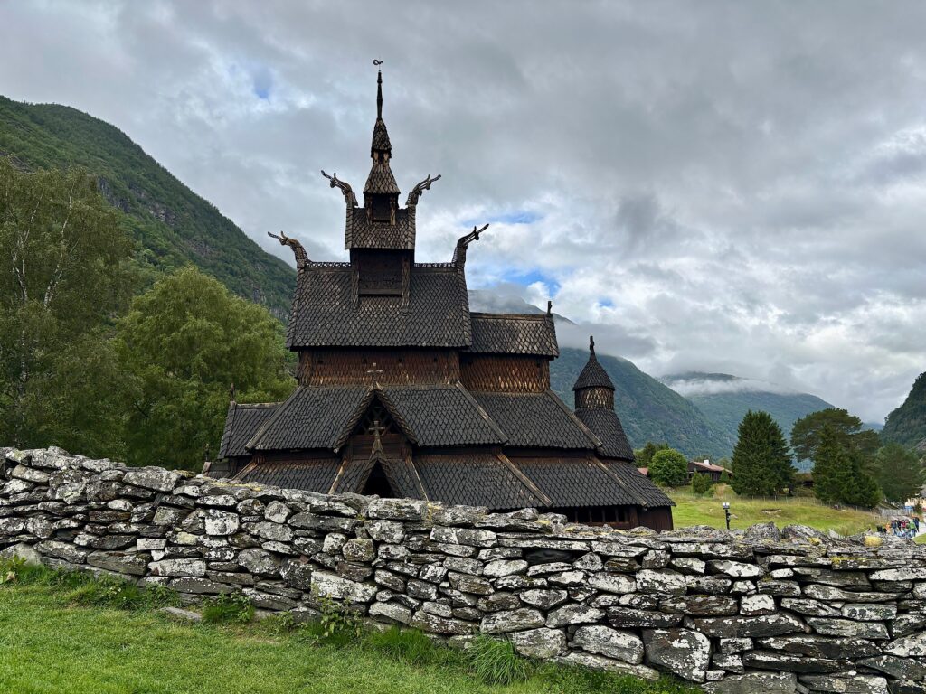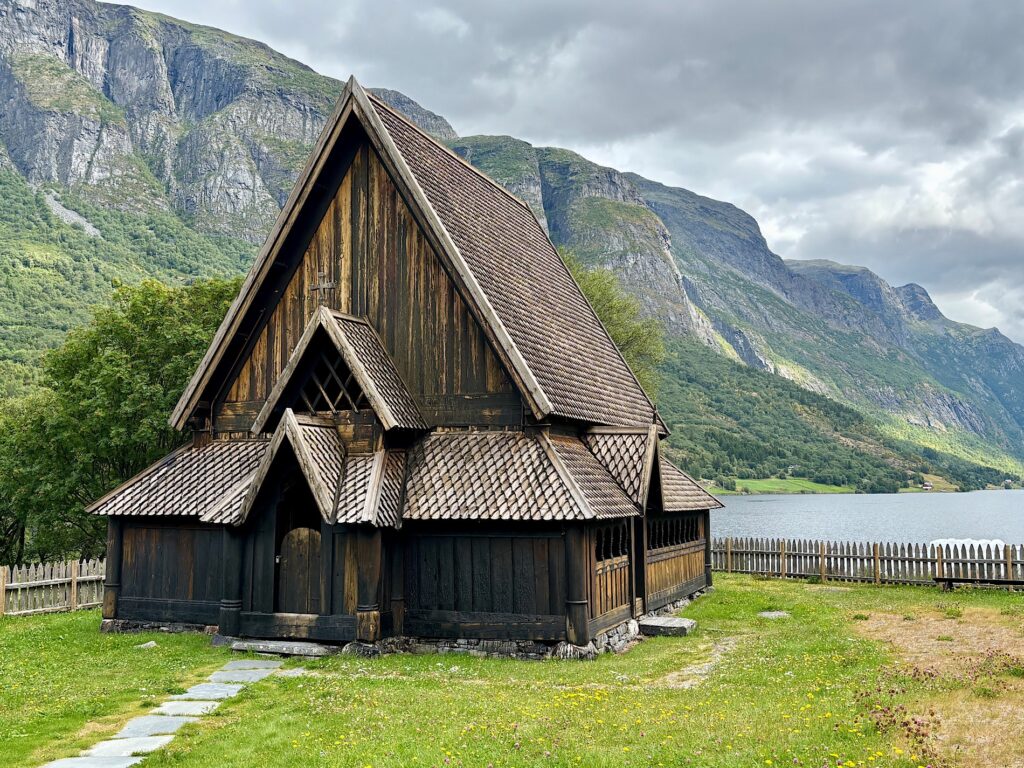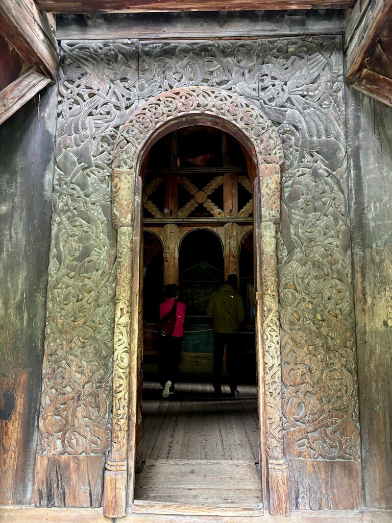Sur la route pour nous rendre à Beitøstolen où nous dormons ce soir, se trouvent deux églises en bois debout (stavkirke). La première est la plus connue et la mieux conservée des 28 restantes : Borgund stavkirke. Elle a été édifiée autour de l’an 1180. Ses portails richement sculptés, les croix et les têtes de dragons sur le toit sont remarquables mais ce qui l’est plus encore c’est le clocher-tour qui se trouve à côté. À l’époque médiévale, tous les clochers des stavkirke étaient ainsi ; ils ont tous été détruits, sauf celui-ci. Juste derrière on peut voir la nouvelle église.