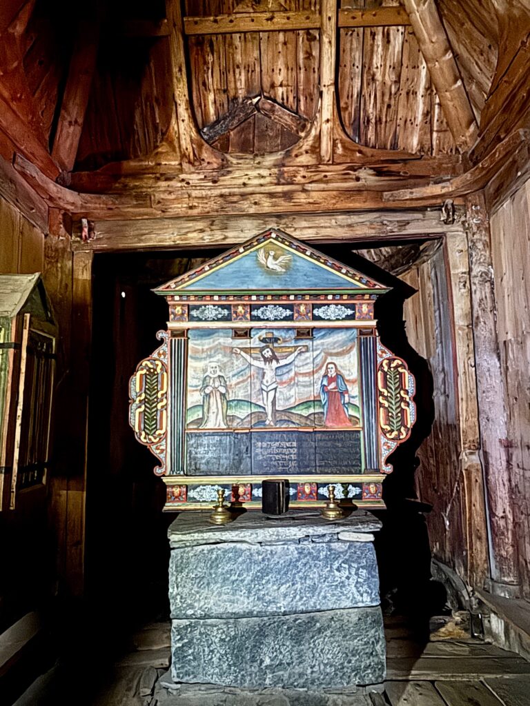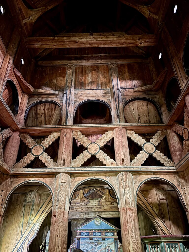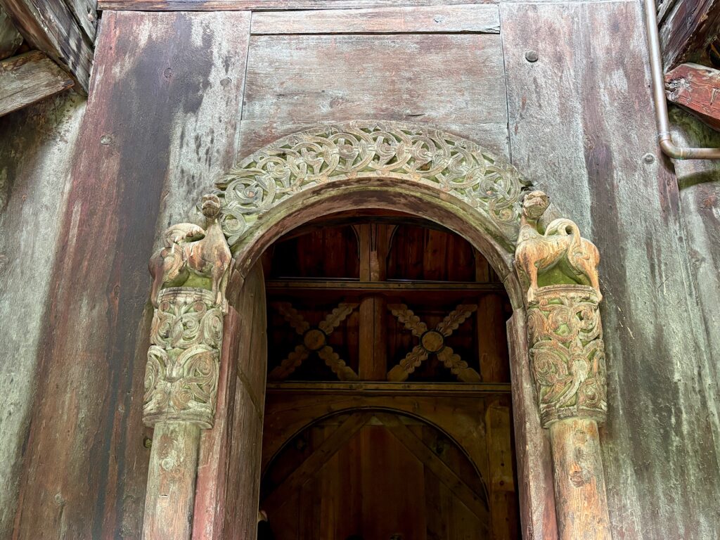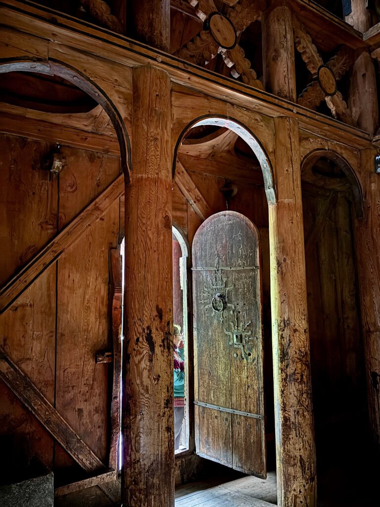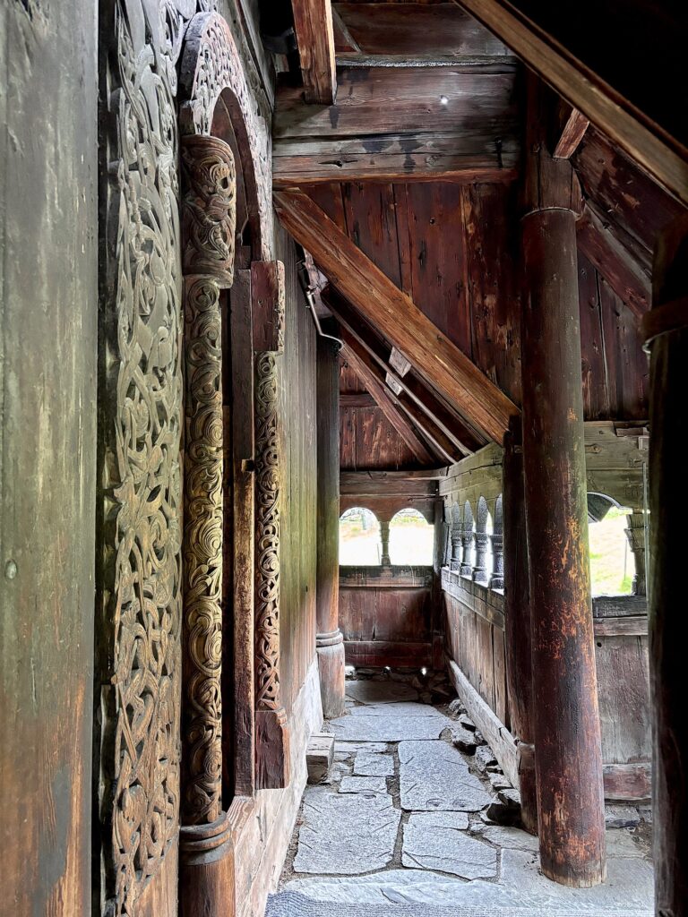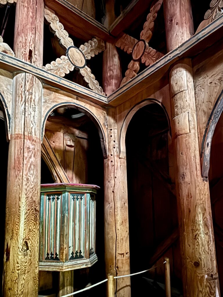 La traduction de stavkirke est littéralement église en bois debout. Lorsqu’on pénètre à l’intérieur, et même en observant les piliers d’angle extérieurs, on comprend pourquoi. Des troncs d’arbres entiers, taillés à la hache, soutiennent l’étage et la toiture.