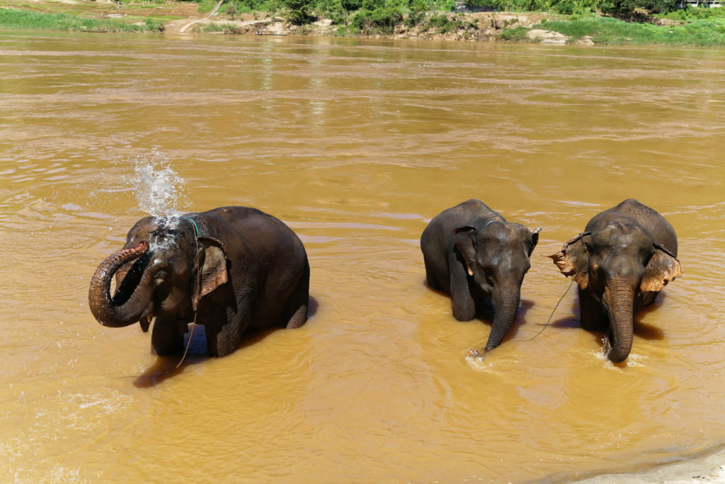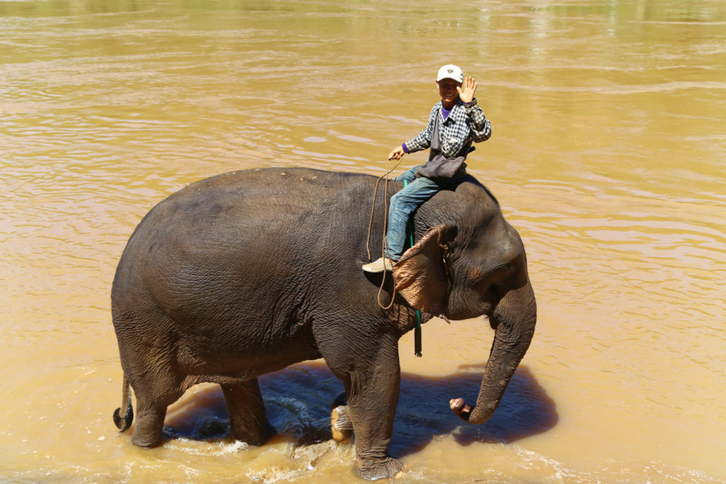 On passe un moment avec les trois éléphantes, le mâle ayant été mis à l’écart momentanément pour cause de musth et donc d’agressivité potentielle. On leur donne des bananes dont elles raffolent, puis on les suit jusqu’au bord du Mékong pour le bain.