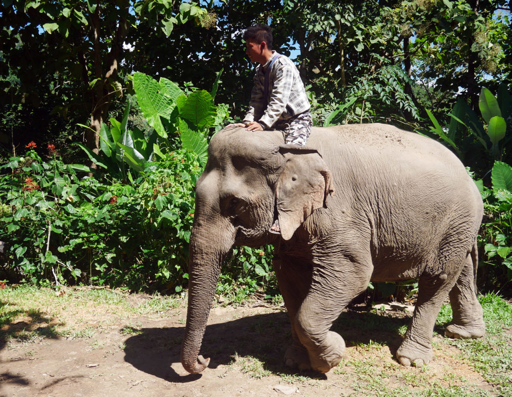 Ici, pas de promenade à dos d’éléphant à la chaîne, pas de persécution, les animaux vivent en paix. Car, avant de monter sur le dos d’un éléphant, il faut que vous sachiez que dans beaucoup de camps, les animaux ont été dressés d’une manière qui s’apparente à de la torture, en subissant un rituel qui s’appelle le Phajaan. Cela consiste à « briser » l’éléphanteau pour qu’il perde son instinct sauvage et qu’il obéisse aux ordres comme un robot. Selon la croyance qu’on peut séparer l’esprit du corps, les éléphanteaux sont enfermés et attachés dans des cages exiguës, privés de nourriture, puis torturés à coups de piques pendant plusieurs jours. L’animal ressort soit mort soit complètement soumis et empreint de la peur de l’homme. Il est alors prêt à être dressé pour les travaux en forêt ou pour amuser les touristes. La plus vieille des éléphantes (48 ans) a subi ce genre de dressage pour effectuer des travaux en montagne et elle est en effet beaucoup plus docile et abîmée que la plus jeune (25 ans) qui a son petit caractère et amuse la galerie. D’ailleurs, elle se mouche sur moi au moment où je lui donne ses bananes ; je suis crépie de morve d’éléphant !!
