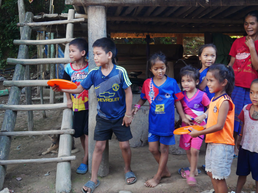 Au bout du sentier, nous arrivons au village. S’en suit une nouvelle séance de frisbee avec les enfants qui sont très réceptifs. J’ai vraiment eu une bonne idée en emmenant ces trucs ; ça ne prend pas beaucoup de place dans les valises, ça permet de créer un échange sympa et de faire plaisir aux petits en leur offrant autre chose que des stylos.