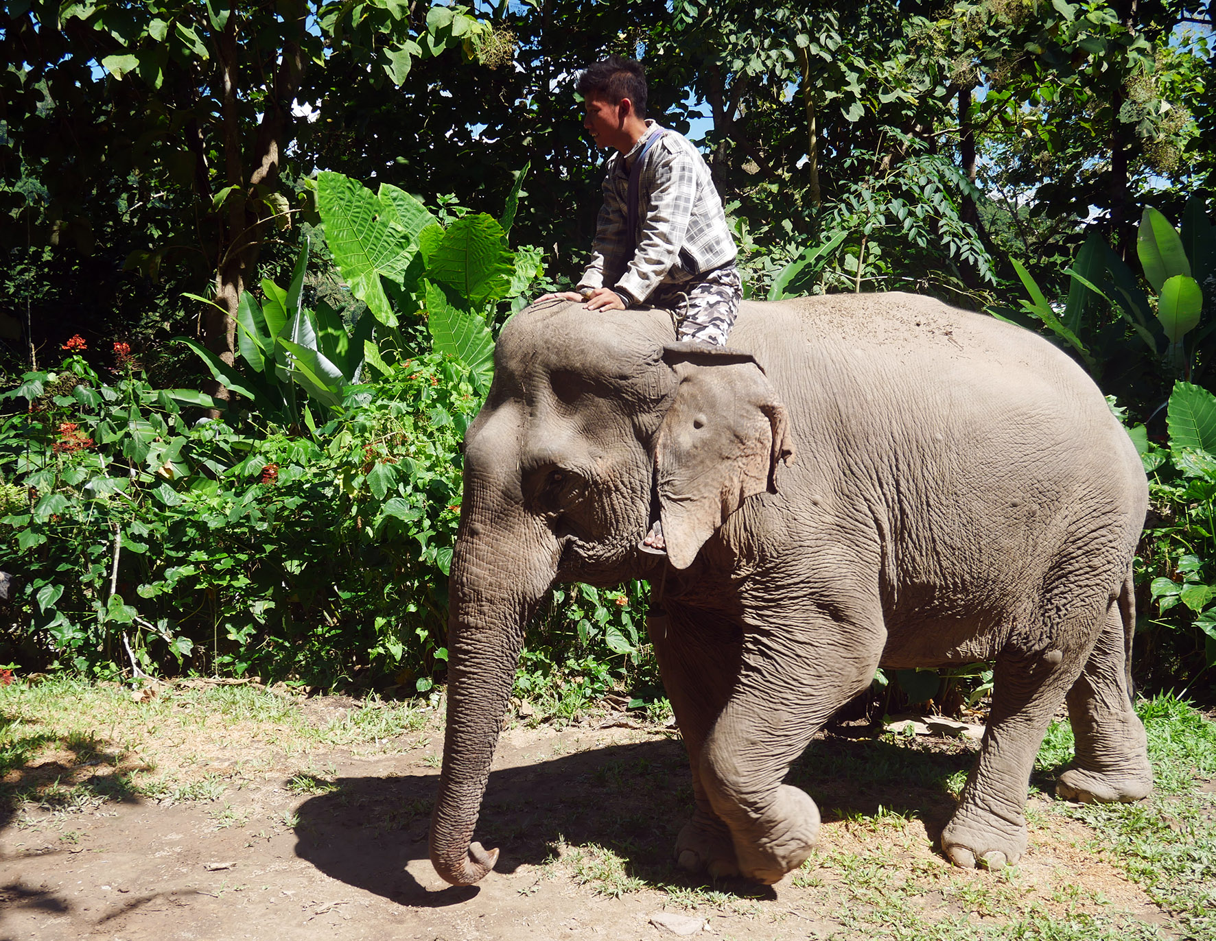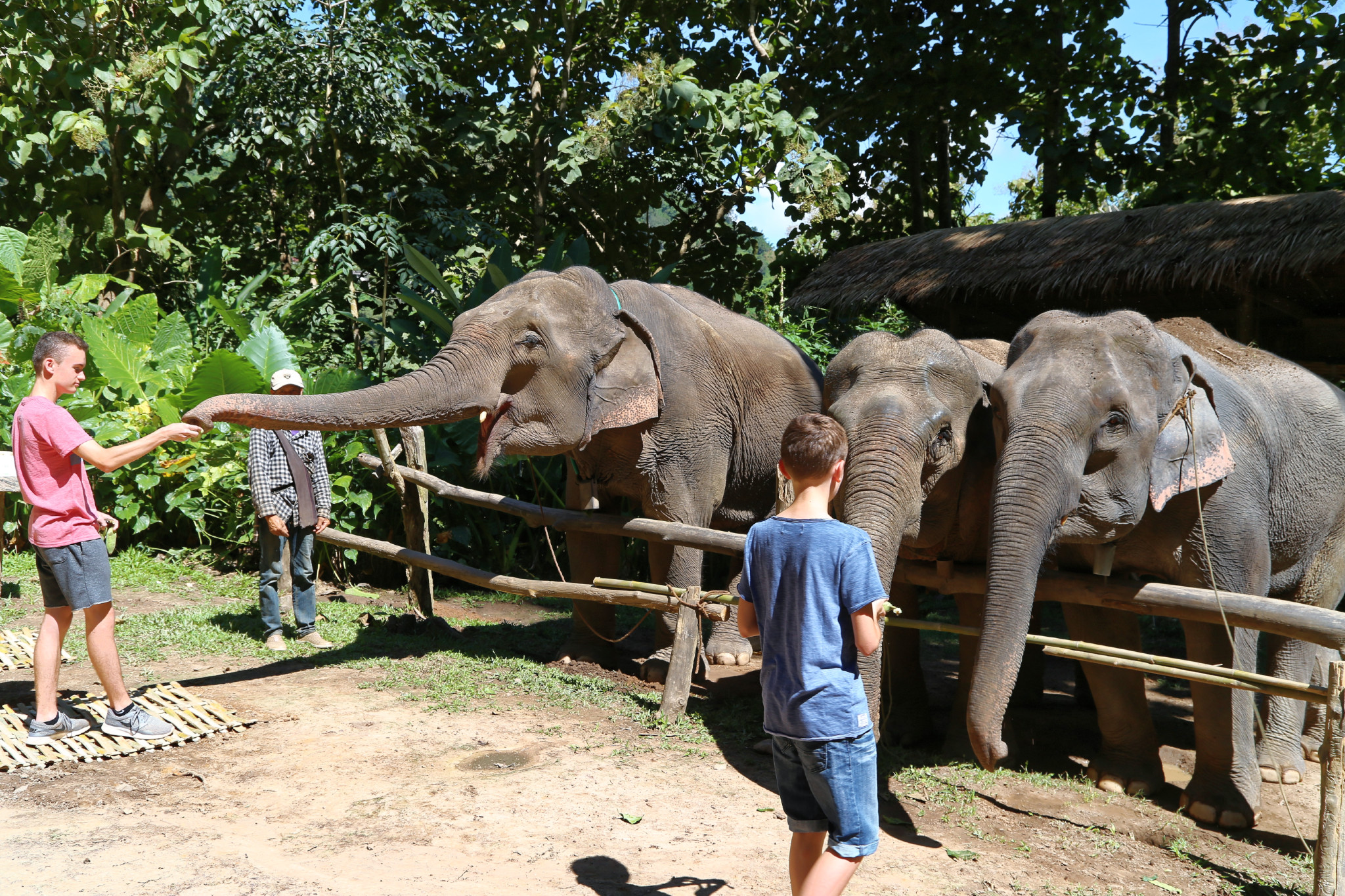 Ici, pas de promenade à dos d’éléphant à la chaîne, pas de persécution, les animaux vivent en paix. Car, avant de monter sur le dos d’un éléphant, il faut que vous sachiez que dans beaucoup de camps, les animaux ont été dressés d’une manière qui s’apparente à de la torture, en subissant un rituel qui s’appelle le Phajaan. Cela consiste à « briser » l’éléphanteau pour qu’il perde son instinct sauvage et qu’il obéisse aux ordres comme un robot. Selon la croyance qu’on peut séparer l’esprit du corps, les éléphanteaux sont enfermés et attachés dans des cages exiguës, privés de nourriture, puis torturés à coups de piques pendant plusieurs jours. L’animal ressort soit mort soit complètement soumis et empreint de la peur de l’homme. Il est alors prêt à être dressé pour les travaux en forêt ou pour amuser les touristes. La plus vieille des éléphantes (48 ans) a subi ce genre de dressage pour effectuer des travaux en montagne et elle est en effet beaucoup plus docile et abîmée que la plus jeune (25 ans) qui a son petit caractère et amuse la galerie. D’ailleurs, elle se mouche sur moi au moment où je lui donne ses bananes ; je suis crépie de morve d’éléphant !!