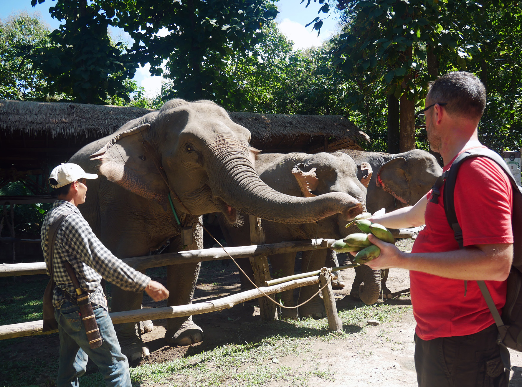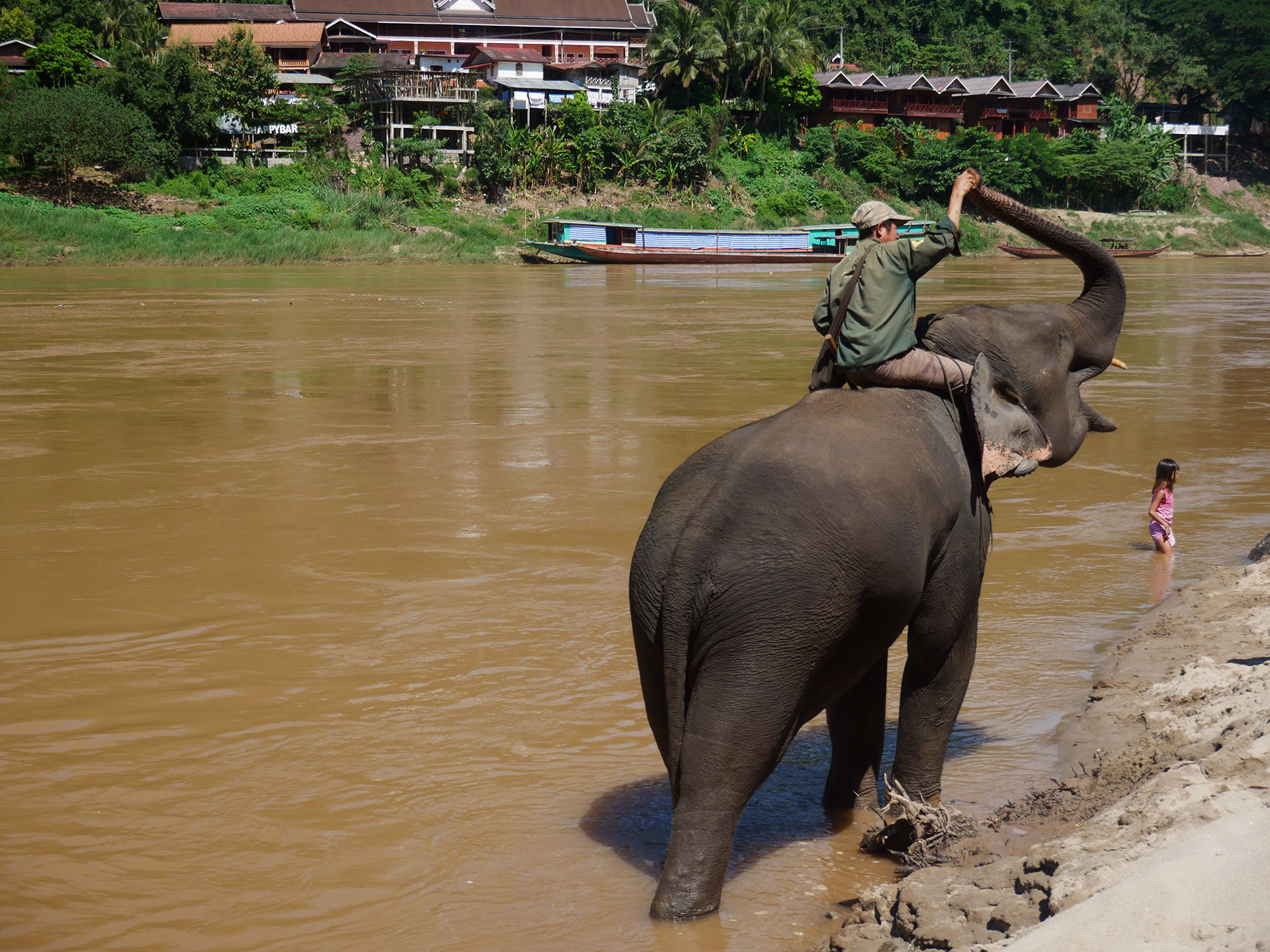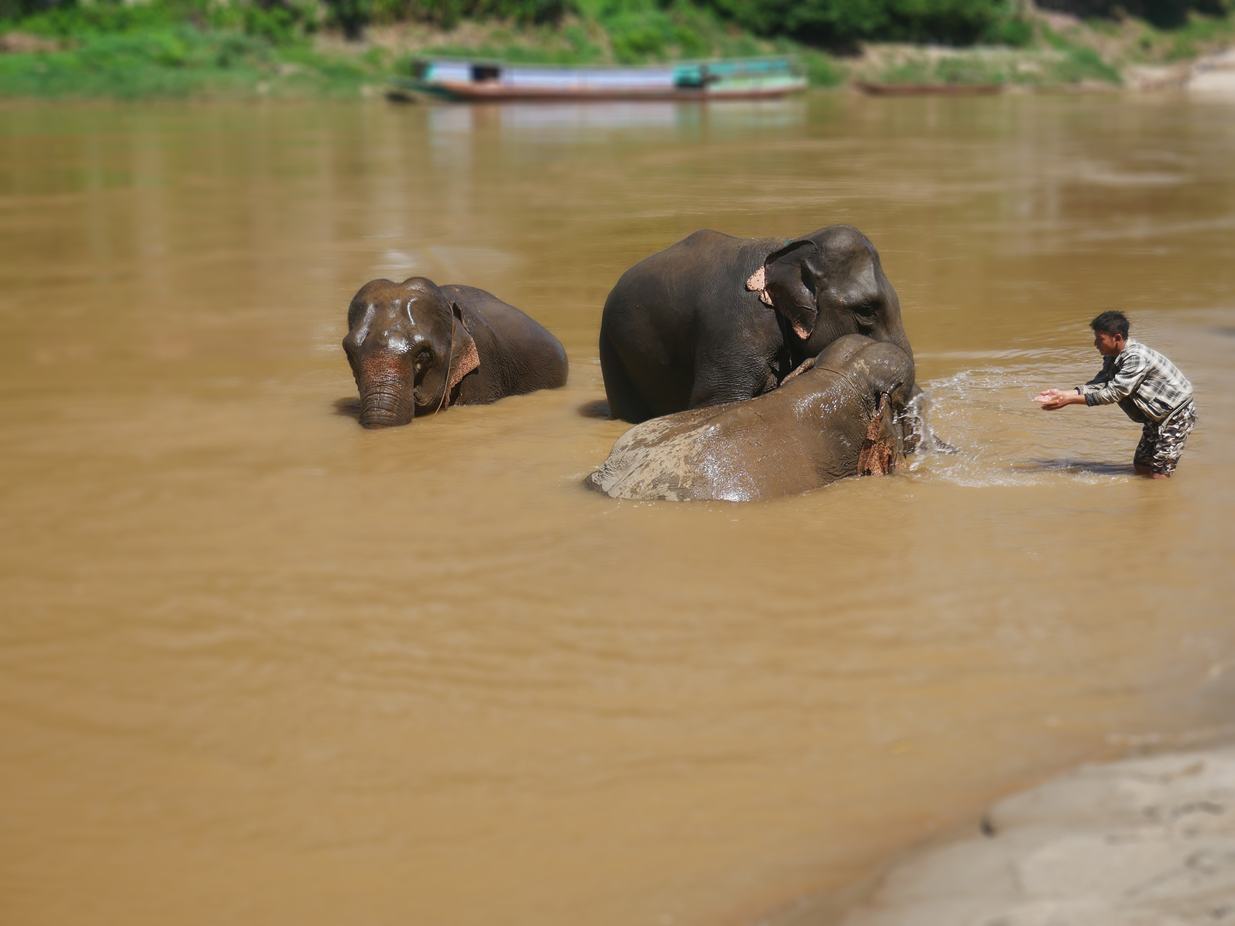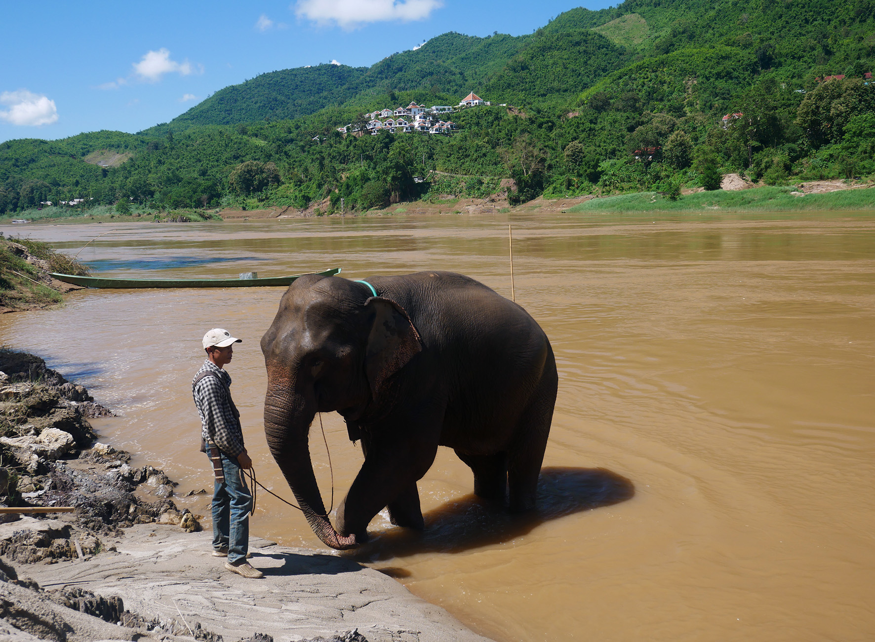 On passe un moment avec les trois éléphantes, le mâle ayant été mis à l’écart momentanément pour cause de musth et donc d’agressivité potentielle. On leur donne des bananes dont elles raffolent, puis on les suit jusqu’au bord du Mékong pour le bain.