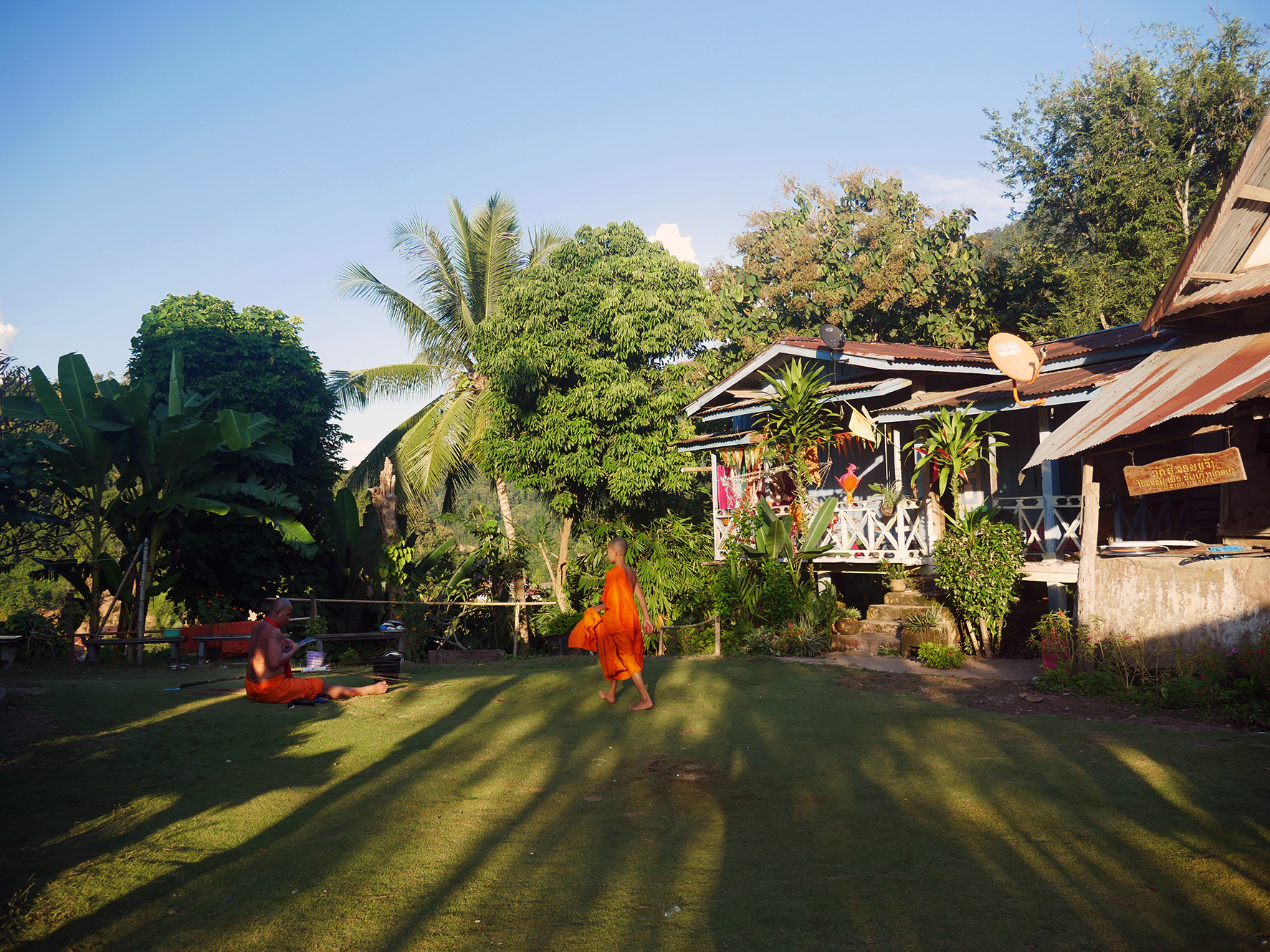Après le déjeuner, nous partons avec notre guide et deux accompagnateurs locaux pour une randonnée dans la jungle jusqu’à un village Khamu. Léo et Axel, ayant entendu qu’il y a des sangsues dans la forêt, préfèrent rester à l’hôtel avec leurs copains. Encore une fois, ça grimpe, ça glisse, il fait chaud, c’est dur, mais c’est beau !