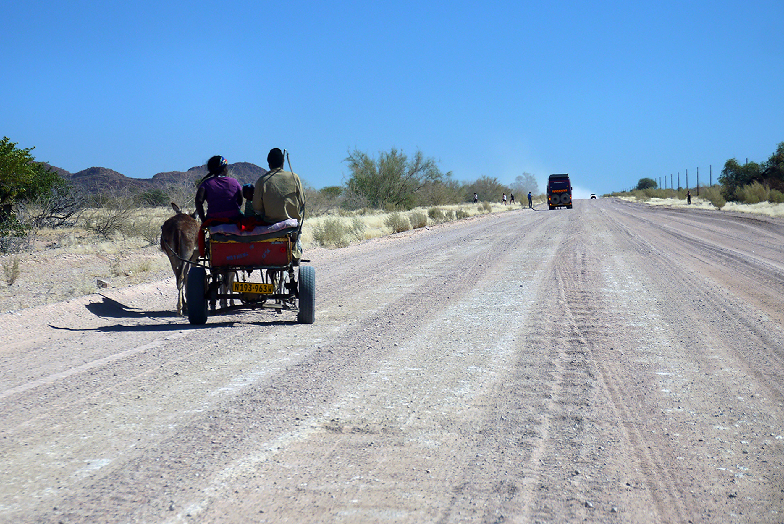 Sur la piste, les camions et les 4×4 côtoient les charrettes tirées par des mules et même des piétons.