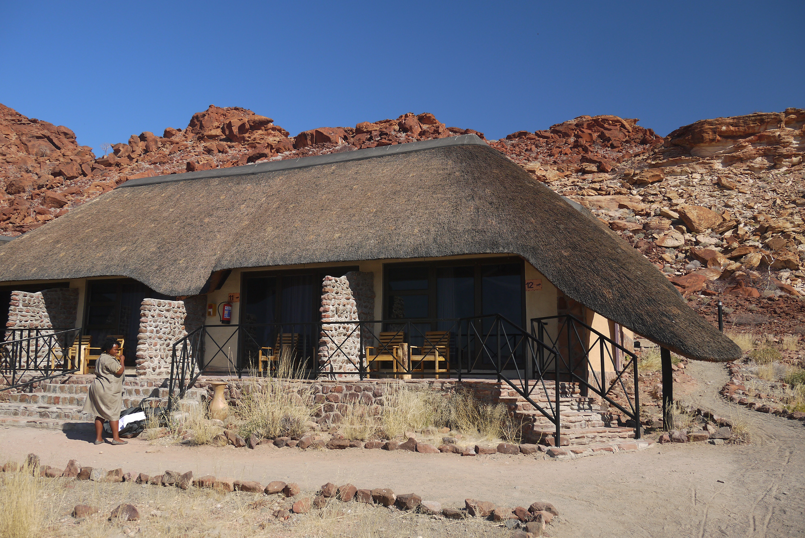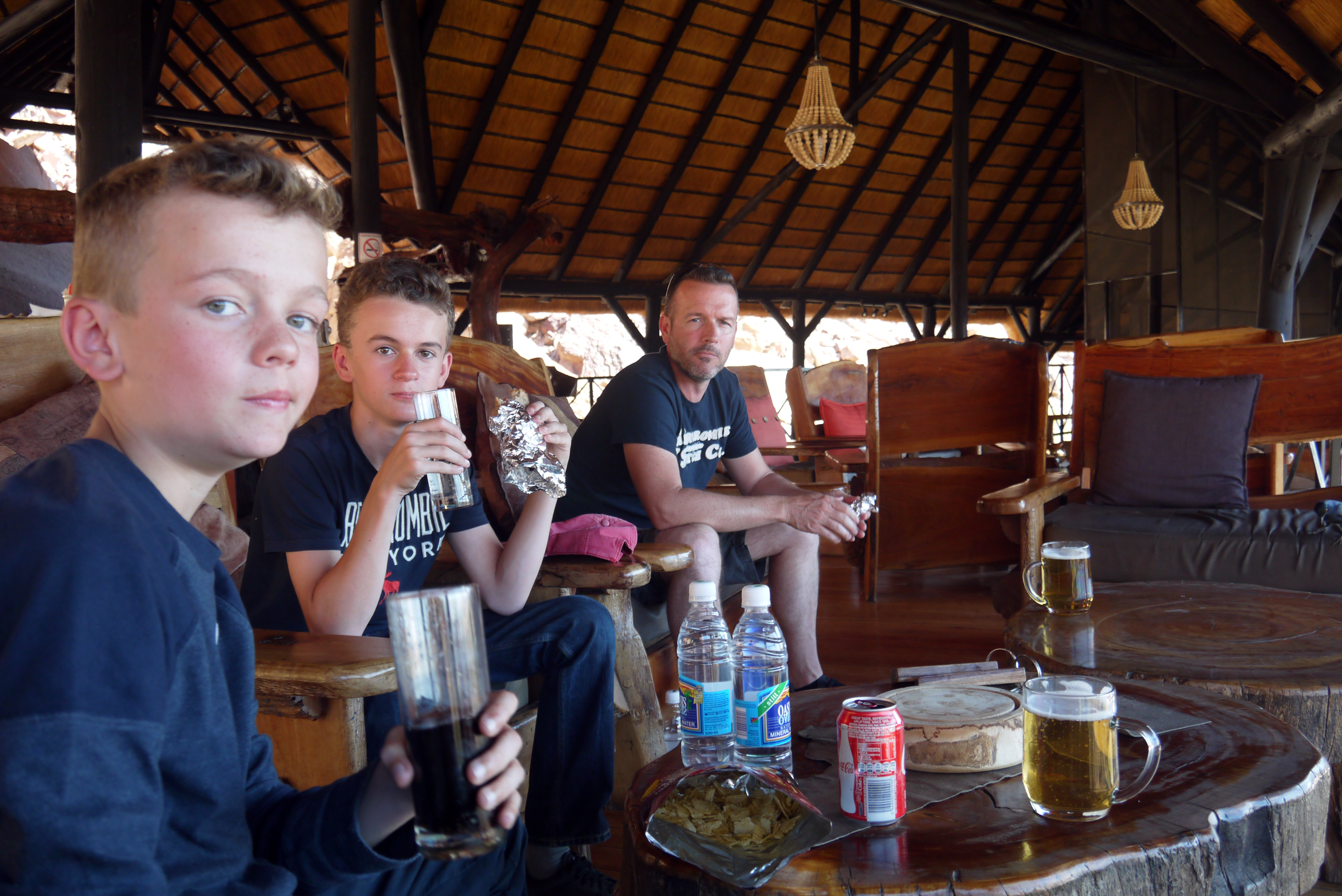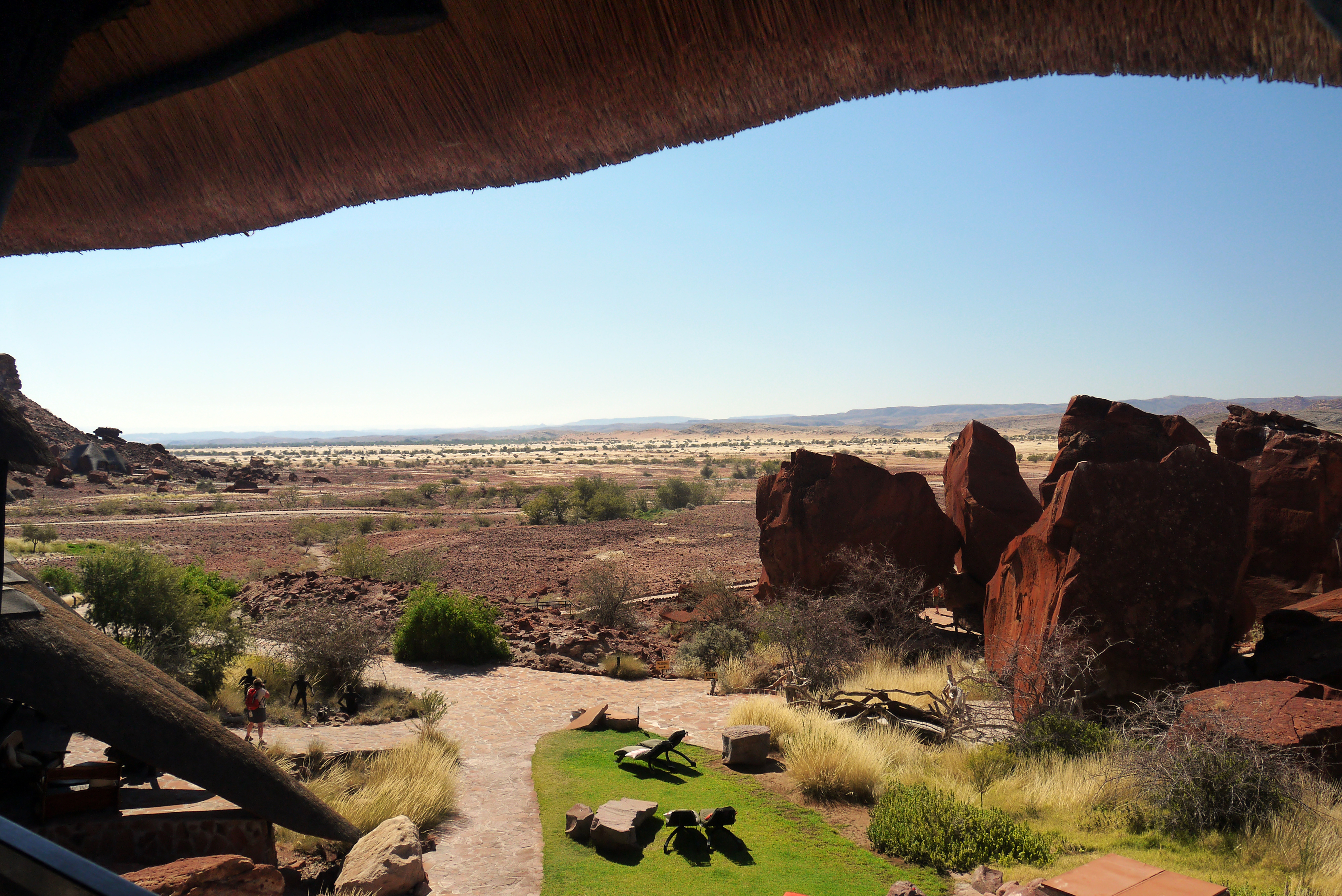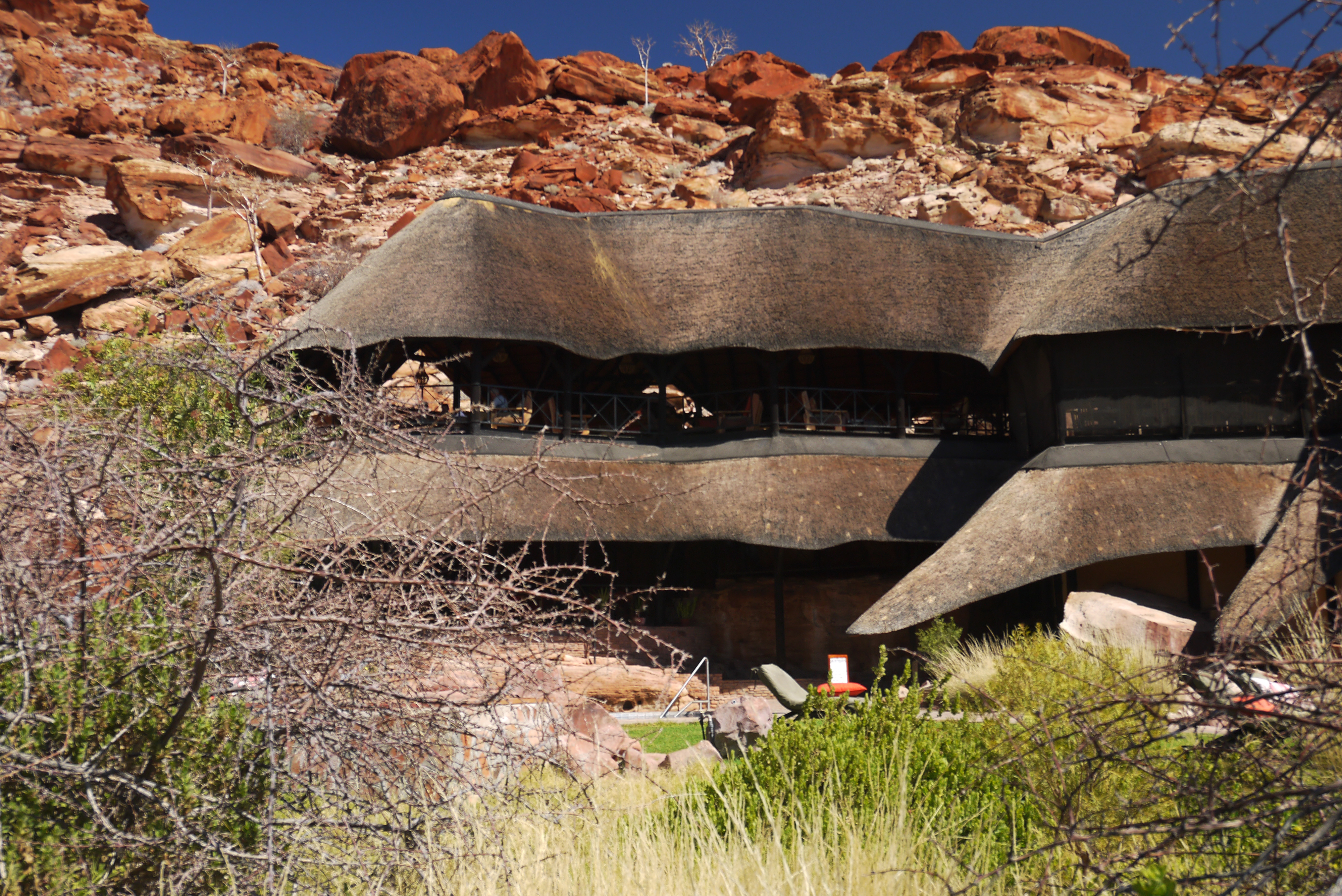 On lézarde au magnifique bar du Twyfelfontein Country Lodge le temps de pique-niquer et d’attendre que notre chambre soit prête.