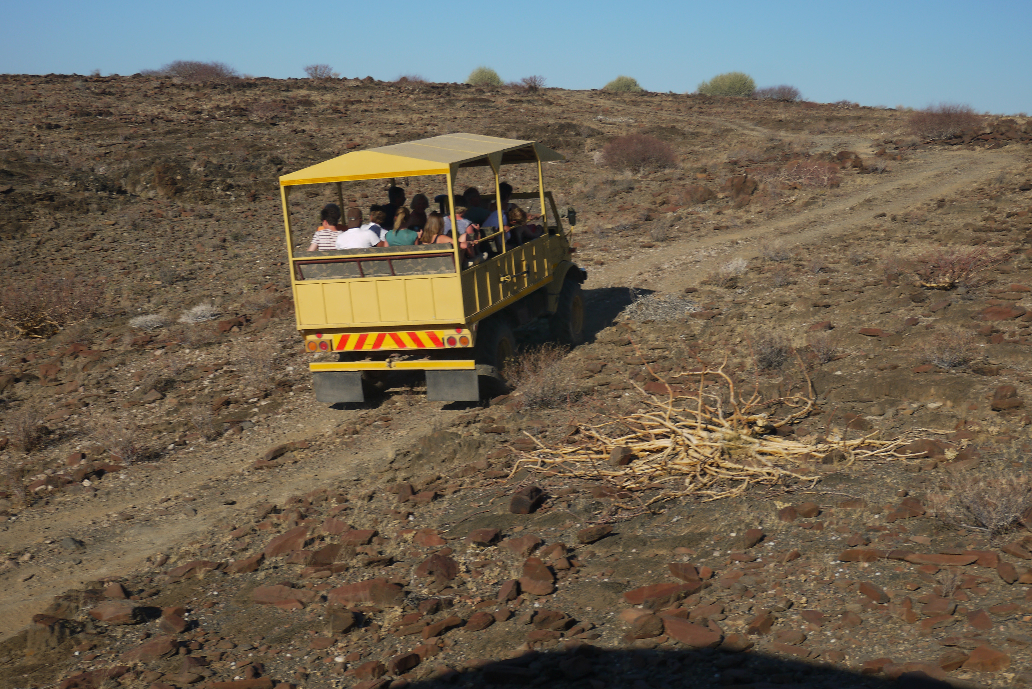 En préparant notre circuit, j’ai lu plusieurs récits de voyageurs qui ont sillonné les pistes et les lits des rivières avec leur propre 4×4 pour trouver eux-mêmes les pachydermes tant convoités. Ça doit être grisant de les trouver et d’être seul à les contempler. Sinon il y a la possibilité de faire une sortie en 4×4 ouvert, organisée par quasiment tous les lodges du Damaraland pour leurs clients. Nous, comme on est trop des aventuriers :-), on a choisi la sortie avec le lodge ! Disons que c’est moins hasardeux et on préfère s’appuyer sur l’expertise d’un guide que sur notre bonne étoile.