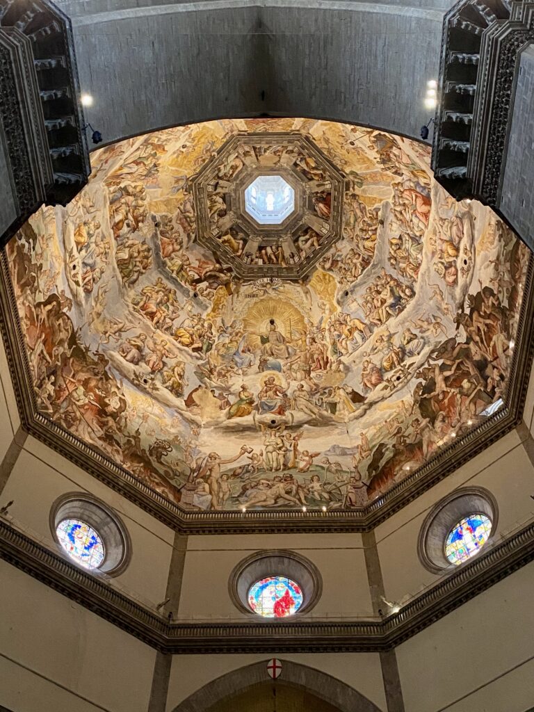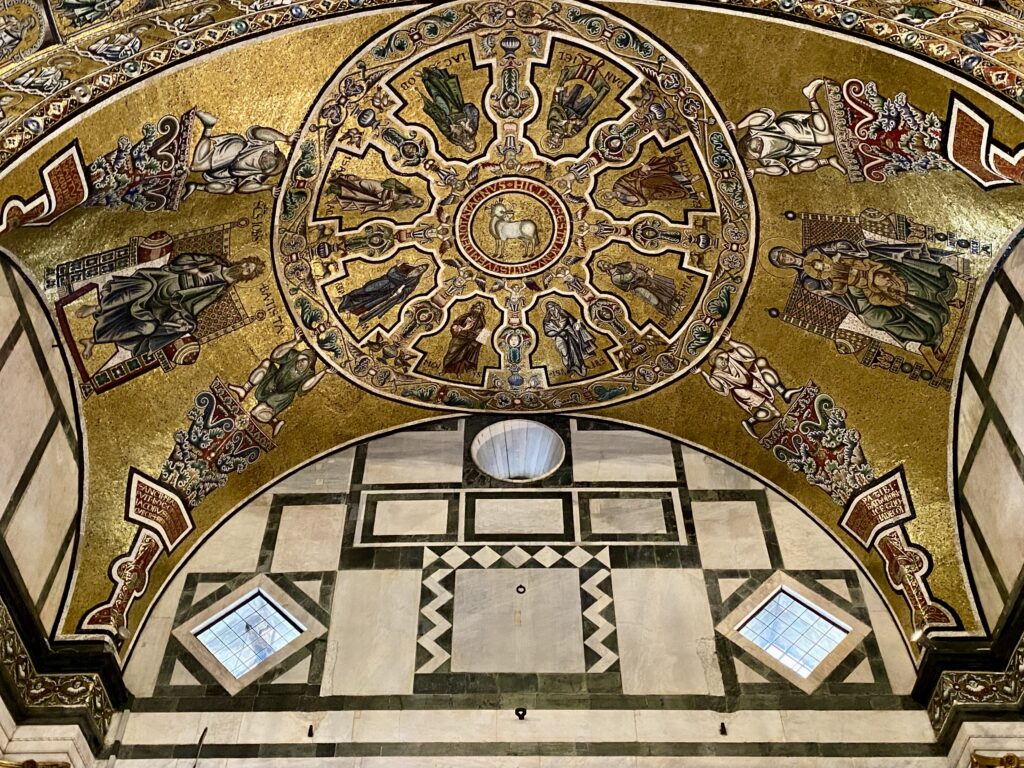 C’est notre dernière journée à Florence. Nous rangeons nos affaires pour libérer la chambre et laissons nos valises dans la salle du petit-déjeuner le temps de nos visites. Nos pas nous mènent irrémédiablement vers la piazza del Duomo. Nos pass achetés en ligne sont valables 3 jours, donc nous avons réparti les visites entre hier et aujourd’hui. Ce matin, nous commençons par le Baptistère San Giovanni. Ce bâtiment octogonal serait le plus ancien de tous les édifices de la piazza del Duomo. Il est, lui aussi, constitué de marbres colorés. A l’intérieur, la salle unique est en cours de réfection. Le plafond, qui est la pièce maitresse, est invisible. Seules les mosaïques et murs périphériques sont visibles. Les mosaïques dorées sont magnifiques.