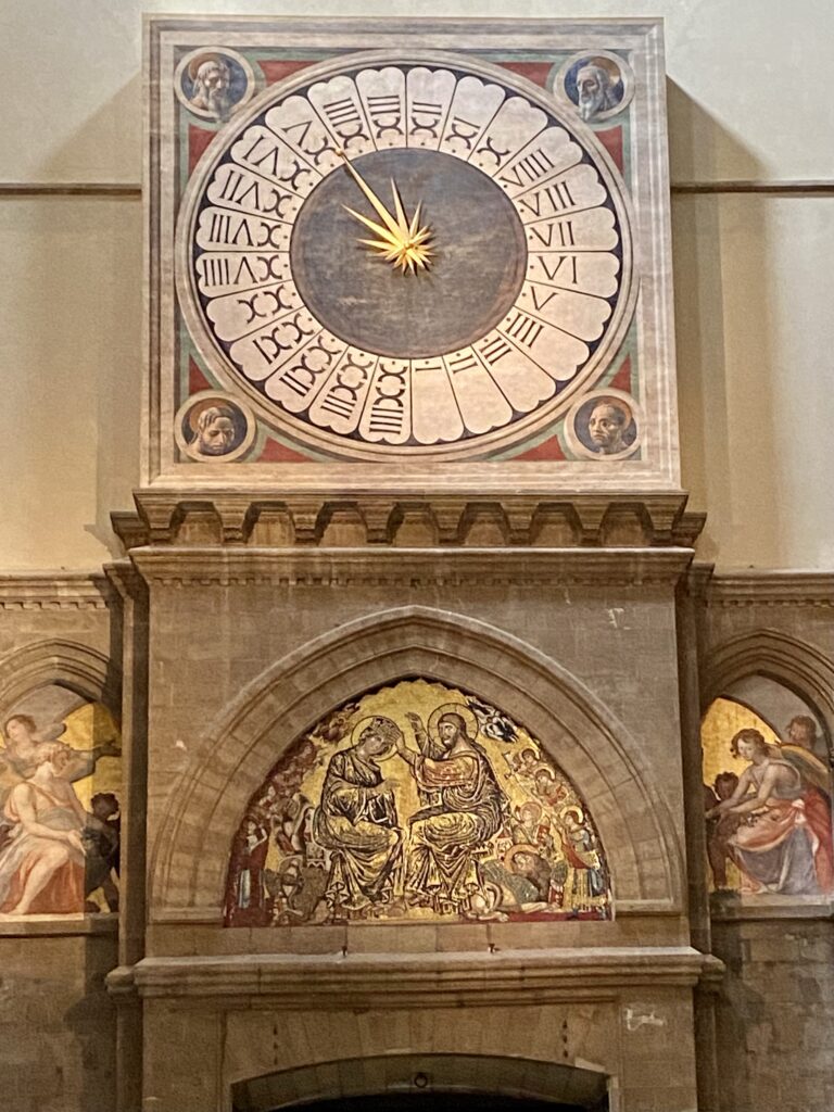 Pour la prochaine visite, nous ne parcourons que quelques mètres et commençons à faire la queue sur le côté sud de la cathédrale Santa Maria dei Fiore. Il y a un monde fou en ce lundi matin ! Les files d’attente ne sont pas du tout organisées, je veux dire par là qu’il n’y a pas de pancarte ni de couloir matérialisé. Il faut partir de la porte d’entrée et remonter la file pour y prendre place. Côté sud, il y a une file pour la cathédrale, une file pour le campanile, une file pour la crypte. Nous on fait la queue pour la crypte di Santa Reparata. Ca va quand même assez vite et nous pénétrons enfin… dans la cathédrale. Du coup on ne comprend pas bien pourquoi il a deux files pour la cathédrale et la crypte !
