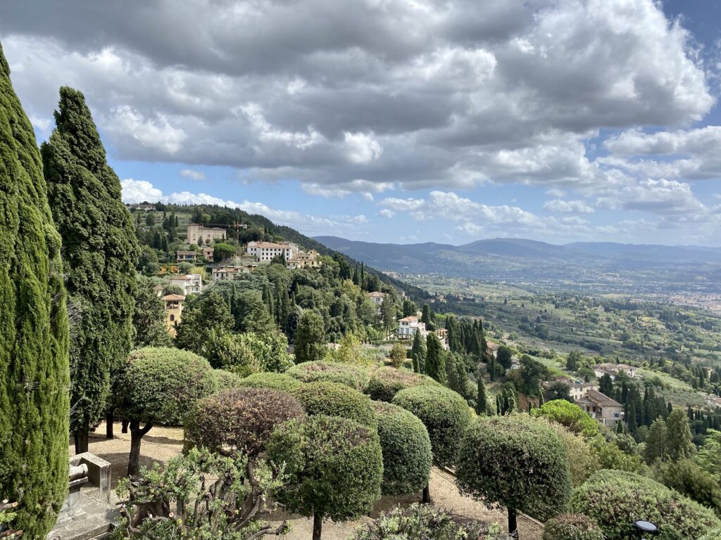 Voilà, notre séjour à Florence s’achève. Nous faisons un détour par le village de Fiesole qui est juché sur une colline au nord de Florence. Un chemin mène à un belvédère qui s’ouvre sur un panorama époustouflant : Florence au fond et partout des champs d’olivier et des jardins hérissés de cyprès. Comme le dit Axel, on a l’impression que le paysage tout entier a été façonné par un paysagiste. Malheureusement, nos photos ne rendent pas aussi bien que la réalité car on a le soleil en face et le temps se couvre. Des orages sont annoncés.