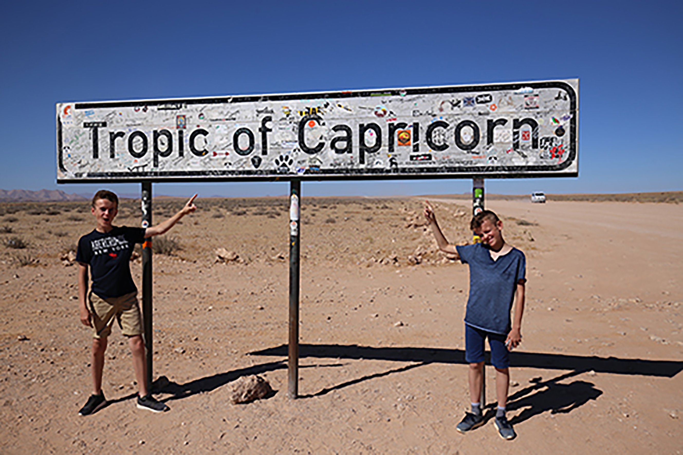 La C19 est en mauvais état sur les 2 tiers du trajet, de la tôle ondulée qui nous brasse et finit par donner des maux de tête et de cervicales. On passe le Tropique du Capricorne, puis de jolis paysages vers Gaub pass et Kuiseb canyon.