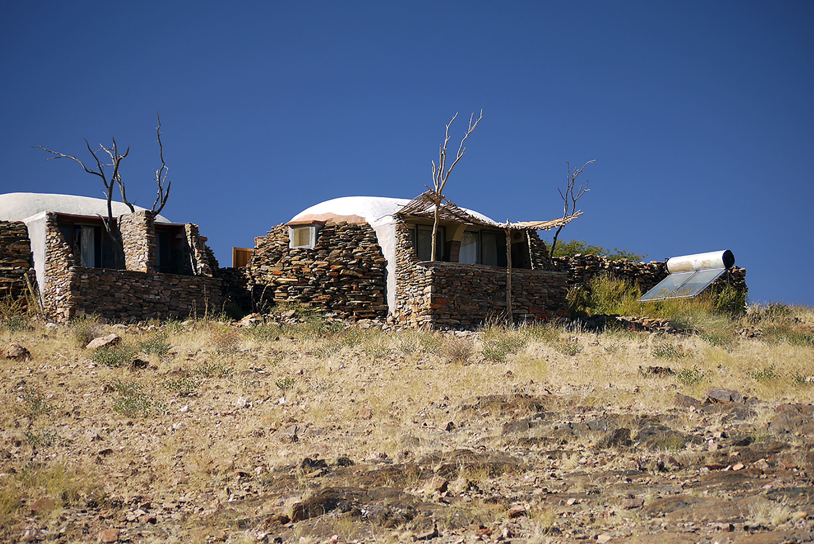 Mais ces pistes nécessitent d’avoir un permis et, comme une cruche, j’ai oublié de l’acheter au bureau du NWR avant de quitter Sesriem hier. Donc, changement de programme, on profite des sentiers de randonnées sur la propriété du Rostock Ritz. Autant vous dire que ce n’est pas mal du tout et qu’on se console vite. On voit notre « bungalow-yourte-igloo » depuis la plaine.