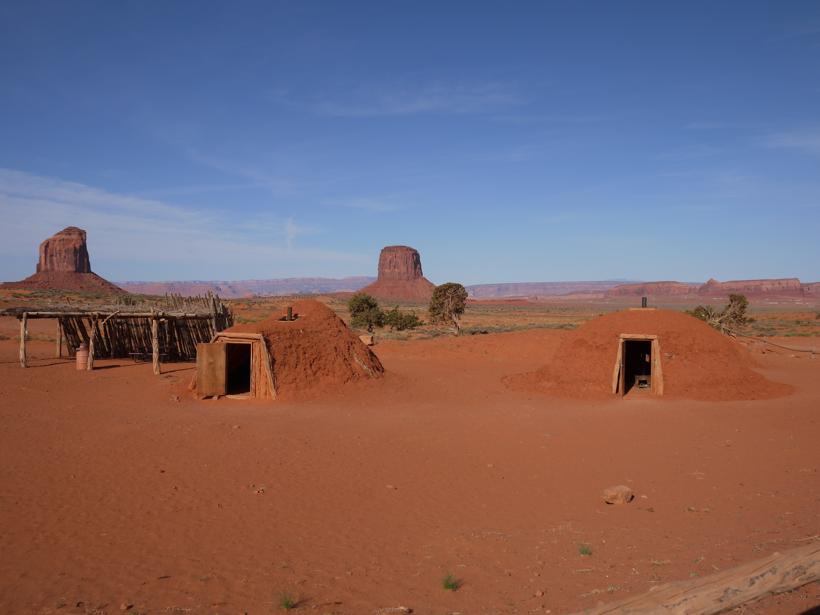 P1000965Eh oui les enfants, on casse un mythe : les indiens ne vivaient pas forcément dans des tipis ; certains, sédentarisés, vivaient dans des hogans en sable solidifié. Aujourd’hui, ils ont troqué les hogans contre des préfabriqués ou des mobil-homes.
