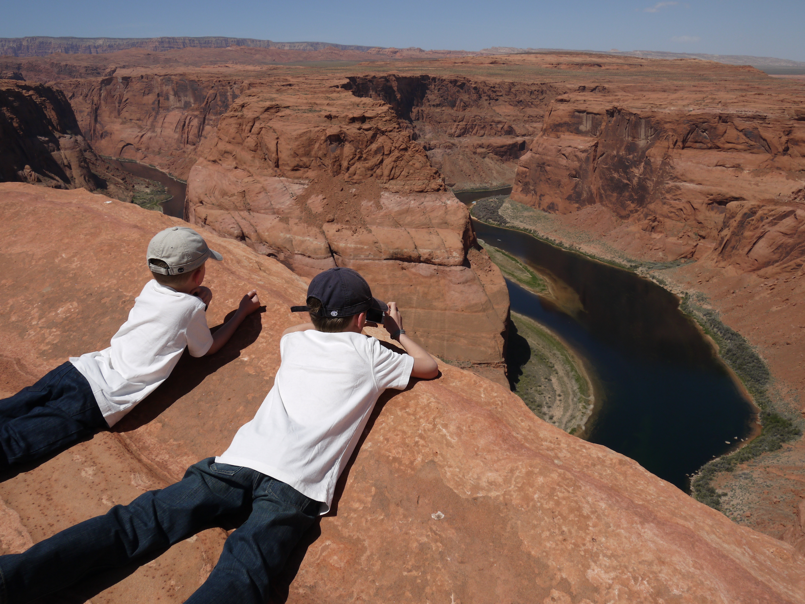 On prend la route de Page qui traverse le désert du nord de l’Arizona. Les lignes droites paraissent interminables ! On arrive en fin de matinée et on se dirige de suite vers Horseshoe Bend. Il s’agit d’un point de vue époustouflant et vertigineux sur un méandre du Colorado qui forme un fer à cheval (d’où son nom). On laisse un car de touristes japonais prendre de l’avance (on sait qu’ils ne resteront pas longtemps !) et après une courte montée dans le sable rouge, on descend vers la rive du fleuve pour découvrir ça :