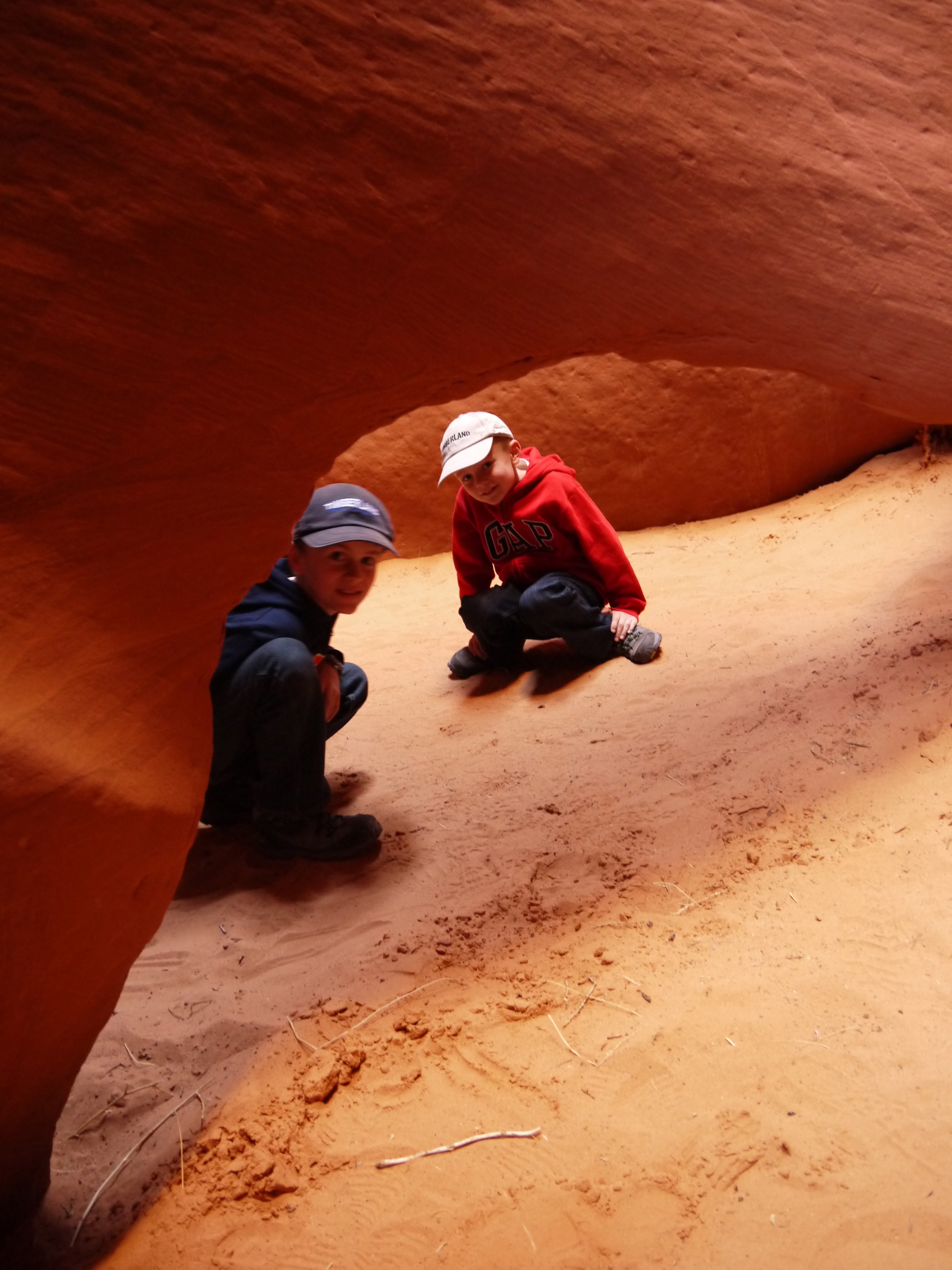 P1000983Comme il est déjà 13 heures quand nous revenons sur le parking, on tente d’aller à l’hôtel pour avoir notre chambre plus tôt que prévu et on fait bien car elle est disponible. On pique-nique donc sur le balcon avec la vue sur la piscine et le jardin et, en début d’après-midi, on se rend à Antelope canyon. On a choisi de visiter le lower canyon (le upper est plus fréquenté car de plain pied) car il est plus ludique avec toutes ses échelles pour descendre au fond du canyon et remonter. Au départ, je n’étais pas chaude du tout, ma tendance à la claustrophobie m’empêchant d’envisager une telle expérience… mais je me suis laissée convaincre par Laurent et les enfants. Finalement, à part le début qui est très impressionnant, le reste du canyon, bien que très étroit par endroits, est tout à fait faisable. La visite en photos :