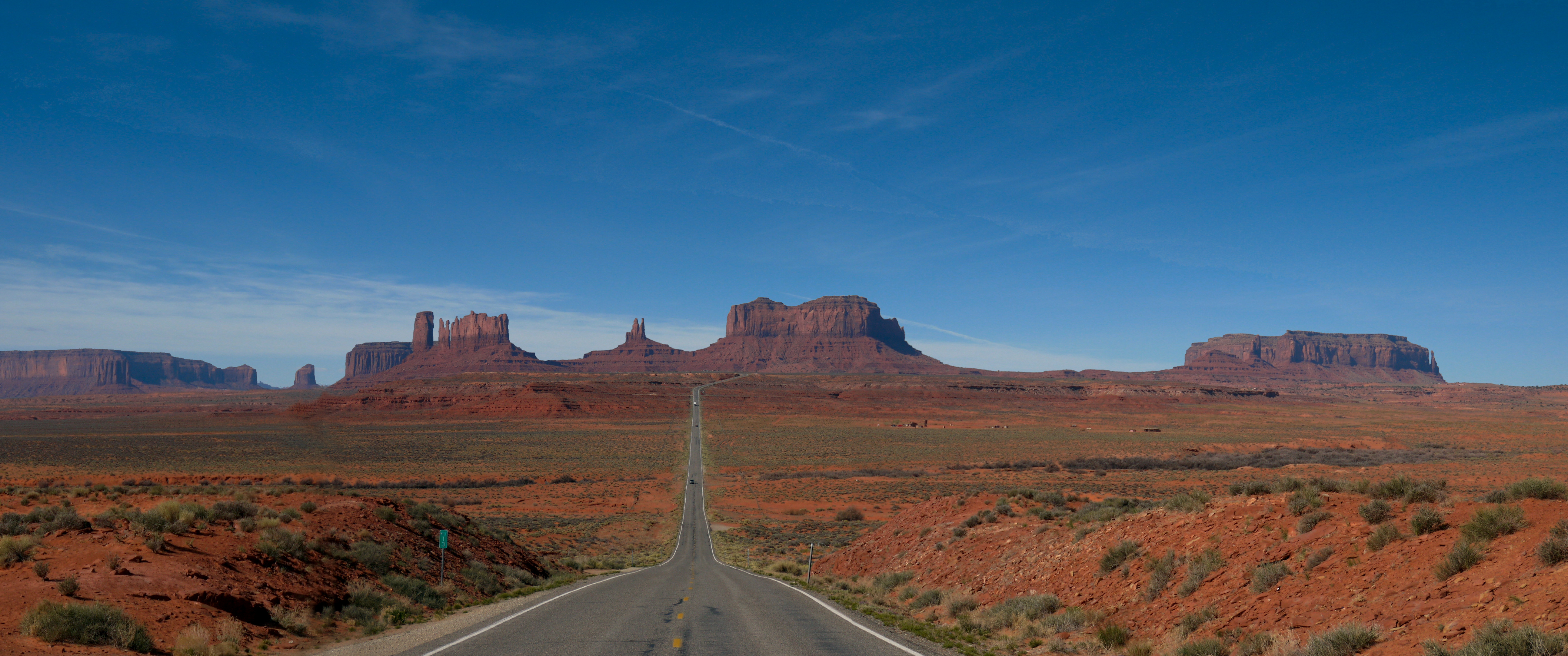 En se réveillant ce matin, le paysage nous semble toujours aussi irréel ! Je me souviendrai longtemps du matin de mes 39 ans (même si les enfants ont oublié de me le souhaiter) !!! Monument Valley est vraiment une merveille et on a du mal à s’arracher à la contemplation pour poursuivre notre road-trip. Il faut pourtant y aller, mais pas sans avoir fait un détour sur la route de Mexican Hat pour prendre une dernière photo, THE photo panoramique depuis le Forrest Gump point (point de vue au milepost 13 sur la route, là où Forrest fait demi-tour dans le film) :