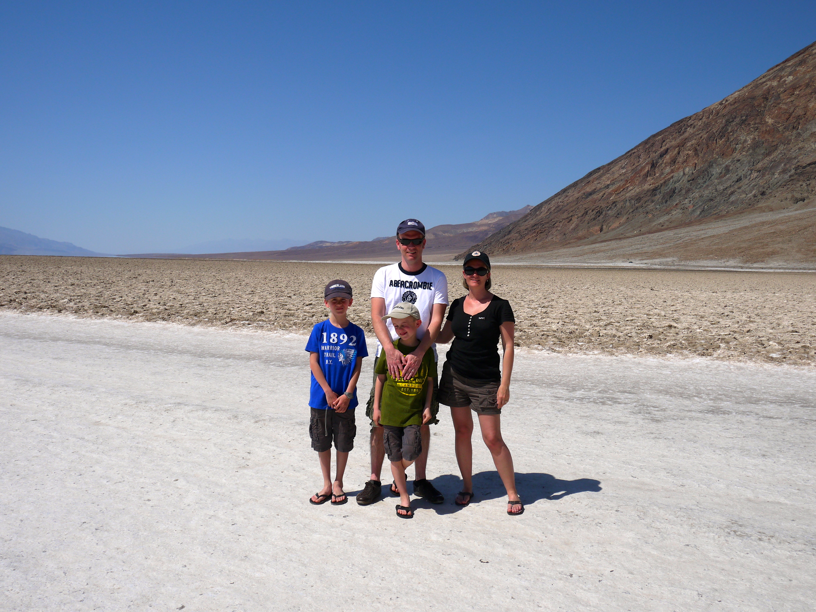 A Badwater on est à 86 mètres sous le niveau de la mer – c’est un ancien lac salé asséché où il ne reste que le sel sur lequel on marche – et il fait très chaud, même en avril ! C’est alors que j’ai un souci avec mes chaussures qui collent au sol ! Je dis à Laurent : « Ouuuhhh là j’ai un problème, je crois que la semelle de mes tongs est en train de fondre !!! « . Et lui, mort de rire, me répond que le sel est humide et que c’est pour ça que ça colle et que ça glisse !!! Il fait tellement chaud que j’ai vraiment cru que j’allais me retrouver pieds nus !