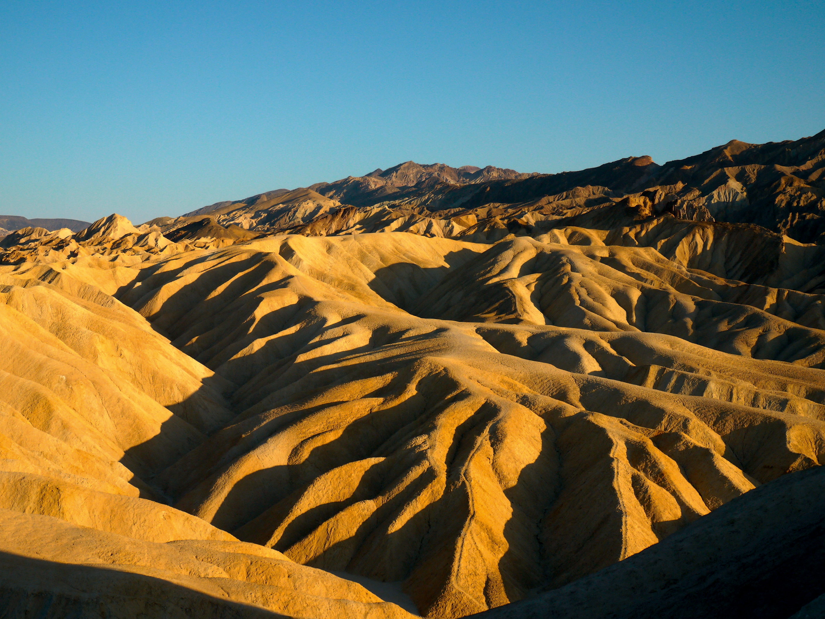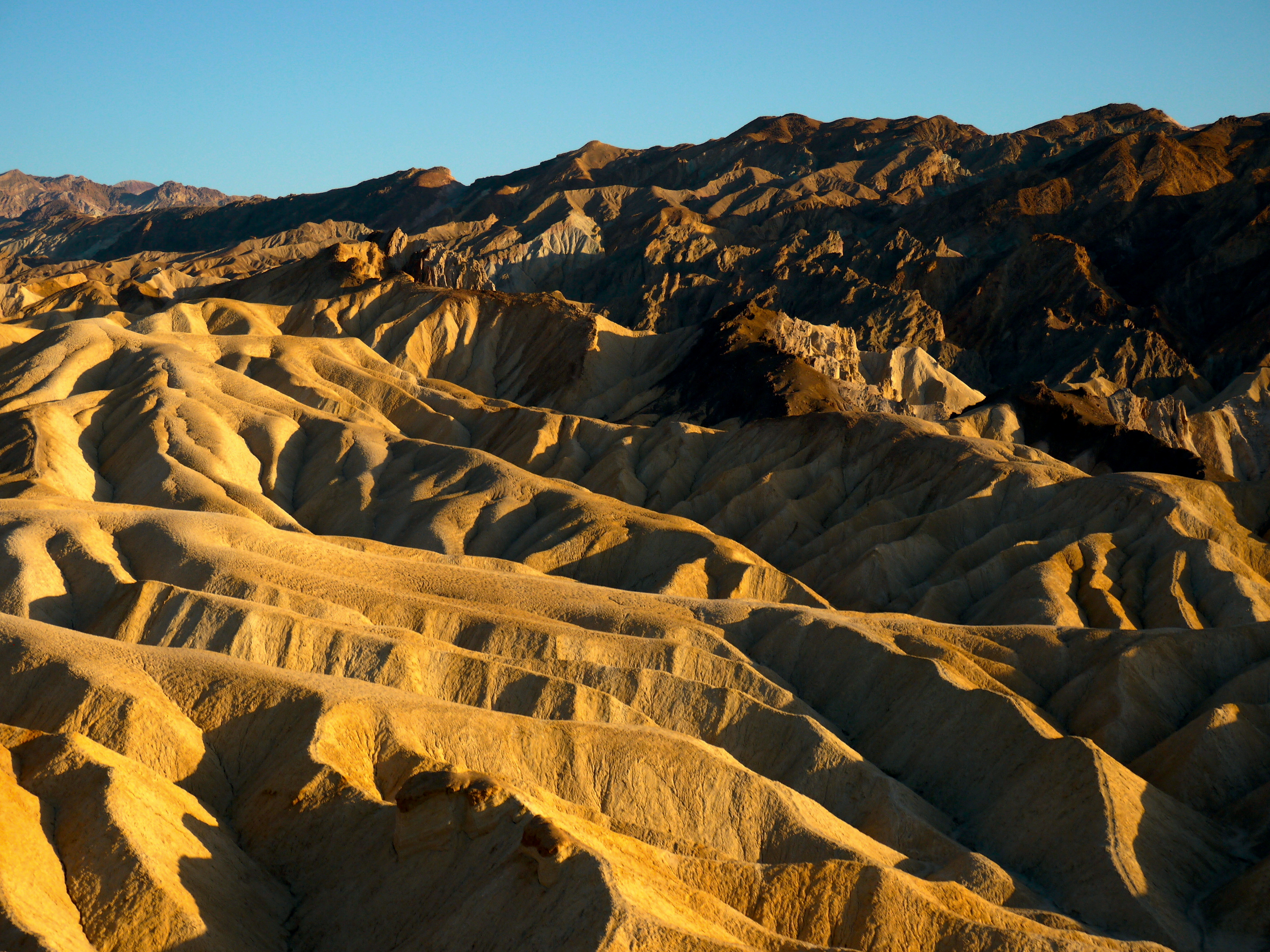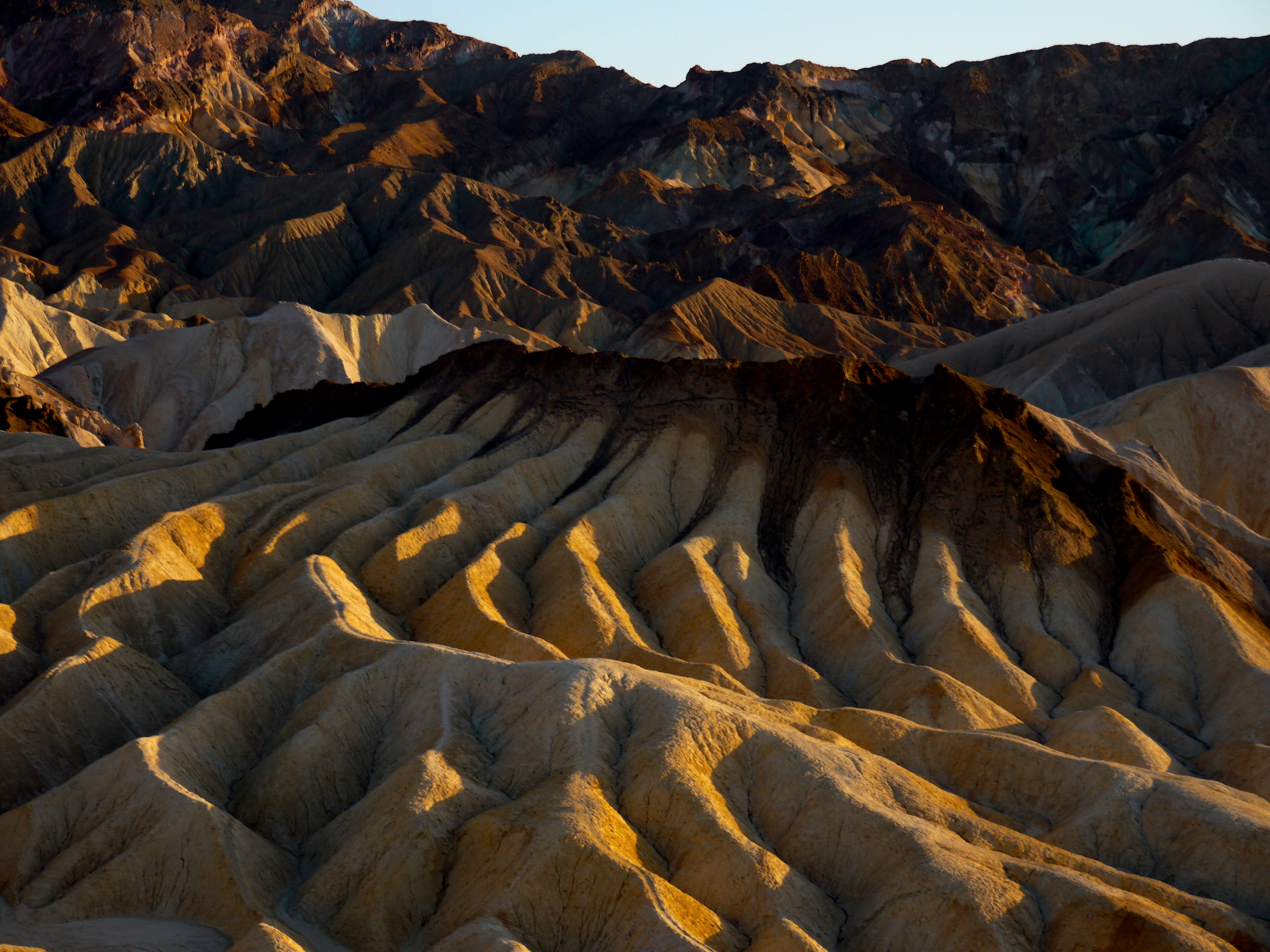 - Zabriskie point au coucher du soleil – sur la deuxième photo, on voit bien la lave pétrifiée sur la crête du rocher :