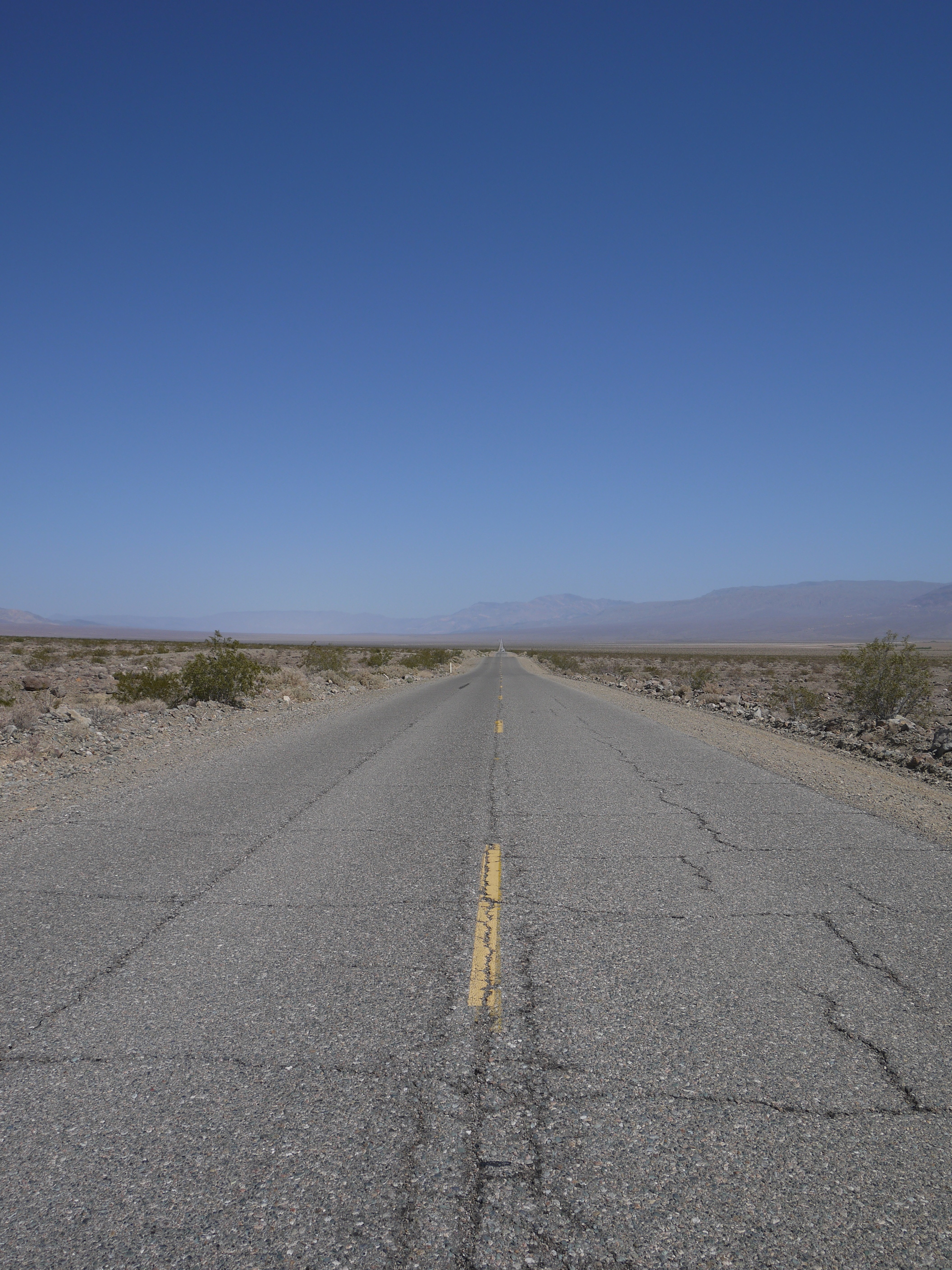 Le problème avec tous ces déserts, c’est l’essence ! On savait qu’il fallait prévoir de faire le plein avant d’entrer dans la vallée de la mort, et c’est ce que nous avons fait ; mais le réservoir de la voiture n’est pas immense et les stations sont assez éloignées les unes des autres… ça donne quelques frayeurs quand on voit des lignes droites à n’en plus finir sans l’ombre d’un village ni d’une pompe à essence !!! On a donc mis 30$ d’essence à Panamint Springs (sortie ouest de Death valley) à 6$ le galon contre 3,5$ à Las Vegas… gloups !