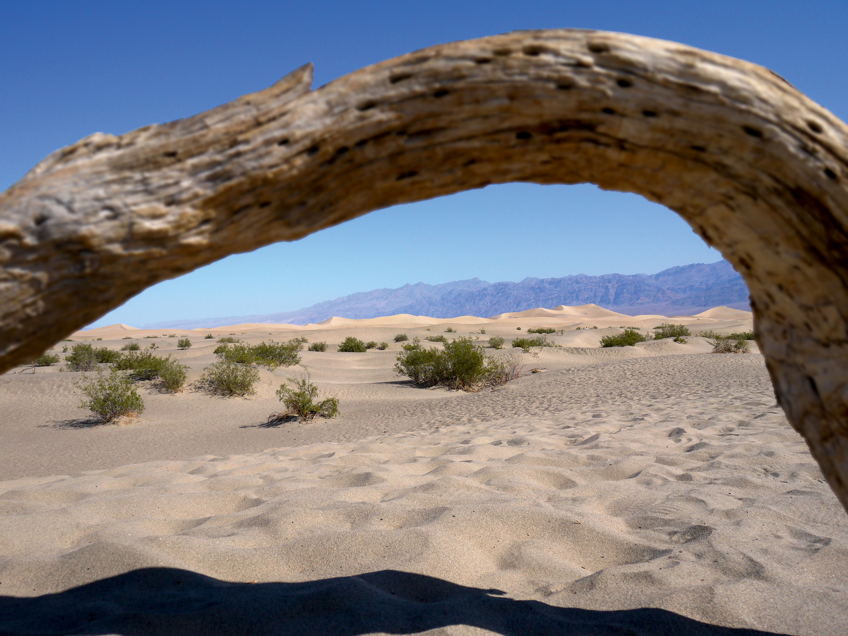 Avant de sortir de la Death valley, on a fait un arrêt à Stovepipe Wells où on peut voir les Mesquite flat sand dunes : les seules dunes de sable de la vallée de la mort. On a cherché la mer mais on n’a pas trouvé 😉 C’est en partie ici qu’ont été tournés les Star Wars (et aussi du côté du Lac Powell où nous étions la semaine dernière). Je faisais des photos, en tongs dans le sable, quand Léo me dit : « maman, c’est quoi les traces là dans le sable ? ». Je