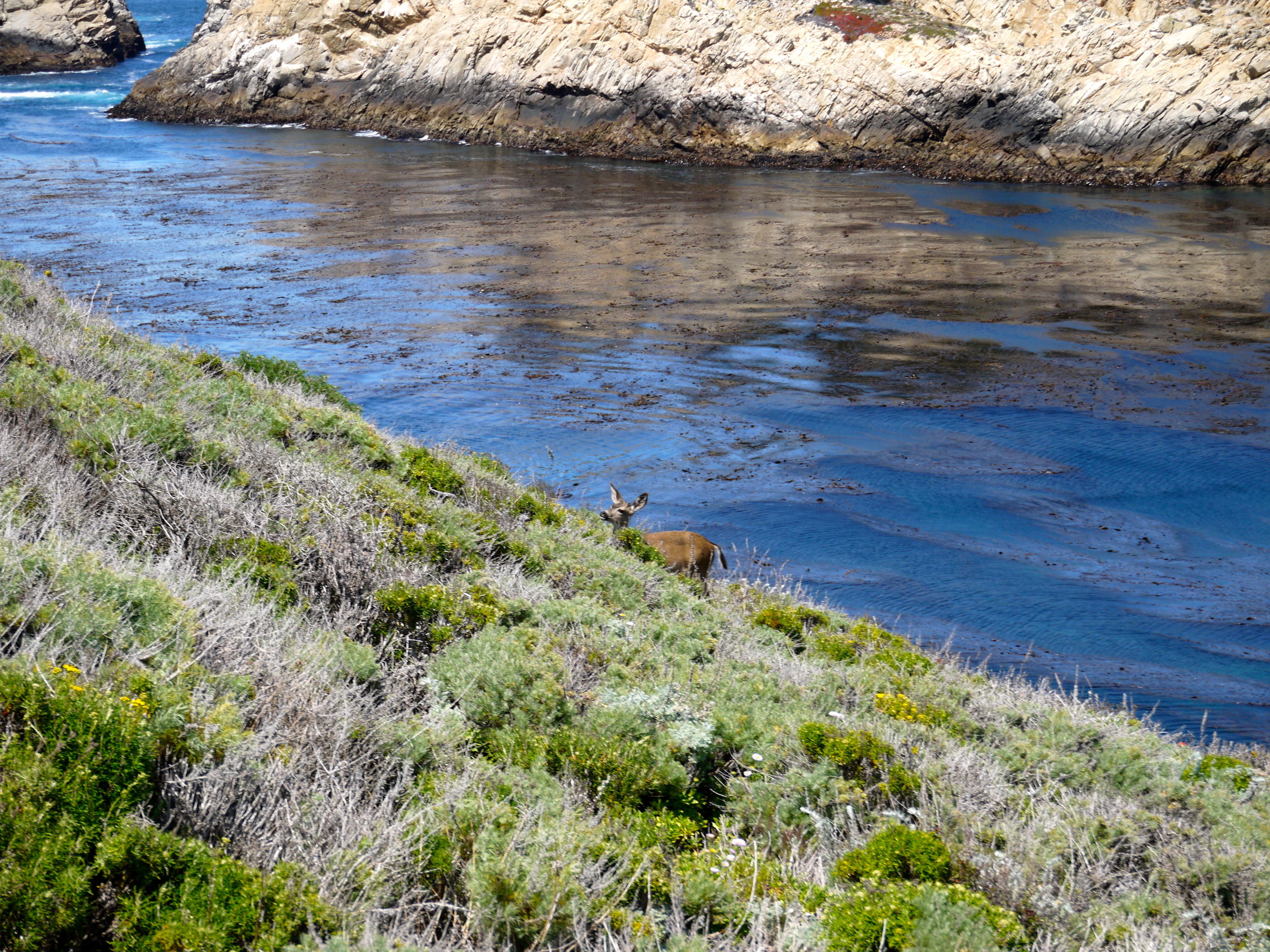 On peut voir sur la photo au dessus que le brouillard n’est jamais loin et menace d’envahir la côte à tout moment. On aperçoit aussi des lions de mer qui se font dorer au soleil (l’accès à la plage était interdit car les mamans venaient d’avoir des petits). Les algues géantes qu’on voit sur la photo ci-dessous servent de refuge aux loutres de mer. Et d’ailleurs il y en a une qui se baigne au milieu.