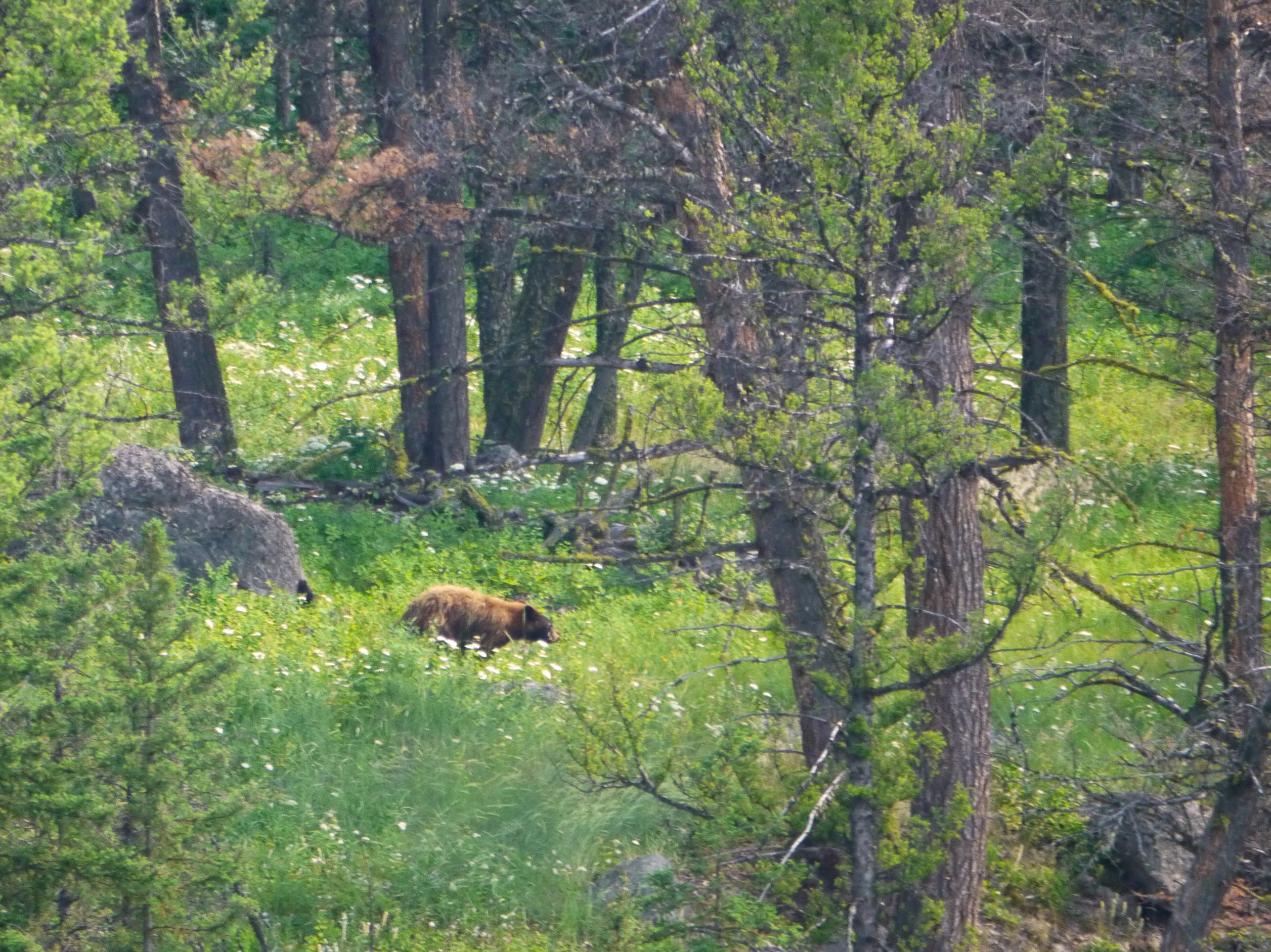 Mais plus loin, le scénario se répète. Des voitures garées en vrac sur le bas-côté, on s’arrête nous aussi et on observe un moment un petit ours brun (pas de photos, il était loin). On poursuit un peu et, au bord de la Lamar River, 2 voitures sont arrêtées. On se joint aux 2 paparazzis et un monsieur me montre un nouvel ours brun, bien plus gros que le premier.
