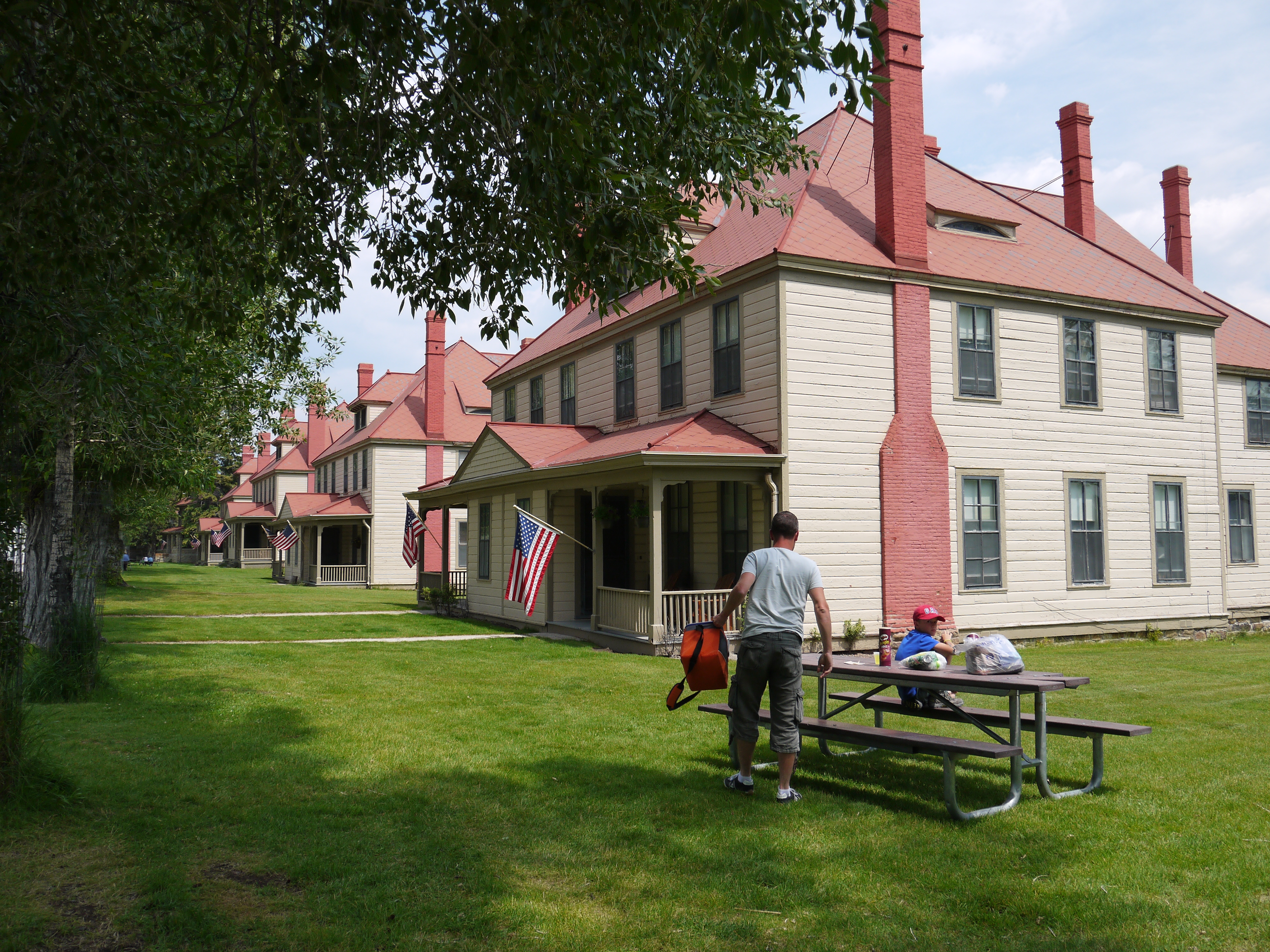 P1040962 P1040957En fin de matinée, nous poursuivons vers Mammoth Hot Springs où nous pique-niquons à côté des maisons historiques qui, après avoir abrité l’armée américaine, abritent aujourd’hui les rangers et leurs familles. On a mangé en compagnie des écureuils et des biches qui se baladent d’une pelouse à l’autre.