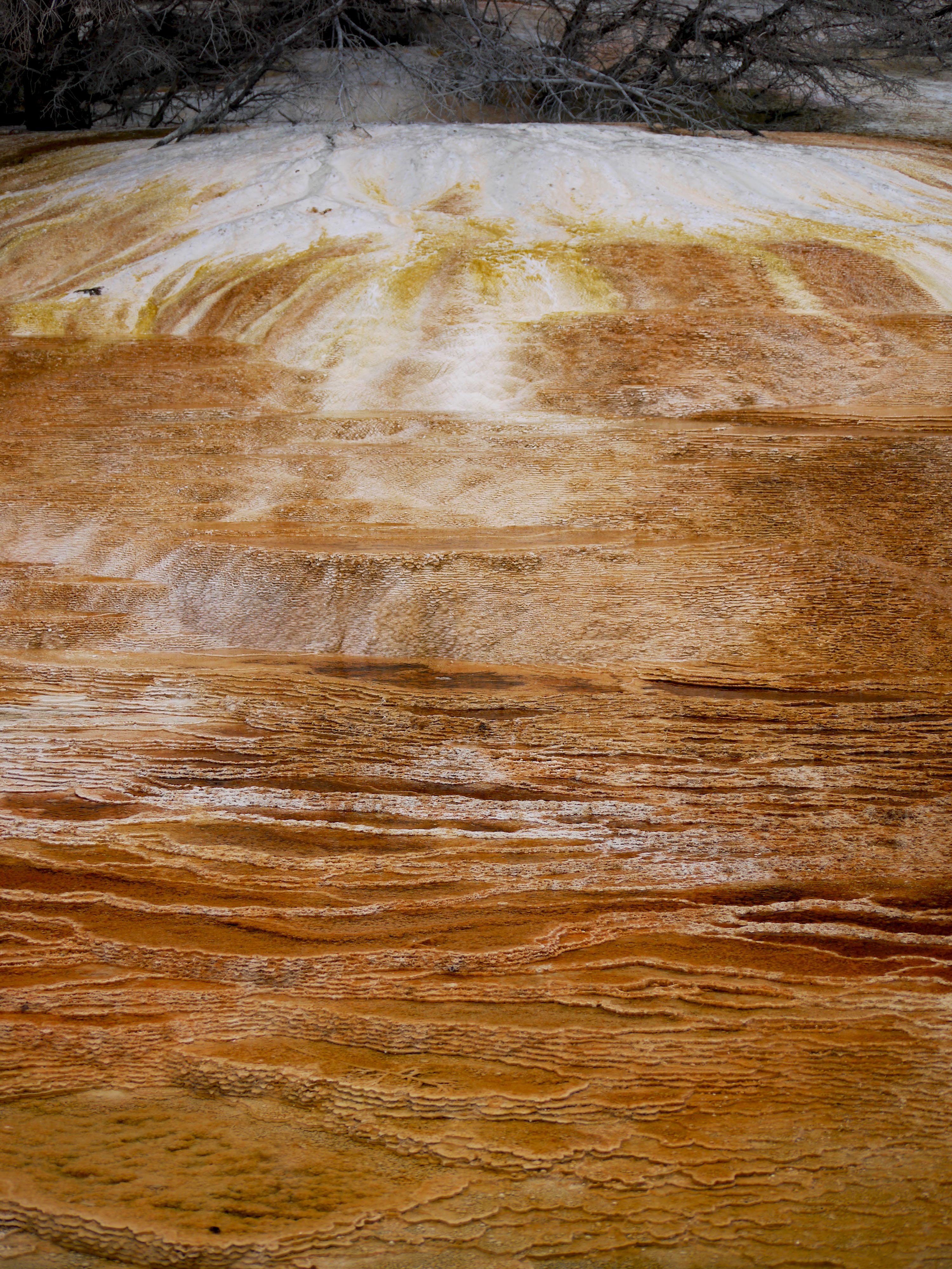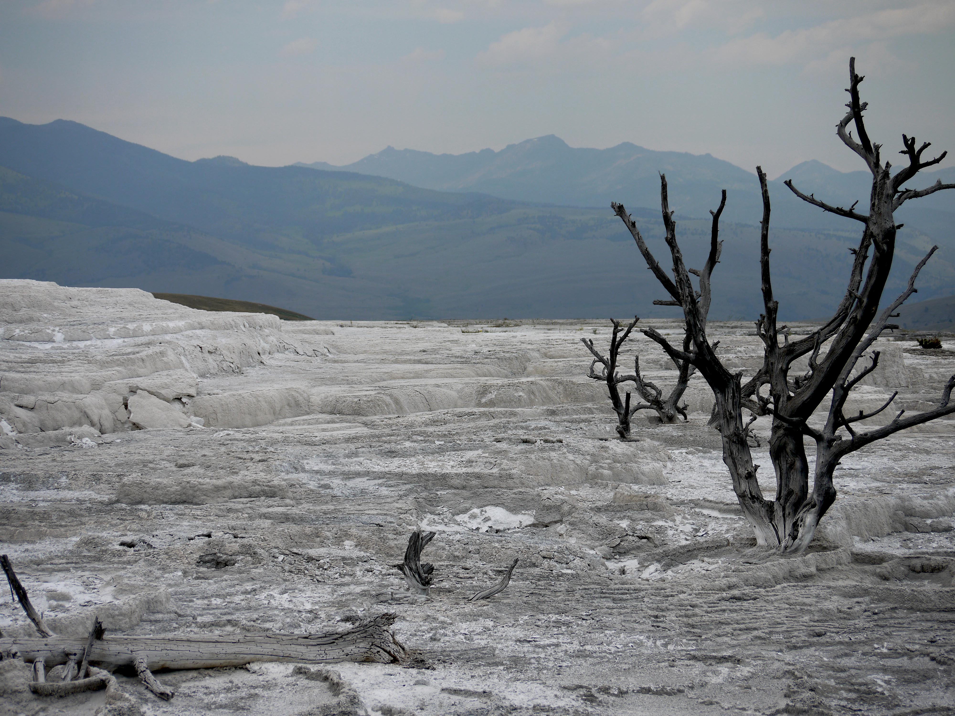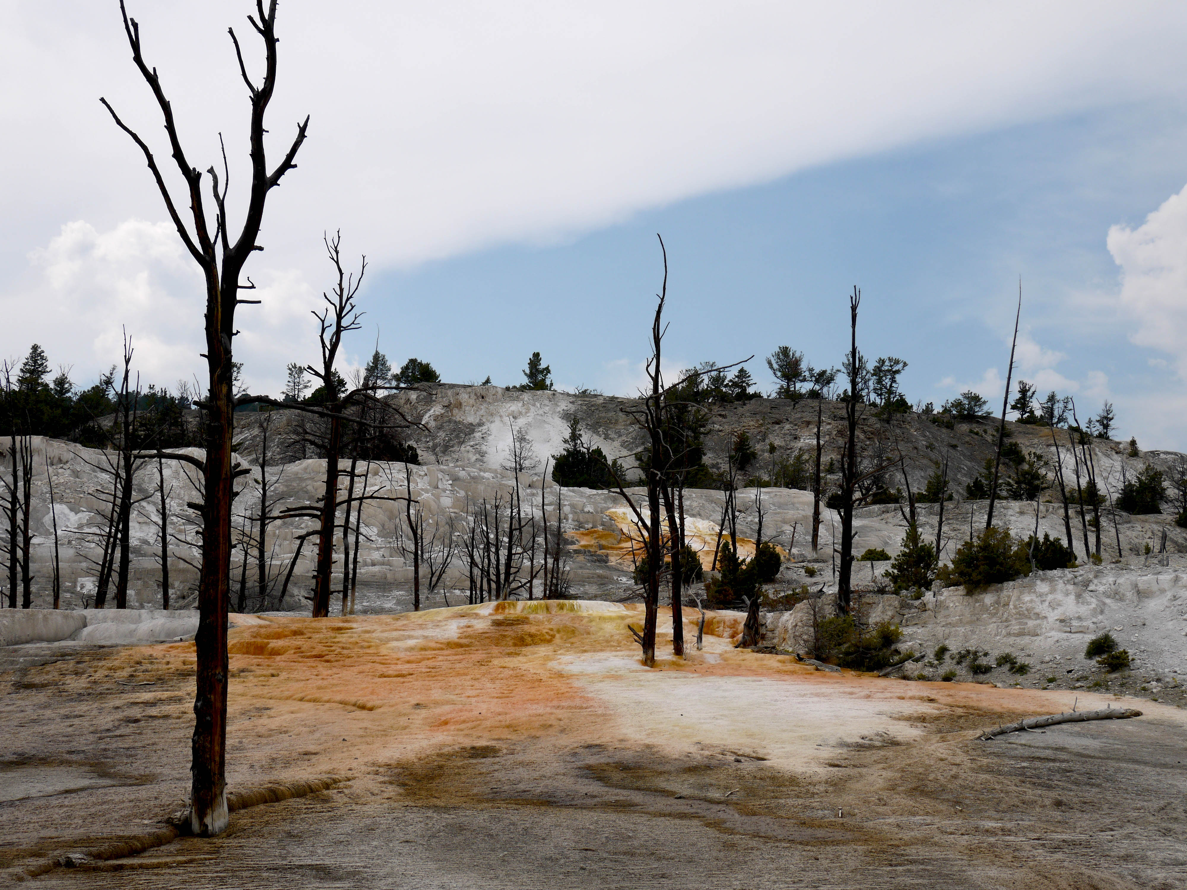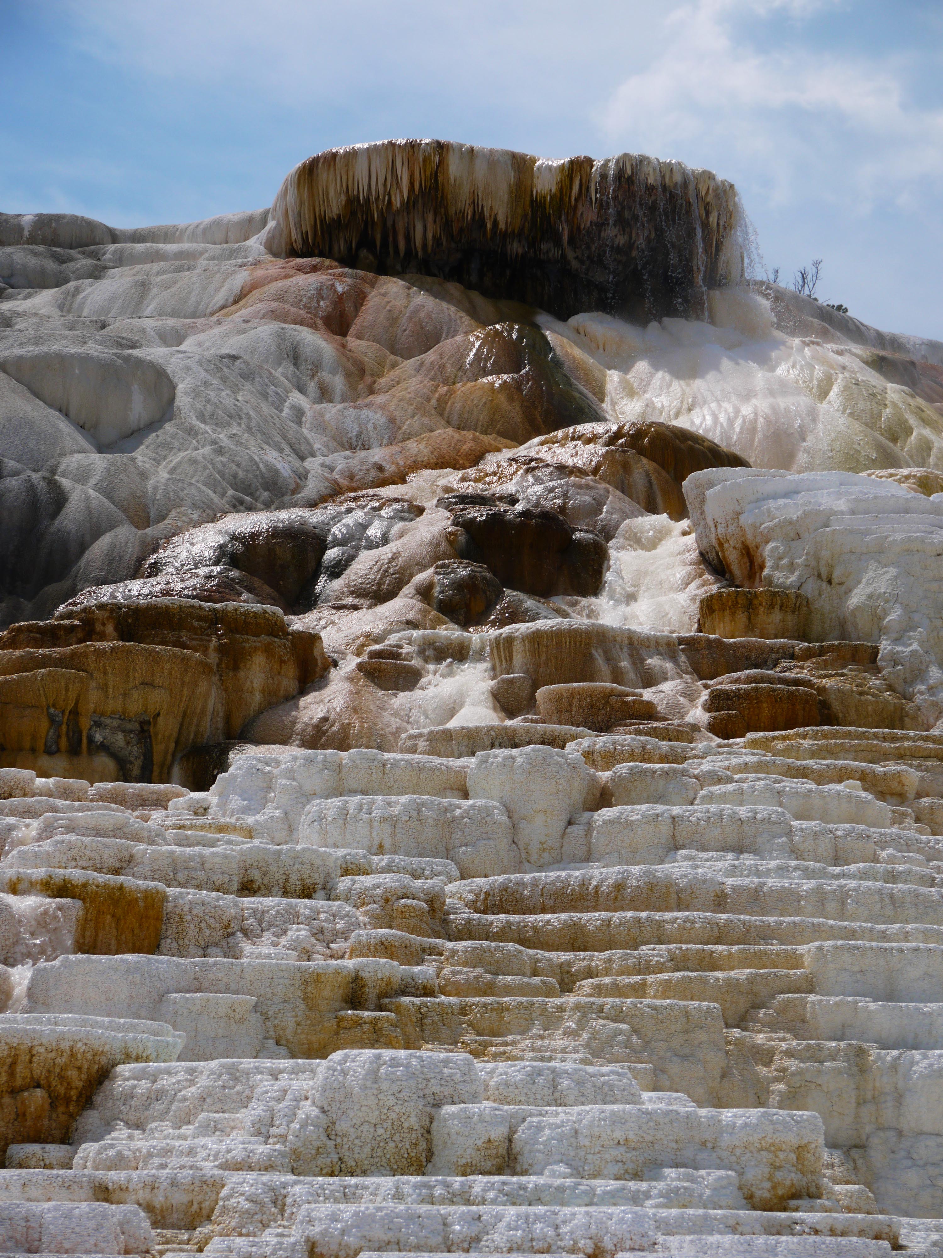 P1040979A Mammoth Hot Springs, des sources d’eau chaude ont façonné un paysage qui fait penser à Pammukale en Turquie. Les bactéries présentes dans l’eau colorent la roche calcaire de jaune et d’orange ; mais l’eau coule de moins en moins et les zones colorées laissent peu à peu la place à un gris bien triste.