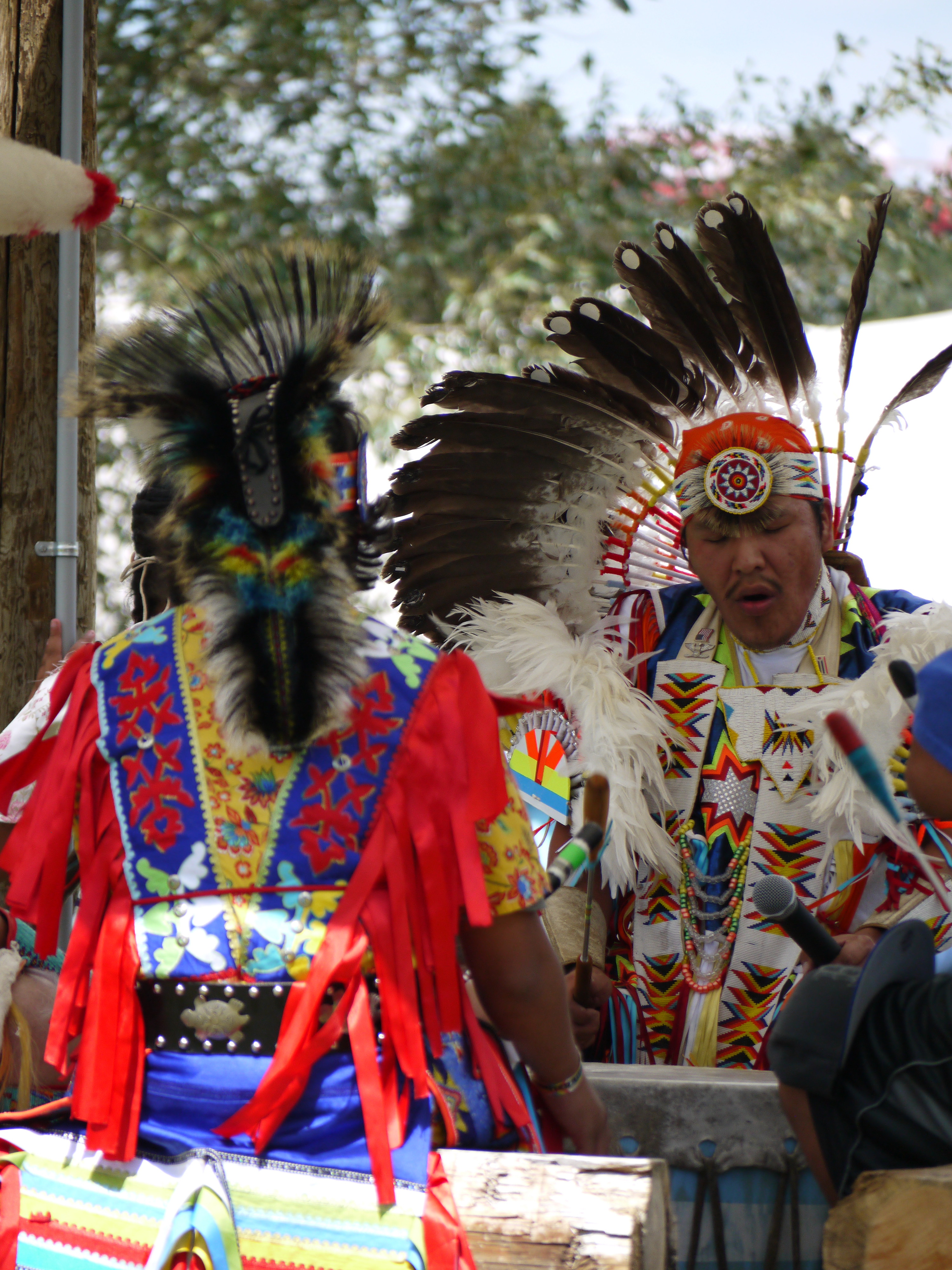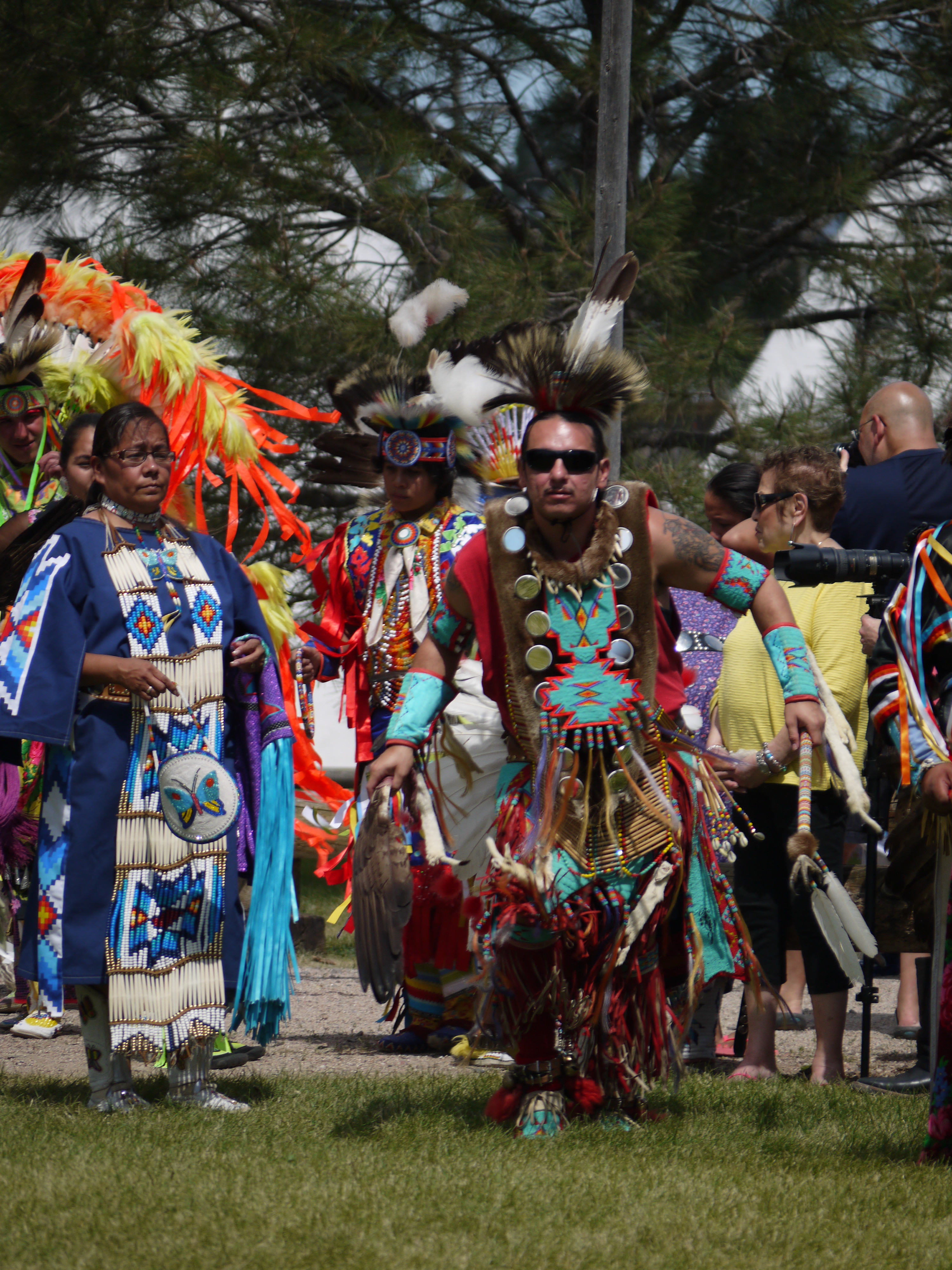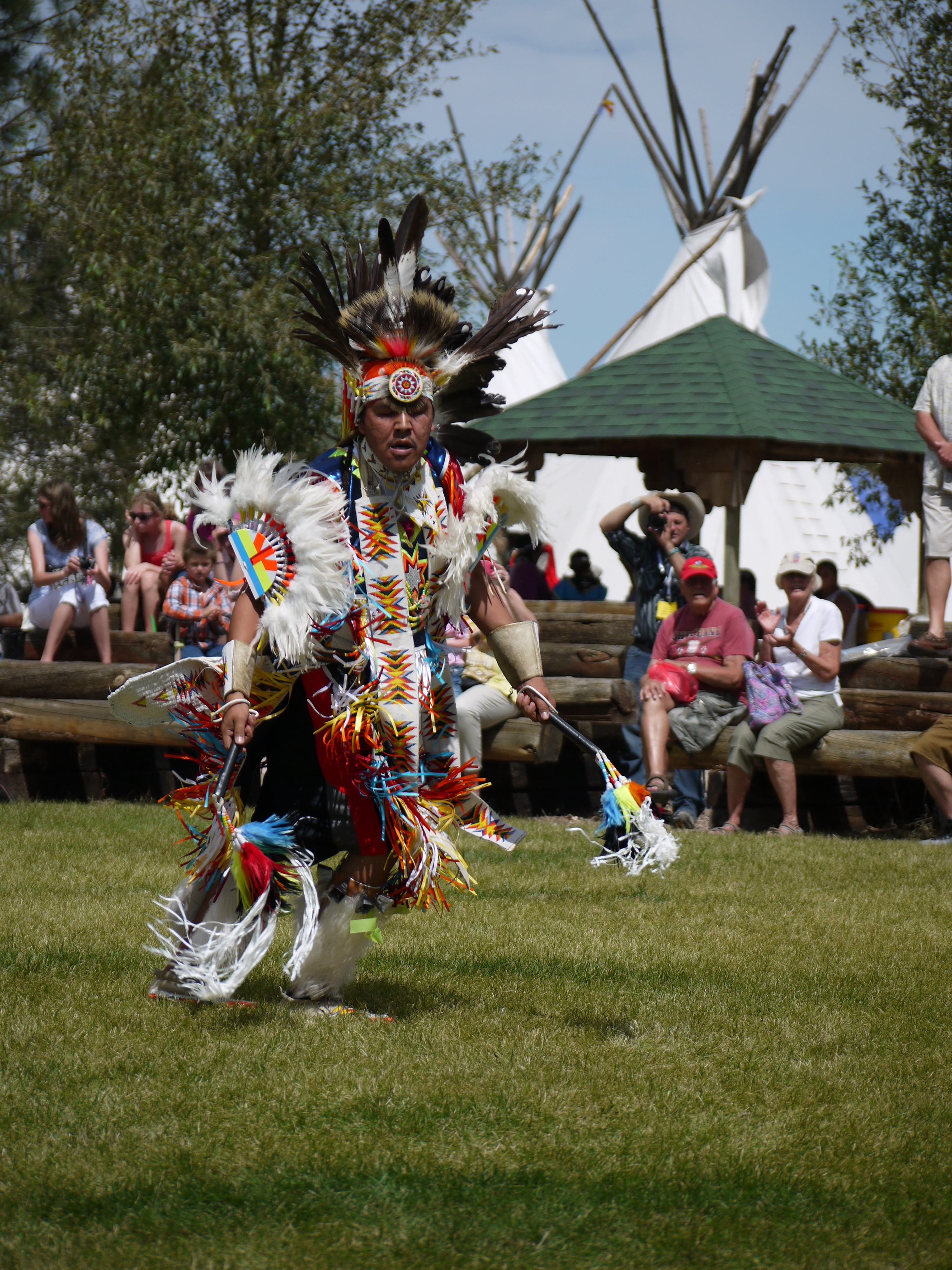 Avant le grand spectacle des grands cowboys sur leurs grands chevaux et leurs gros buffles, il y a le petit spectacle : celui des indiens et de leurs danses traditionnelles. Je les soupçonne d’ailleurs de faire la danse de la pluie depuis 2 jours car on a subi quelques orages violents depuis Hulett !!! En tous cas, dès qu’ils se mettent à chanter en tapant sur leur grosse caisse et à danser sous leurs parures, la magie opère. On est pris aux tripes par les chants lancinants et le côté mystique des danses.