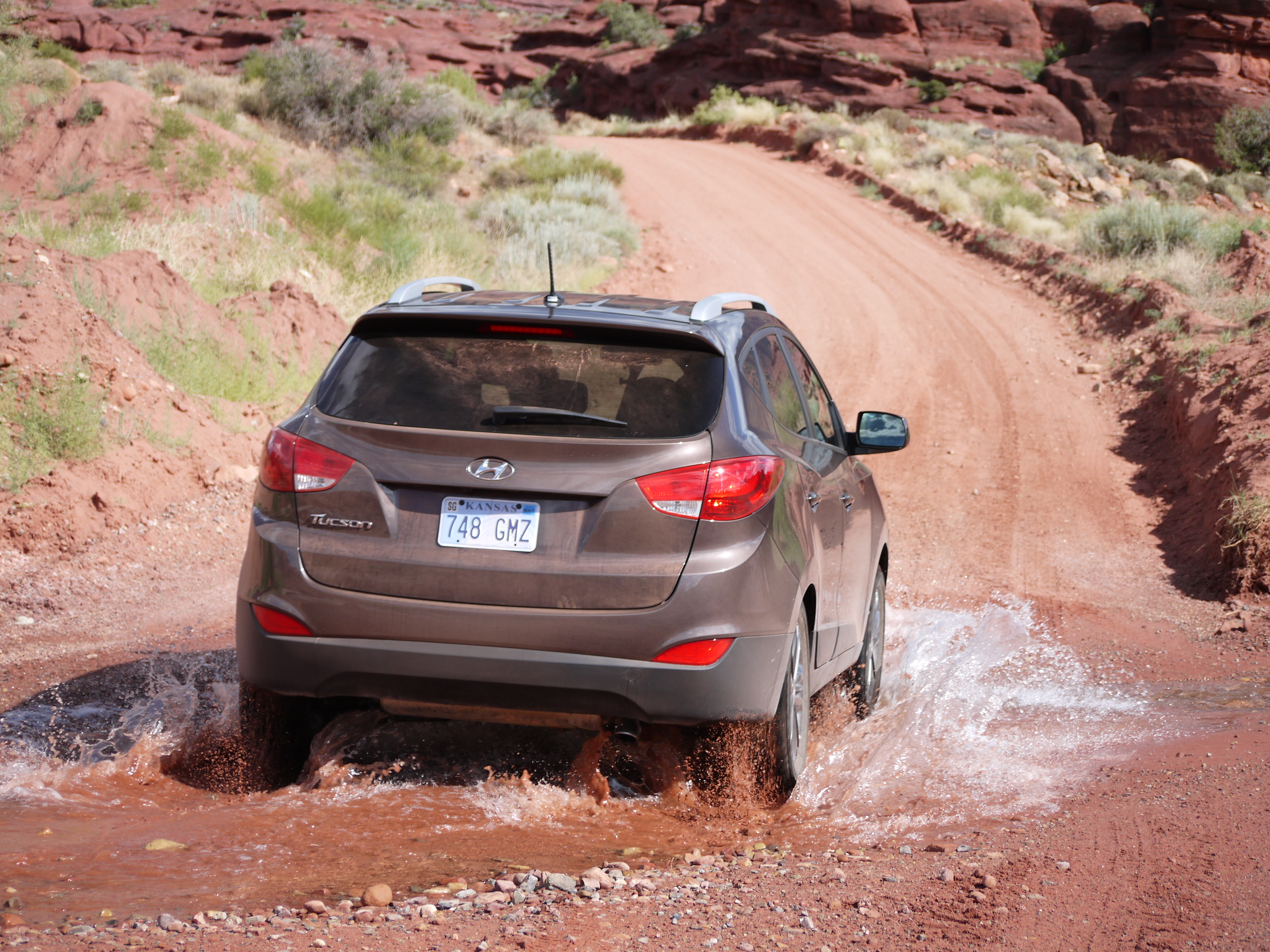 Après s’être fourvoyés sur une fausse piste, nous trouvons enfin l’entrée d’Onion Creek mais n’irons pas très loin. C’est notre « baptême de piste » et je ne suis pas rassurée. On ne voit pas à travers l’eau, qui est couleur terre (rouge), et j’ai peur d’éclater un pneu sur un caillou. Mais le peu de trajet que nous avons fait sur cette piste nous a beaucoup plu.