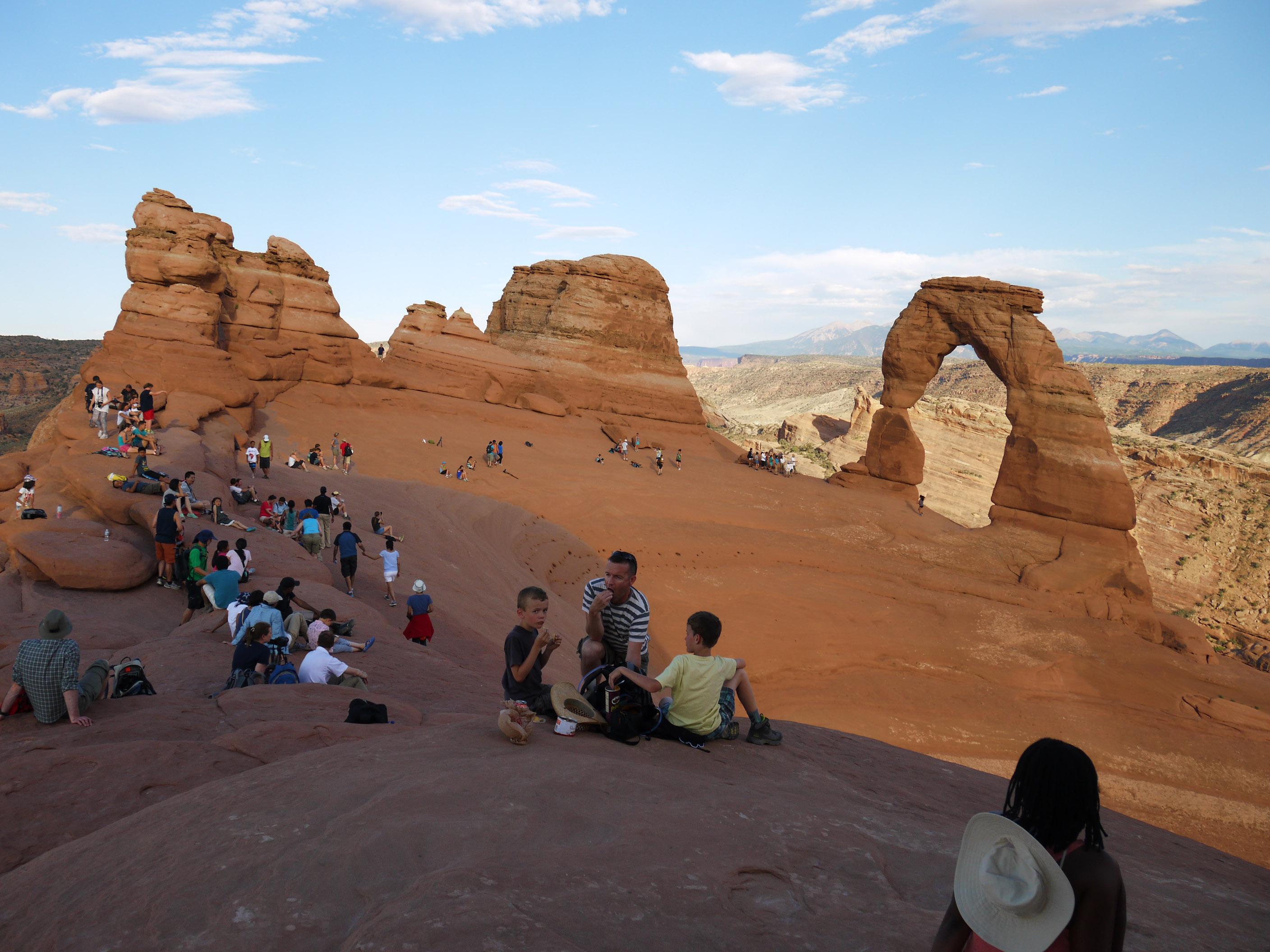 Sur la première photo ci-dessous, on devine les gens qui montent sur le slickrock en haut à gauche. C’est le prix à payer pour voir la star de l’Utah !