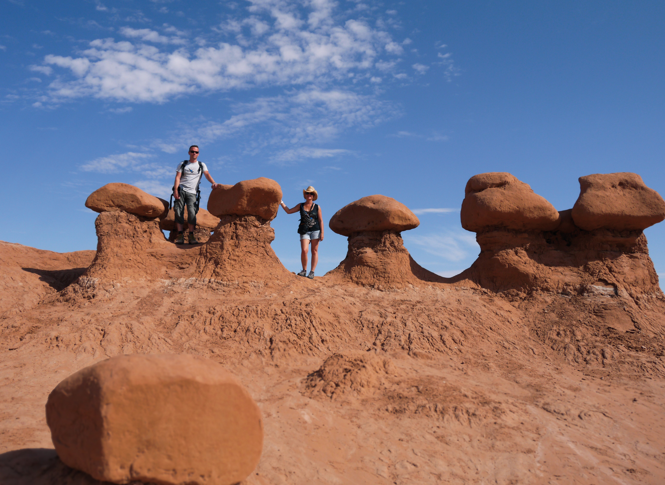 A 8h45, nous avons pris la direction de Goblin Valley state park, sans trop de regret de quitter Hanksville. Ce petit parc, qui ne ressemble à aucun autre, est peuplé de rochers en forme de champignons, ou de gnomes, c’est comme on veut. C’est fou ce que l’érosion peut créer comme paysages originaux. On se croirait sur une autre planète ! Les garçons ont adoré courir, se cacher et grimper entre les rochers. Ils seraient bien restés plus longtemps mais il commençait déjà à faire chaud et il n’y a pas d’ombre.