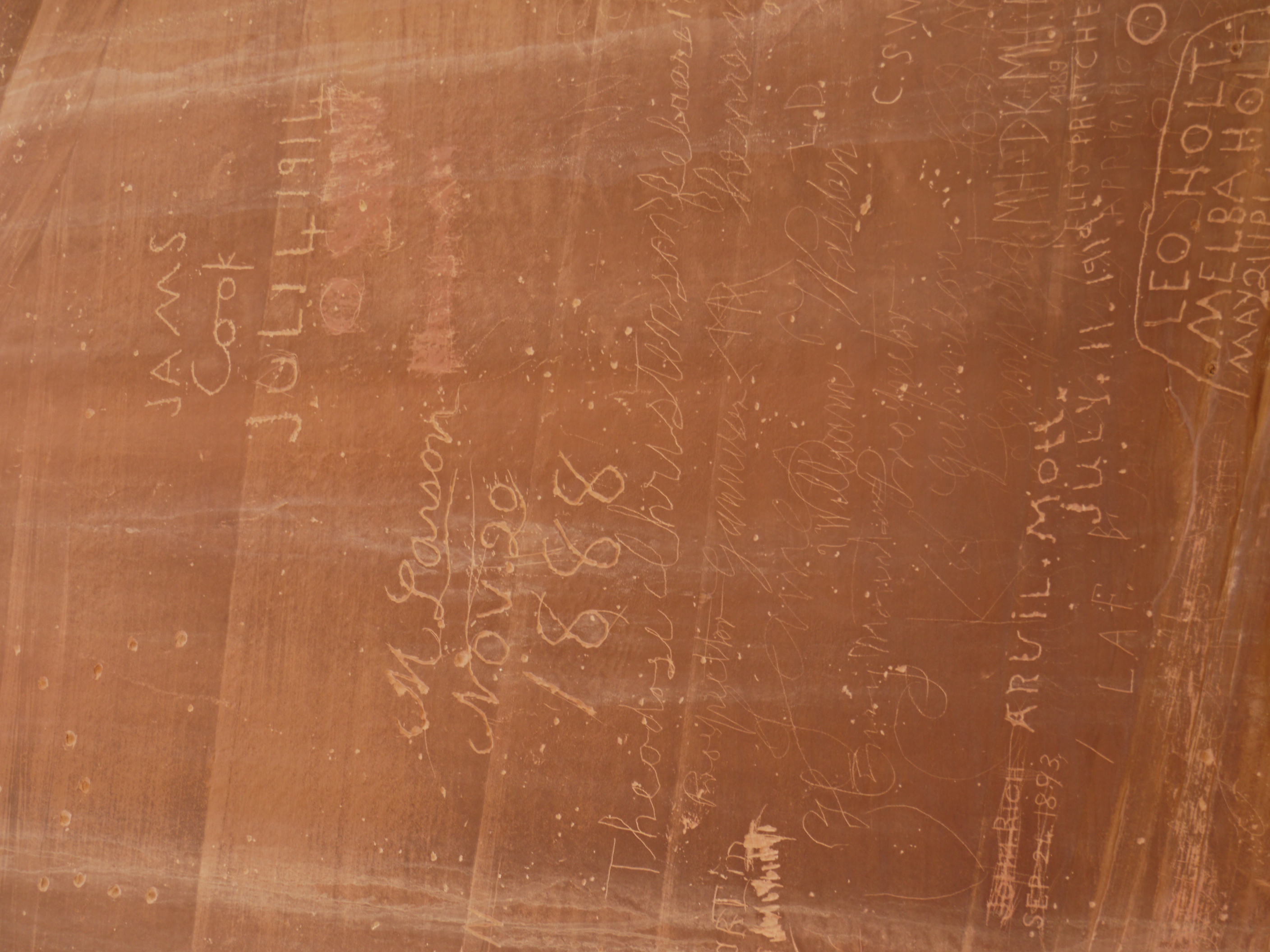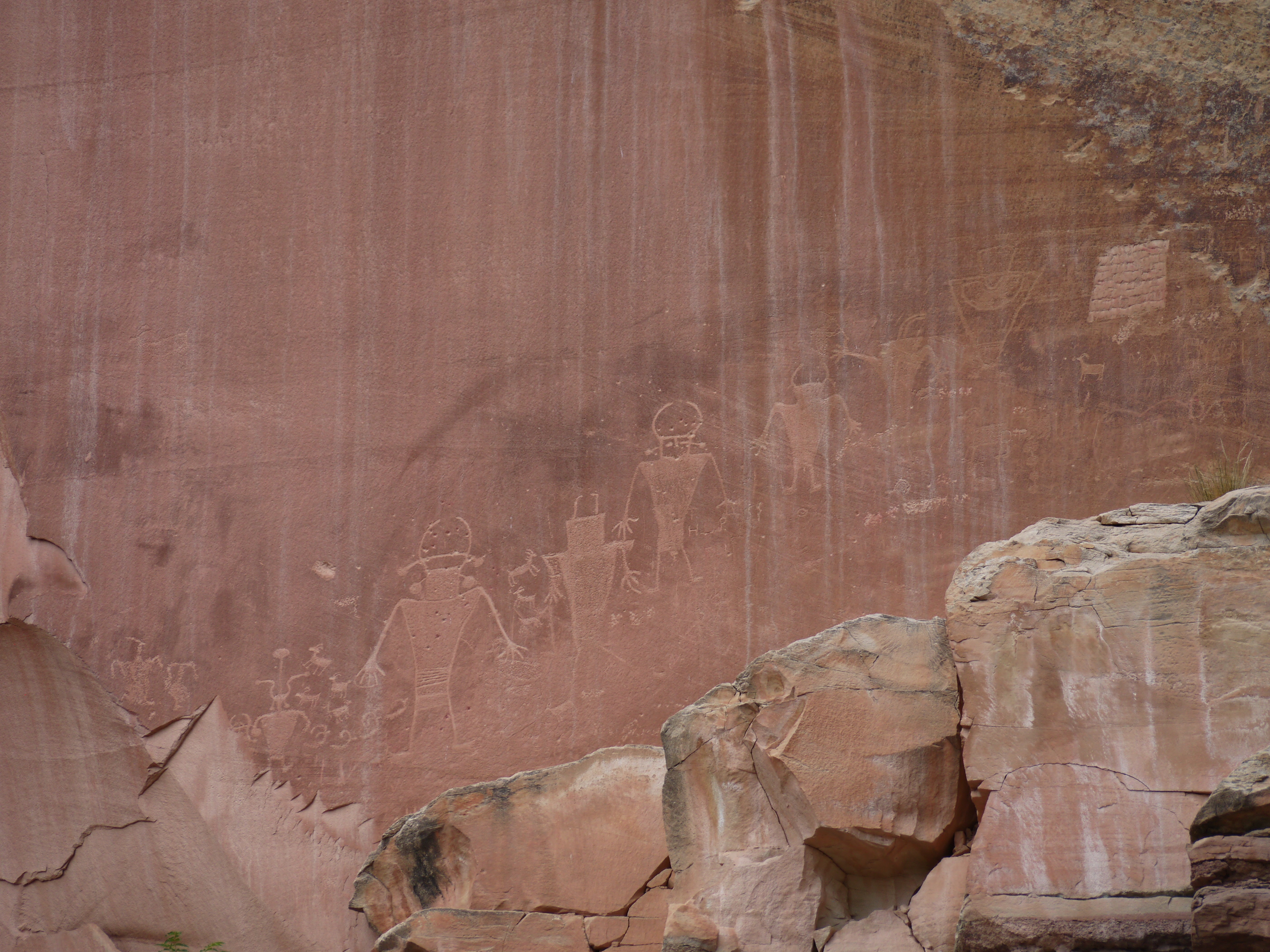 En début d’après-midi, après avoir roulé au milieu de paysages lunaires composés de roche grise, on retrouve des roches rouges à Capitol Reef national park. La route panoramique suit un plissement géologique très coloré et différent de ce qu’on a vu jusqu’à présent. Le parc a été habité par les amérindiens, puis par les mormons. On y trouve des témoignages gravés dans la roche : des pétroglyphes indiens et le Pioneer register, une falaise sur laquelle les pionniers mormons ont gravé leur nom pour marquer leur passage.