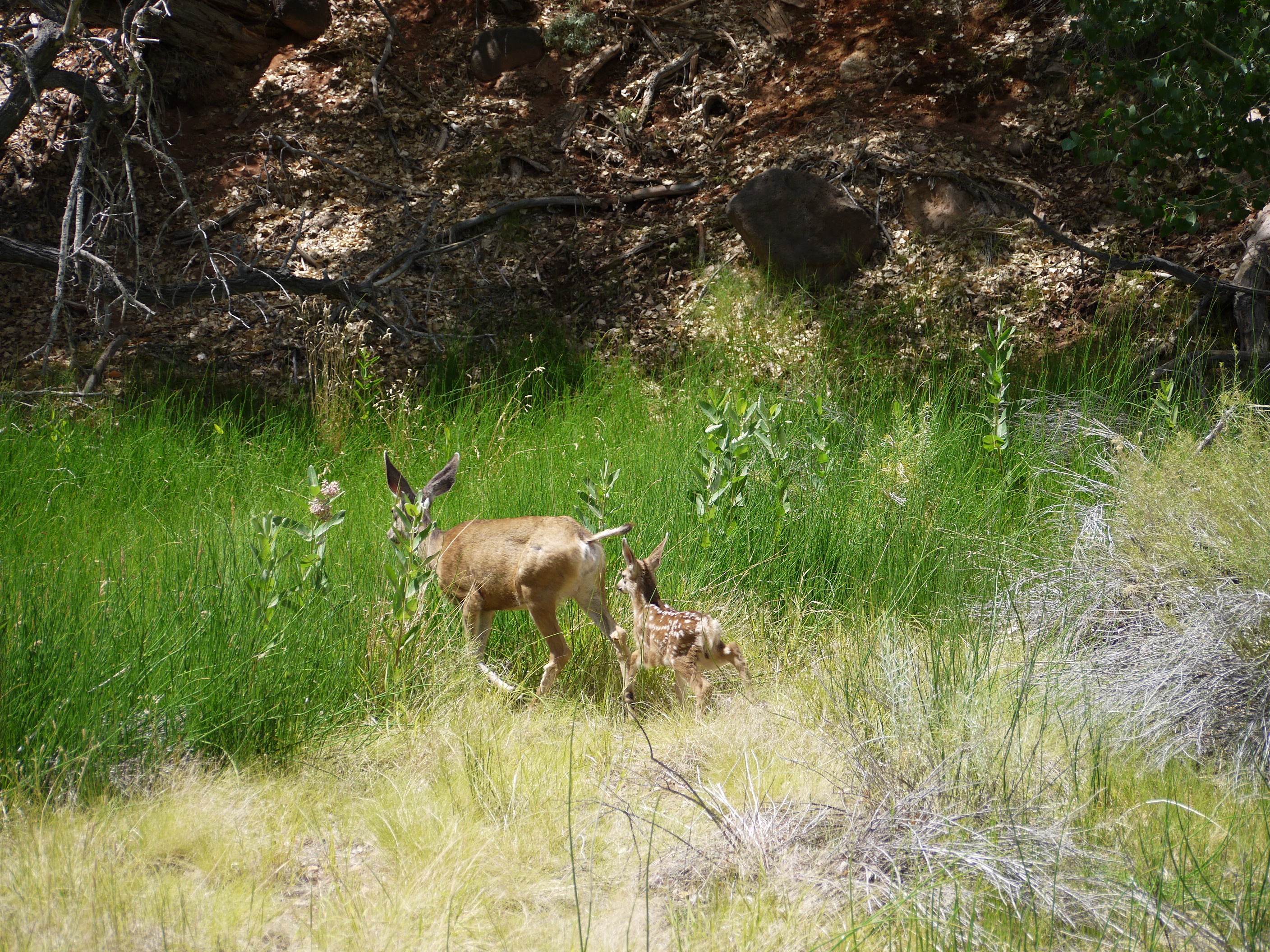 A l’entrée du parc, la rivière Fremont et la Sulphur Creek créent une oasis où on peut observer la faune. On a eu la chance de voir des marmottes à ventre jaune (énormes ! Je ne croyais pas ça aussi gros et je ne pensais pas en trouver sous ce climat semi-aride) et une biche avec son petit.