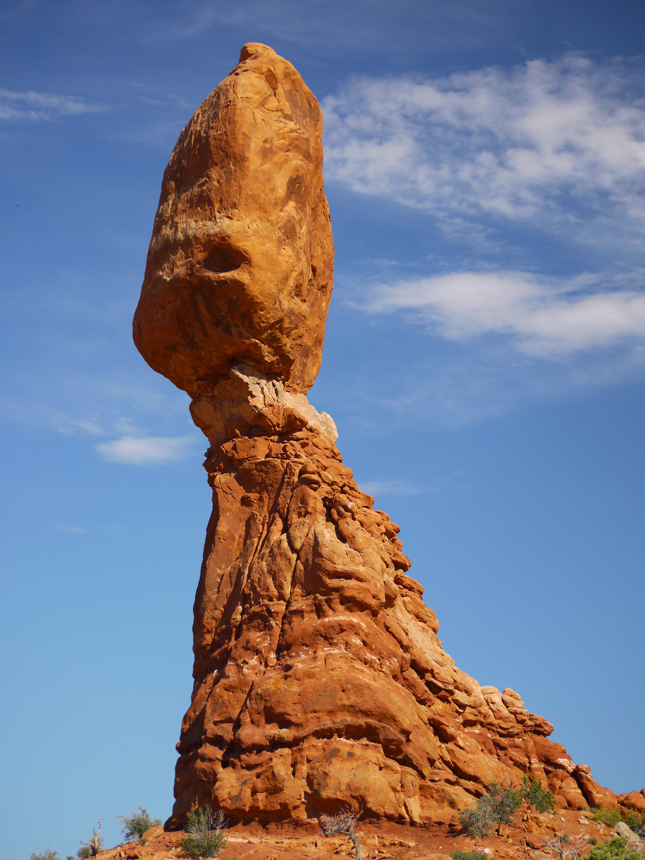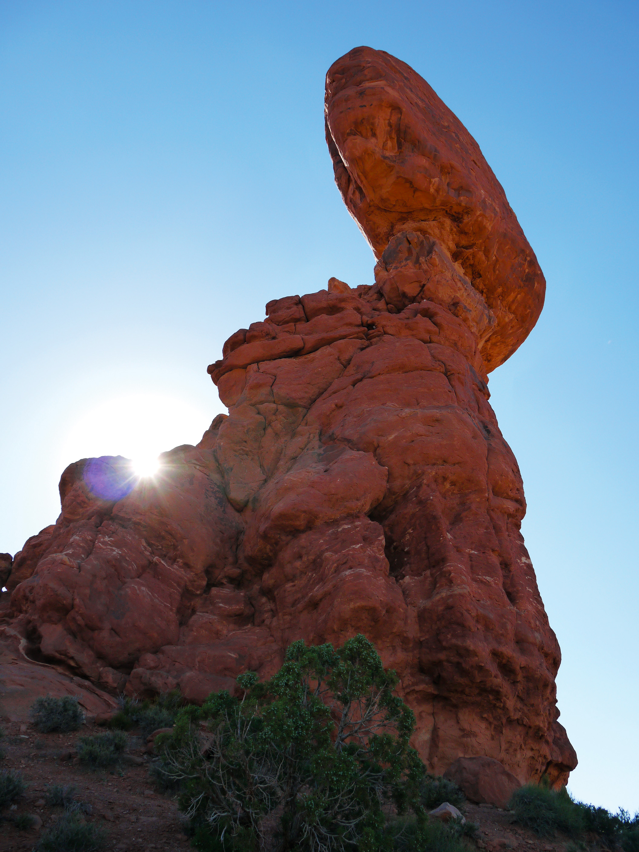 P1030485 En arrivant à Moab vers 14h30, on prend possession de notre grande chambre à l’Holiday Inn, on fait un tour à la piscine pour se rafraîchir (il fait 40° !), puis on part explorer un bout de Arches National Park. On visite le secteur de Balanced Rock, un rocher de 3 tonnes en équilibre sur sa base plus friable. Un jour, ça va tomber…