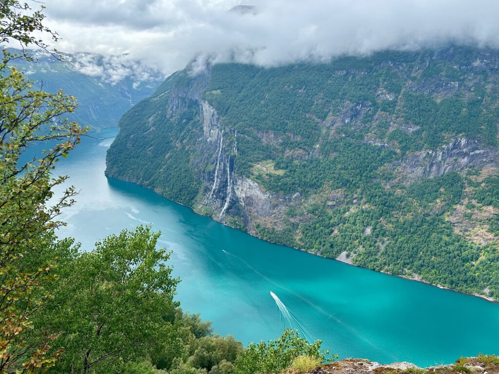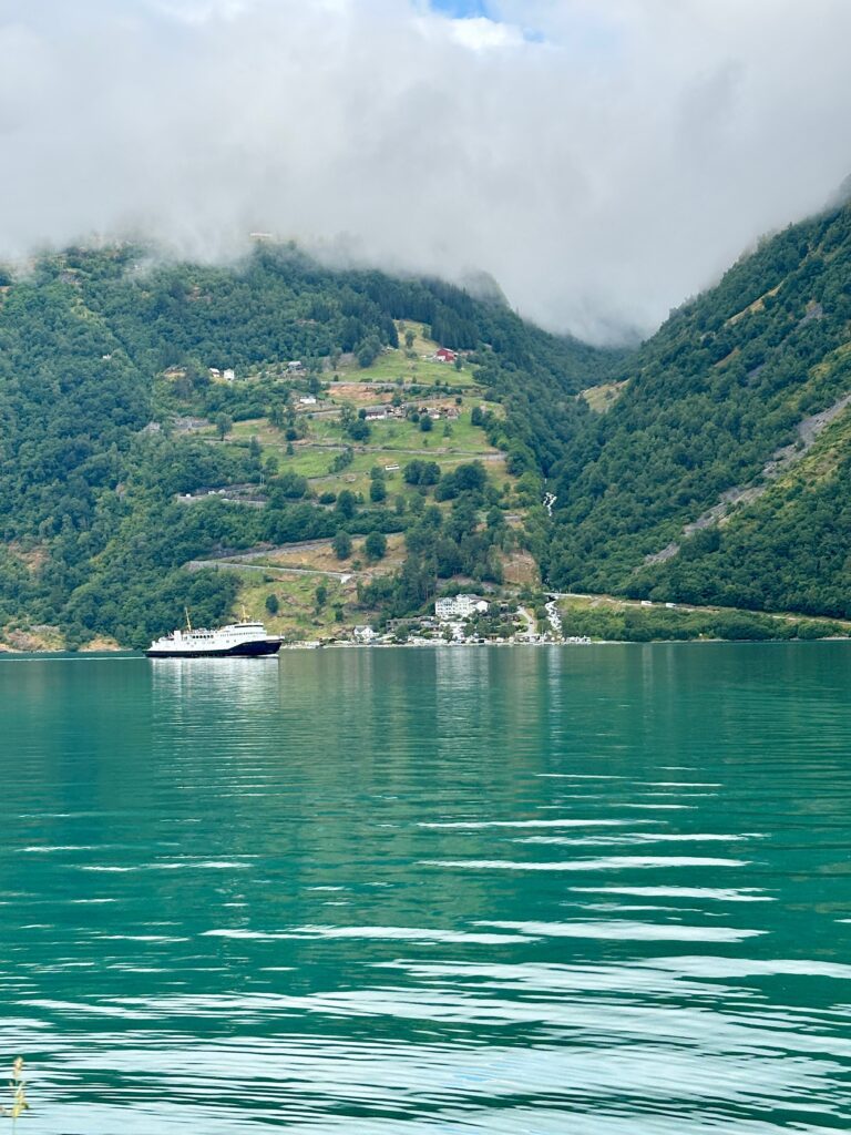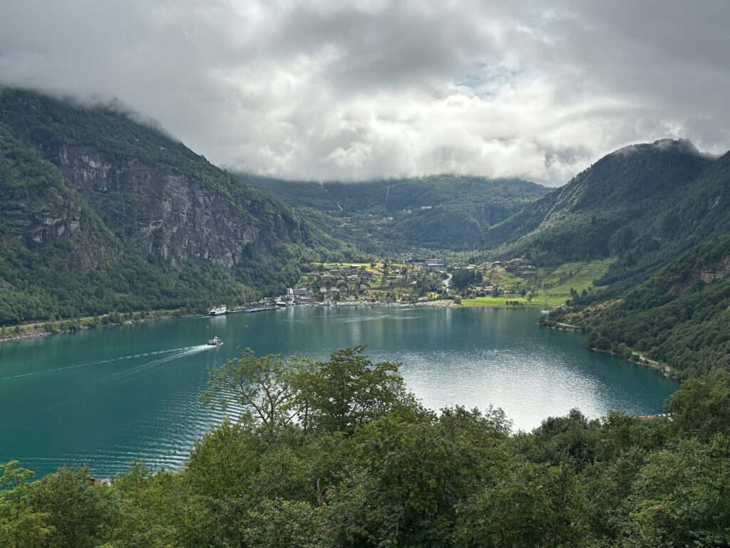 On a des vues sur le village de Geiranger, sur notre camping au pied de la route en lacets et sur les eaux bleues du fjord avec le ballet des bateaux et ferries. Les nuages enveloppent les sommets, apportant une touche mystérieuse aux paysages.