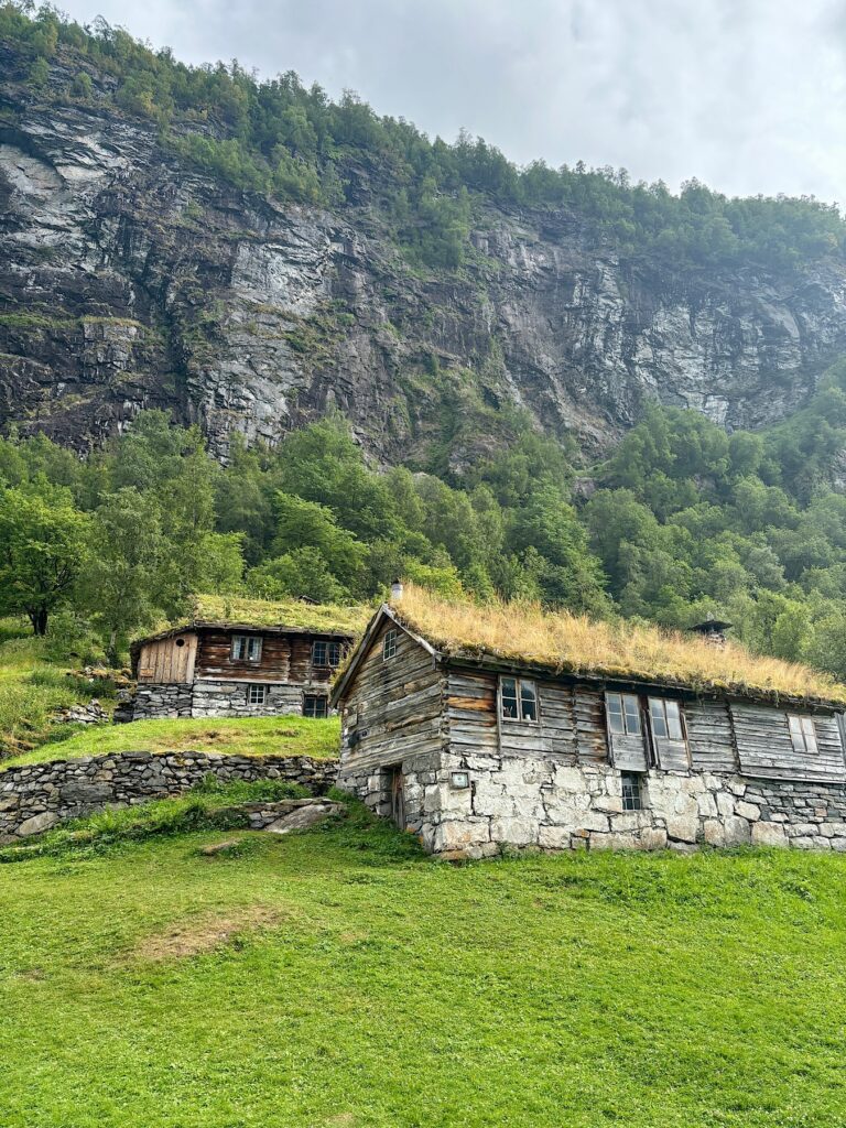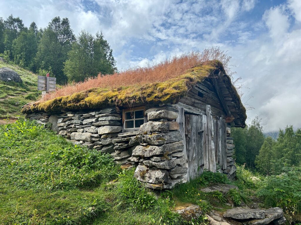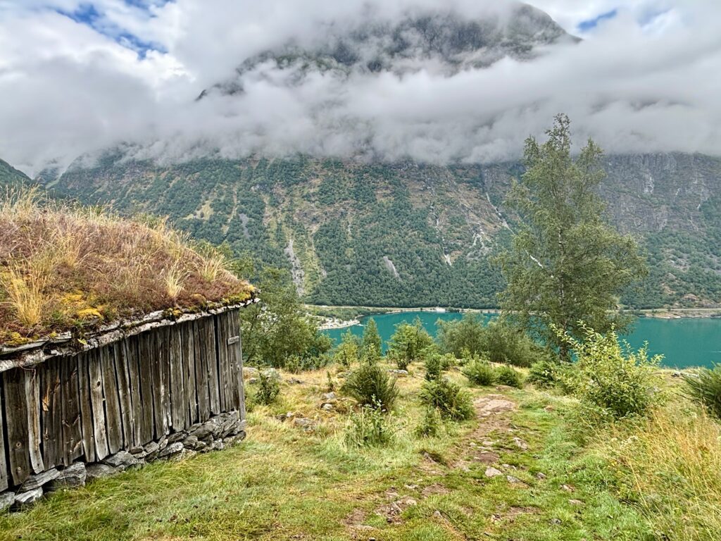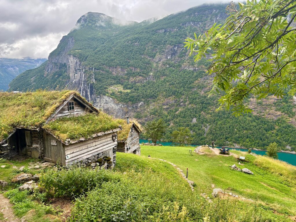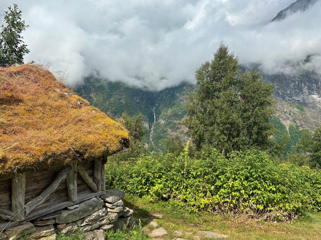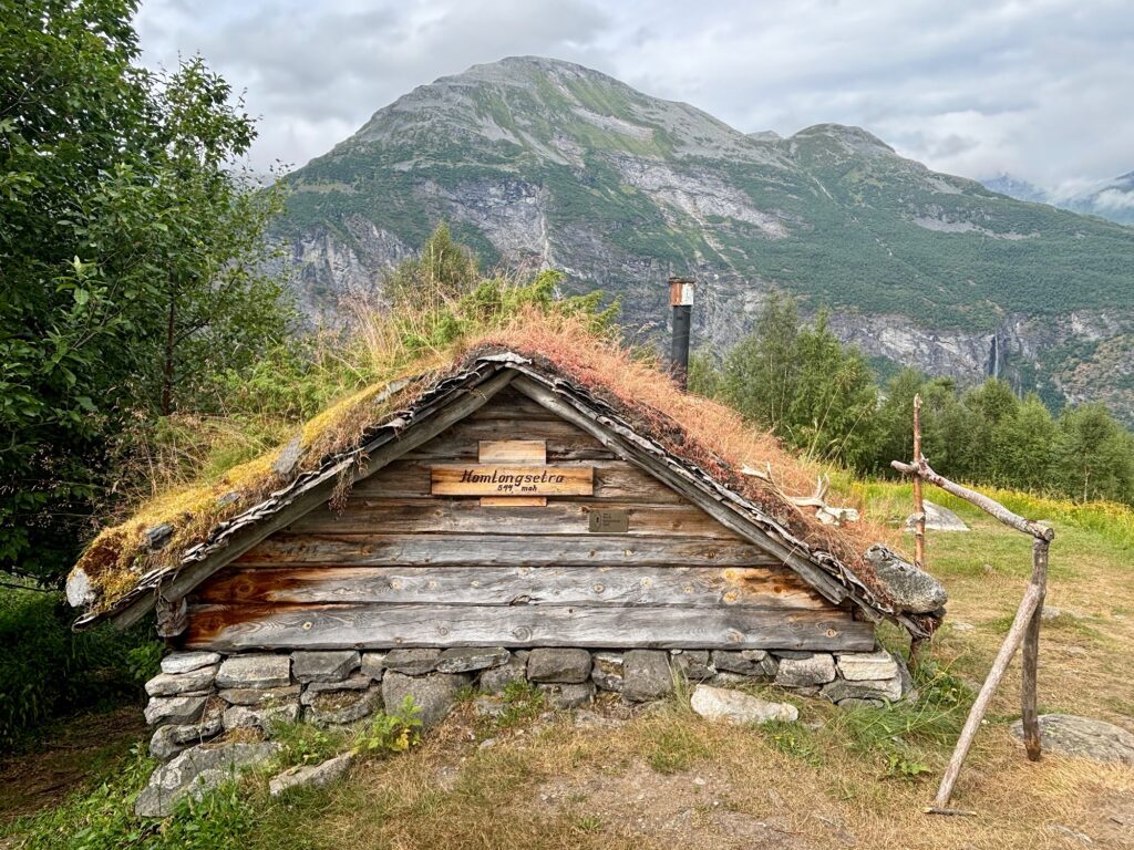 On arrive à Homelongsaetra, une ancienne ferme d’alpage à 544 mètres d’altitude au-dessus du Geirangerfjord. Une pause s’impose !