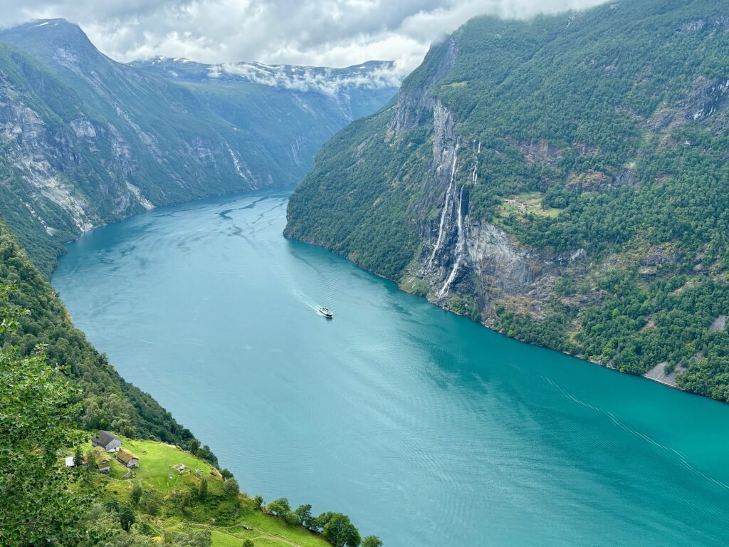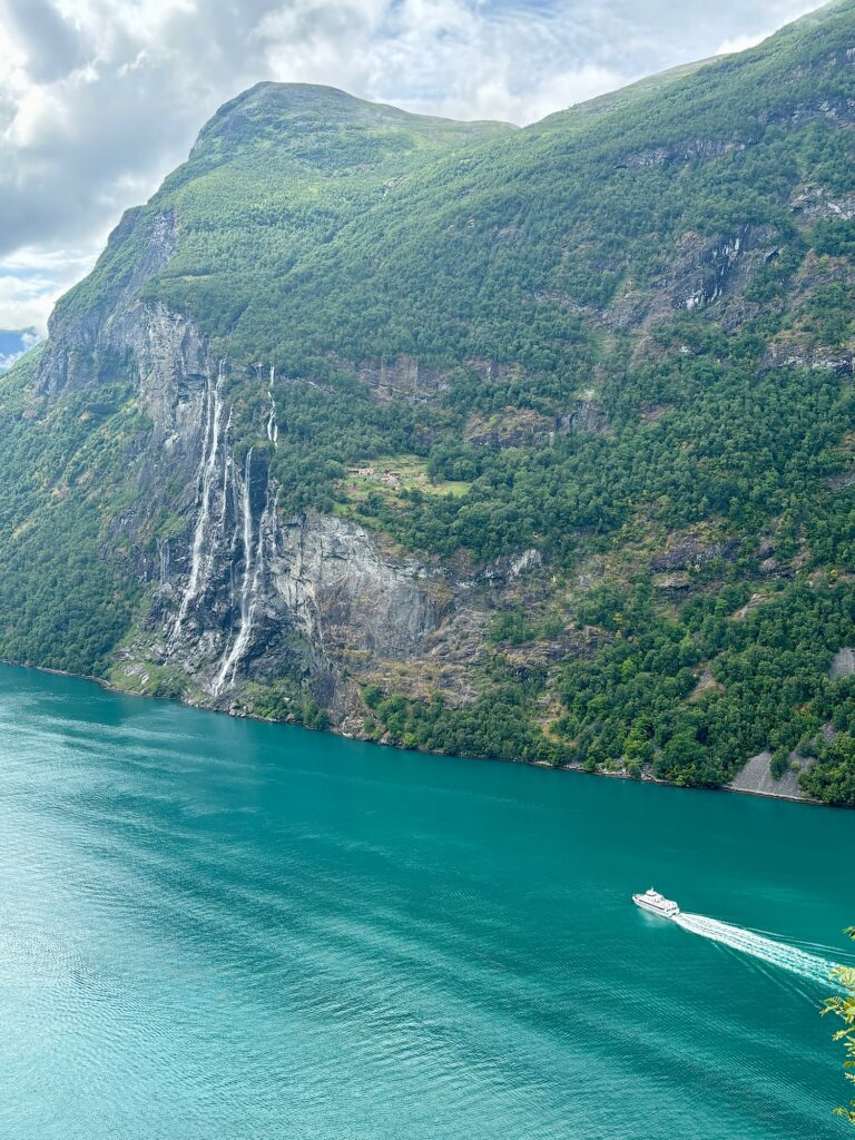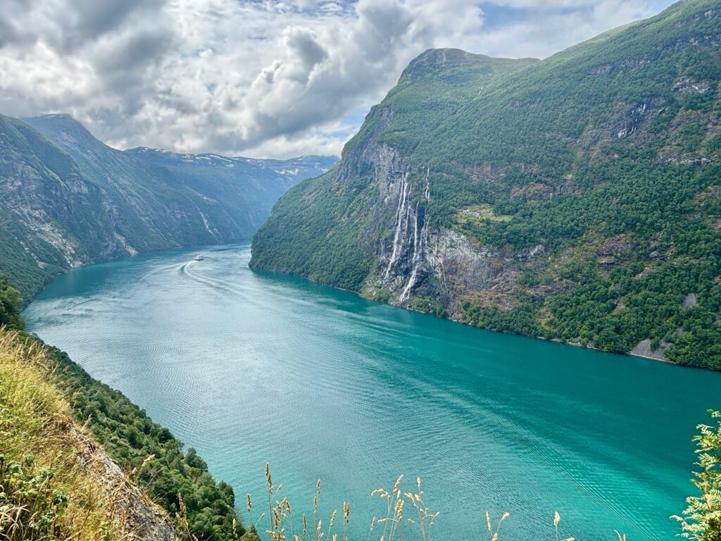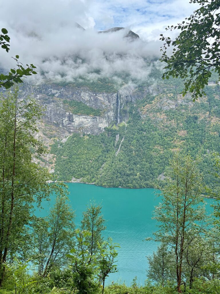 Un peu après Homelongsaetra, le panorama sur le fjord et la cascade des « sept sœurs » est splendide. Malgré les nuages, l’eau est d’un bleu vif magnifique.