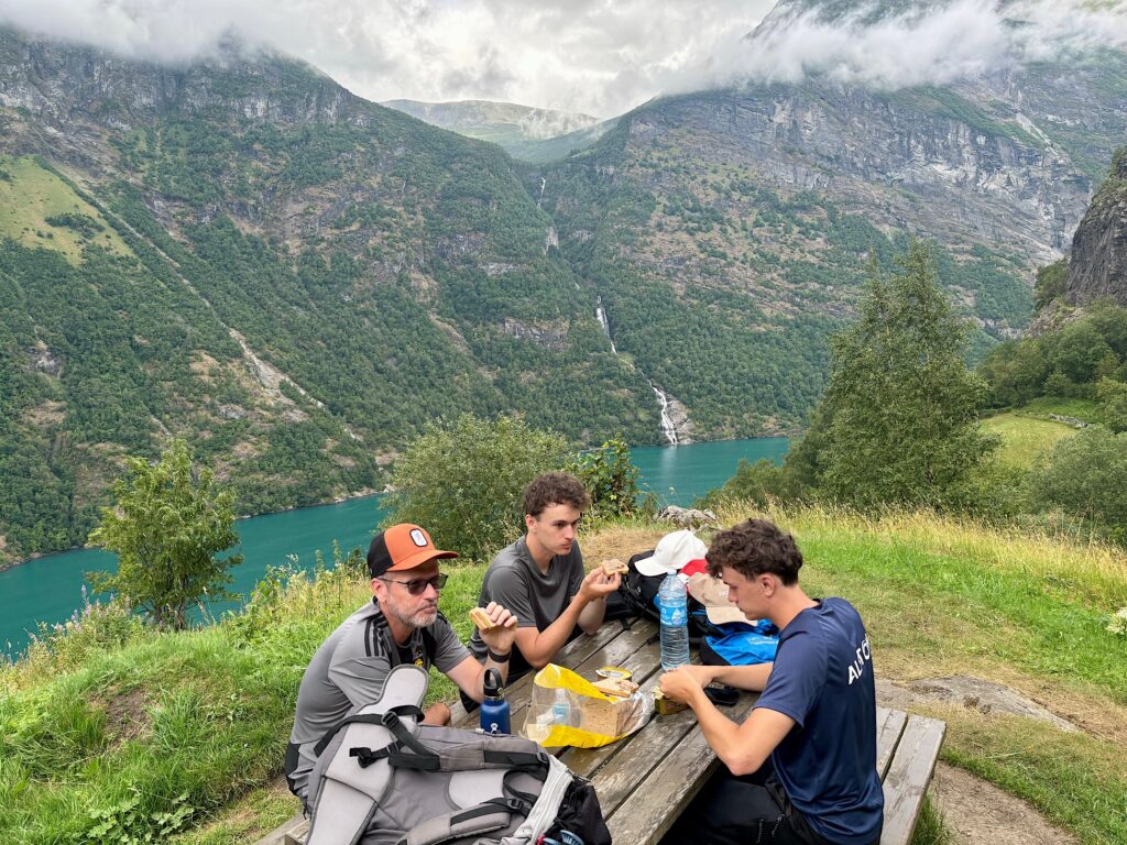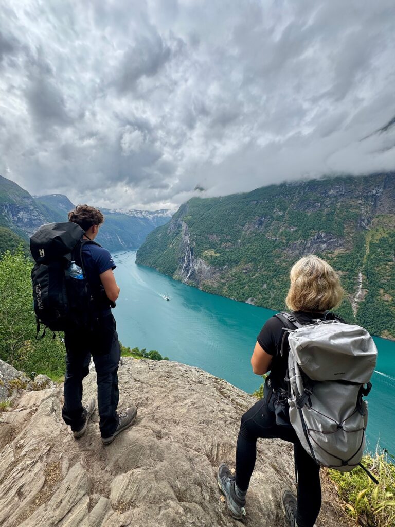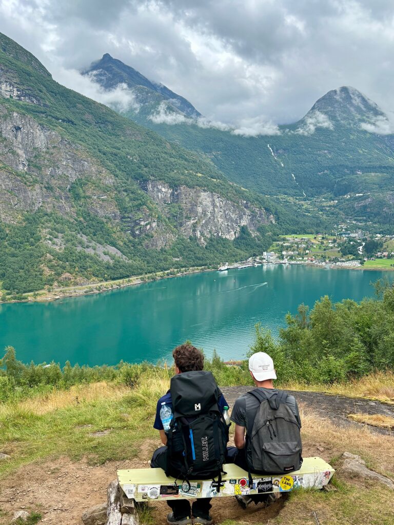 Après un petit conseil de famille, on décide de faire la rando en aller-retour depuis Geiranger. D’après AllTrails c’est 8,2 km, 944 mètres de dénivelé positif (oh m’y god !!!) et 4h45 de marche. J’ai un doute sur la durée qui me paraît sous-estimée mais on se lance. Pour s’éviter quelques kilomètres entre le camping et Geiranger, on tente de se rapprocher du départ de la randonnée et on réussit à se garer le long de la route après le bourg.